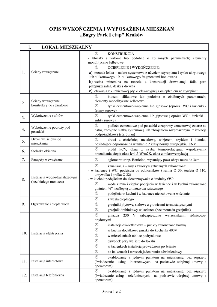 OPIS WYKOŃCZENIA I WYPOSAŻENIA MIESZKAŃ „Bagry Park I etap” Kraków I. LOKAL MIESZKALNY 1. Ściany zewnętrzne 2. Ściany wewnętrzne konstrukcyjne i działowe KONSTRUKCJA - bloczki silikatowe lub podobne o zbliżonych parametrach; elementy monolityczne żelbetowe OCIEPLENIE I WYKOŃCZENIE: a) metoda lekka – mokra systemowa z użyciem styropianu i tynku akrylowego lub silikonowego lub silikatowego fragmentami boniowana b) wełna mineralna na ruszcie z konstrukcji drewnianej, folia paro przepuszczalna, deski z drewna c) elewacja z klinkierowej płytki elewacyjnej z ociepleniem ze styropianu 3. Wykończenie sufitów 4. Wykończenie podłoży pod posadzki 5. Drzwi wejściowe do mieszkania 6. Stolarka okienna 7. Parapety wewnętrzne 8. Instalacja wodno-kanalizacyjna (bez białego montażu) 9. Ogrzewanie i ciepła woda 10. Instalacja elektryczna 11. Instalacja internetowa 12. Instalacja telefoniczna bloczki silikatowe lub podobne o zbliżonych parametrach; elementy monolityczne żelbetowe tynki cementowo-wapienne lub gipsowe (oprócz WC i łazienki ściany surowe) tynki cementowo-wapienne lub gipsowe ( oprócz WC i łazienki – sufity surowe) podłoża cementowe pod posadzki z zaprawy cementowej zatarte na ostro, zbrojone siatką systemową lub zbrojeniem rozproszonym z izolacją podposadzkową (styropian) drzwi z ościeżnicą metalową, wizjerem, szyldem i klamką, posiadające odporność na włamanie 2 klasy normy europejskiej ENV profil PCV, okna z szybą termoizolacyjną, współczynnik przenikania ciepła okna k=1.3 W/m2K, okna z mikrowentylacją aglomarmur np. Botticino, wysunięty poza obrys muru do 3cm z węzła cieplnego grzejniki płytowe, stalowe z głowicami termostatycznymi grzejnik drabinkowy w łazience (bez montażu grzejnika) kanalizacja – rury z tworzyw sztucznych zakończona: - w łazience i WC: podejścia do odbiorników (wanna Ø 50, toaleta Ø 110, umywalka i pralka Ø 32) - w kuchni: podejściem do zlewozmywaka o średnicy Ø50 woda zimna i ciepła: podejścia w łazience i w kuchni zakończone gwintem ½” i zaślepką z tworzywa sztucznego podejścia w kuchni i w łazience nie zakuwane w ścianie gniazda 230 V zabezpieczone wyłącznikami prądowymi instalacja oświetleniowa – punkty zakończone kostką w kuchni dodatkowo puszka do kuchenki 400V w mieszkaniach tablice podtynkowe dzwonek przy wejściu do lokalu w łazienkach instalacja prowadzona po ścianie na balkonach i tarasach jeden punkt oświetleniowy okablowanie (świadczenie usług operatorem), okablowanie (świadczenie usług operatorem), Strona 1 z 2 różnicowo- z jednym punktem na mieszkanie, bez osprzętu internetowych na podstawie odrębnej umowy z z jednym punktem na mieszkanie, bez osprzętu telefonicznych na podstawie odrębnej umowy z 13. 14. 1 gniazdo TV cyfrowej naziemnej, okablowanie z jednym punktem na mieszkanie satelitarnej, bez osprzętu (świadczenie usług telewizyjnych odrębnej umowy z operatorem), okablowanie z jednym punktem na mieszkanie kablowej, bez osprzętu (świadczenie usług telewizyjnych odrębnej umowy z operatorem), Instalacja telewizyjna Instalacja domofonowa Tarasy nad garażami dla telewizji na podstawie dla telewizji na podstawie aparat naścienny posadzka z kostki lub płyt betonowych lub posadzka z desek i legarów impregnowanych tereny zielone na stropach garażowych budynków typu A 15. 16. płytki i cokoliki gresowe, mrozoodporne lub posadzka z desek i legarów impregnowanych balustrady stalowe malowane proszkowo lub balustrady stalowe malowane proszkowo z wypełnieniem szkłem bezpiecznym Balkony II. GARAŻ/ SCHOWKI/KOMÓRKI LOKATORSKIE 1. Ściany zewnętrzne żelbetowe monolityczne lub silikatowe 2. Ściany wewnętrzne żelbetowe monolityczne lub silikatowe 3. Płyta posadzkowa 4. Strop nad parterem posadzka betonowa przemysłowa utwardzona powierzchniowo żelbetowy monolityczny, docieplony na parterze w obrębie pomieszczeń Pomieszczenia techniczne posadzka betonowa przemysłowa utwardzona powierzchniowo lub płytki ogrzewanych 1 piętra 5. gresowe mrozoodporne lub wylewka cementowa zatarta na ostro drzwi do pomieszczeń technicznych systemowe wydzielone ściankami działowymi nietynkowane, z drzwiami lub 6. rozwiązanie systemowe modułowe Komórki lokatorskie/ schowki/ zaplecza postojowe posadzka betonowa przemysłowa utwardzona powierzchniowo lub płytki Instalacje w 7 gresowe mrozoodporne lub wylewka cementowa zatarta na ostro wentylacja mechaniczna garażu instalacja ewakuacyjnego wentylacja mechaniczna oświetlenia podstawowego, awaryjnego III. KOMUNIKACJA WEWNĘTRZNA - KLATKI SCHODOWE 1. Ściany wewnętrzne i sufity 2. Spoczniki, schody tynk ciepłochronny lub metoda lekka-mokra z użyciem wełny malowanie farbą akrylową płytki gresowe 3. Instalacja oświetleniowa oświetlenie i osprzęt dostosowany do wymogów oświetlenia schodowego W przypadku trudności w nabyciu danego rodzaju materiału, może być zastosowany materiał zastępczy o porównywalnej jakości. Strona 2 z 2 i