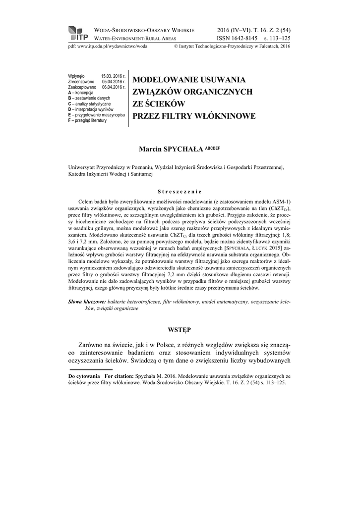 WODA-ŚRODOWISKO-OBSZARY WIEJSKIE WATER-ENVIRONMENT-RURAL AREAS pdf: www.itp.edu.pl/wydawnictwo/woda Wpłynęło 15.03. 2016 r. Zrecenzowano 05.04.2016 r. Zaakceptowano 06.04.2016 r. A – koncepcja B – zestawienie danych C – analizy statystyczne D – interpretacja wyników E – przygotowanie maszynopisu F – przegląd literatury 2016 (IV–VI). T. 16. Z. 2 (54) ISSN 1642-8145 s. 113–125 © Instytut Technologiczno-Przyrodniczy w Falentach, 2016 MODELOWANIE USUWANIA ZWIĄZKÓW ORGANICZNYCH ZE ŚCIEKÓW PRZEZ FILTRY WŁÓKNINOWE Marcin SPYCHAŁA ABCDEF Uniwersytet Przyrodniczy w Poznaniu, Wydział Inżynierii Środowiska i Gospodarki Przestrzennej, Katedra Inżynierii Wodnej i Sanitarnej Streszczenie Celem badań było zweryfikowanie możliwości modelowania (z zastosowaniem modelu ASM-1) usuwania związków organicznych, wyrażonych jako chemiczne zapotrzebowanie na tlen (ChZTCr), przez filtry włókninowe, ze szczególnym uwzględnieniem ich grubości. Przyjęto założenie, że procesy biochemiczne zachodzące na filtrach podczas przepływu ścieków podczyszczonych wcześniej w osadniku gnilnym, można modelować jako szereg reaktorów przepływowych z idealnym wymieszaniem. Modelowano skuteczność usuwania ChZTCr dla trzech grubości włókniny filtracyjnej: 1,8; 3,6 i 7,2 mm. Założono, że za pomocą powyższego modelu, będzie można zidentyfikować czynniki warunkujące obserwowaną wcześniej w ramach badań empirycznych [SPYCHAŁA, ŁUCYK 2015] zależność wpływu grubości warstwy filtracyjnej na efektywność usuwania substratu organicznego. Obliczenia modelowe wykazały, że potraktowanie warstwy filtracyjnej jako szeregu reaktorów z idealnym wymieszaniem zadowalająco odzwierciedla skuteczność usuwania zanieczyszczeń organicznych przez filtry o grubości warstwy filtracyjnej 7,2 mm dzięki stosunkowo długiemu czasowi retencji. Modelowanie nie dało zadowalających wyników w przypadku filtrów o mniejszej grubości warstwy filtracyjnej, czego główną przyczyną były krótkie średnie czasy przetrzymania ścieków. Słowa kluczowe: bakterie heterotroficzne, filtr włókninowy, model matematyczny, oczyszczanie ścieków, związki organiczne WSTĘP Zarówno na świecie, jak i w Polsce, z różnych względów zwiększa się znacząco zainteresowanie badaniem oraz stosowaniem indywidualnych systemów oczyszczania ścieków. Świadczą o tym dane o zwiększeniu liczby wybudowanych Do cytowania For citation: Spychała M. 2016. Modelowanie usuwania związków organicznych ze ścieków przez filtry włókninowe. Woda-Środowisko-Obszary Wiejskie. T. 16. Z. 2 (54) s. 113–125. 114 Woda-Środowisko-Obszary Wiejskie. T. 16. Z. 2 (54) (zgłoszonych) oczyszczalni przydomowych (rocznie od ok. 6% [PIASECKI, JURASZ 2015] do nawet 30% [BŁAŻEJEWSKI 2012] w zależności od regionu naszego kraju oraz innych uwarunkowań geograficznych, społecznych i ekonomicznych). Jednym z obiecujących, zdaniem autora, systemów są filtry włókninowe, będące specyficznym przypadkiem reaktorów, w których wykorzystuje się biomasę utwierdzoną. Różne właściwości fizyczne i biochemiczne biomasy występującej w systemach oczyszczania ścieków są istotne dla skuteczności usuwania zanieczyszczeń (poboru substancji pokarmowych). Szybkość wchłaniania substancji rozpuszczonych zachodzi na drodze dyfuzji i jest związana między innymi z polem powierzchni, na której występuje. Powierzchnia właściwa utwierdzonej biomasy zależy od wielu czynników. Bardzo ważnym parametrem jest mikrostruktura powierzchni biofilmu. Szczególnym przypadkiem jest biomasa (mieszanina żywych organizmów i cząstek stałych pochodzących ze ścieków), znajdująca się wewnątrz filtra włókninowego. W ramach wcześniejszych badań zaobserwowano [SPYCHAŁA i in. 2013], że nie ma ona formy ciągłej warstwy ‒ filmu (biofilmu), ale kształt ziaren (granulek). Oznacza to, że fizycznie (geometrycznie) i funkcjonalnie nie ma ścisłego związku z powierzchnią podłoża (pole powierzchni włókien). Średni rozmiar granulek biomasy wewnątrz włókniny filtracyjnej waha się w dość szerokim zakresie i wynosi od kilku do kilkudziesięciu mikrometrów [SPYCHAŁA i in. 2013; SPYCHAŁA, SOWIŃSKA 2015]. Rozmiar poniżej 100 µm jest powszechnie obserwowany, np. w konwencjonalnych reaktorach z osadem czynnym – między 63 a 126 µm [PENG i in. 2012] i w reaktorach ze złożem ruchomym (MBR) – od 36 do 49 µm [LOUSADA-FERREIRA i in. 2011]. Zjawisko to może mieć związek z unikaniem przez aglomeraty bakteryjne ograniczenia dyfuzyjnego, co wskazywali PÉREZ i in. [2005] dla osadu granulowanego poddanego flokulacji (wpływ dyfuzji na absorpcję substratu znikomy dla kłaczków mniejszych niż 100 µm). W związku z tym zastosowanie podejścia modelowego, stosowanego dla osadu czynnego do określonego rodzaju biomasy utwierdzonej (w formie ziarnistej) wydaje się być uzasadnione. Istnieją pewne podobieństwa między warunkami towarzyszącymi granulkom biomasy we włókninie filtracyjnej i kłaczkom osadu czynnego ‒ są to: stosunkowo dobra dostępność do substratu i wystarczająca dostępność tlenu. Warunki te, w przypadku biomasy filtrów włókninowych, uzyskuje się dzięki powolnemu przepływowi substratu między cząstkami biomasy i intensywnemu dostępowi powietrza atmosferycznego [SPYCHAŁA, ŁUCYK 2015; SPYCHAŁA, SOWIŃSKA 2015]. W wielu modelach dla biomasy utwierdzonej (biofilmu) wykorzystuje się równania Monoda, jako opisujące przemiany biochemiczne [HENZE, HARREMOES 2000]. Większość istniejących modeli wykorzystuje współczynniki wyznaczone doświadczalnie i opisujące populacje pojedynczych gatunków, a znacznie mniej sza liczba modeli bierze pod uwagę konkurencję międzygatunkową [SHAFAHI, VAFAI 2009]. © ITP Woda Środ. Obsz. Wiej. 2016 (IV–VI). T. 16. Z. 2 (54) Spychała M.: Modelowanie usuwania związków organicznych ze ścieków… 115 Ważnym zagadnieniem 