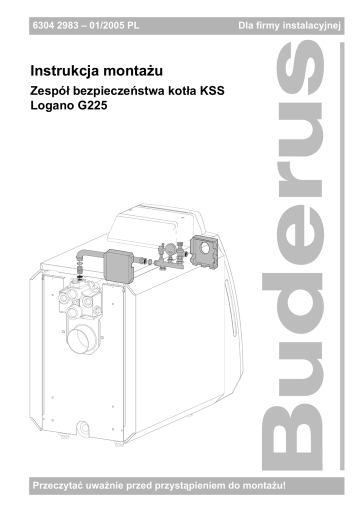 6304 2983 – 01/2005 PL Dla firmy instalacyjnej Instrukcja montażu Zespół bezpieczeństwa kotła KSS Logano G225 Przeczytać uważnie przed przystąpieniem do montażu! Montaż zespołu bezpieczeństwa kotła KSS Montaż zespołu bezpieczeństwa kotła KSS Należy używać tylko oryginalnych części zamiennych firmy Buderus. Buderus nie ponosi odpowiedzialności za szkody powstałe w wyniku stosowania części zamiennych innych producentów. WSKAZÓWKA PRAKTYCZNA Podczas montażu i eksploatacji instalacji grzewczej należy przestrzegać przepisów i norm krajowych! Zastosowanie zgodne z przeznaczeniem Zespół bezpieczeństwa kotła KSS przeznaczony jest do przyłączenia do kotła grzewczego Logano G225. Uszczelki Uszczelki używane do montażu poszczególnych komponentów załączone są do poszczególnych urządzeń. Montaż zespołu bezpieczeństwa kotła KSS z Usunąć pokrywę z tworzywa sztucznego (zaślepkę) obok tulei zanurzeniowej na kształtce przyłączeniowej. z Włożyć pierścień samouszczelniający (2) w rowek złączki redukcyjnej (3). z Wkręcić złączkę redukcyjną (3) do przyłącza zespołu bezpieczeństwa (1). z Do nakrętki kołpakowej na krótkim ramieniu rury zasilania (5) włożyć uszczelkę (4). 5 2 3 9 10 8 4 1 7 z Luźno skręcić rurę przyłączeniową (5) ze złączką redukcyjną (3). 6 z Do nakrętki kołpakowej na długim ramieniu rury zasilania (5) włożyć uszczelkę (4). z Luźno przykręcić obsadę armatury (7) do rury przyłączeniowej (5). z Zespół bezpieczeństwa kotła ustawić pionowo i równolegle do tylnej ścianki kotła grzewczego, następnie dociągnąć wszystkie śrubunki. z Dobrze dokręcić śrubunki kluczem widełkowym, wykonując dodatkowo 1/8 obrotu (odpowiada to momentowi dokręcania 60 Nm). z Sprawdzić, czy zaślepka (6) z uszczelką (4) u dołu obsady armatury (7) jest dobrze dokręcona. 8 Rys. 1 Montaż zespołu bezpieczeństwa kotła Poz. 1: Przyłącze zespołu bezpieczeństwa Poz. 2: Pierścień samouszczelniający Ø 28 × 3 Poz. 3: Złączka redukcyjna G 1 × G ¾ Poz. 4: Uszczelka Ø 24 × 30,5 × 2 Poz. 5: Rura przyłączeniowa G 1 Poz. 6: Zaślepka G 1 Poz. 7: Obsada armatury Poz. 8: Osłona termoizolacyjna Poz. 9: Manometr Poz. 10: Zawór bezpieczeństwa Zastrzega się możliwość wprowadzenia zmian w związku z ulepszeniami technicznymi! 2 Instrukcja montażu • Zespół bezpieczeństwa kotła KSS • Wydanie 01/2005 Montaż zespołu bezpieczeństwa kotła KSS WSKAZÓWKA PRAKTYCZNA Jeżeli trzeba przekręcić manometr (9) w celu lepszej widoczności lub zawór bezpieczeństwa (10) w celu instalacji lub wymiany, należy przestrzegać następujących wskazówek: z Manometr oraz zawór bezpieczeństwa są uszczelnione pierścieniem uszczelniającym PTFE. z Obracać można tylko w kierunku ruchu wskazówek zegara. z Jeżeli zostanie wymontowany zawór bezpieczeństwa, należy przekręcić manometr o 90° w kierunku ruchu wskazówek zegara. Po wymianie ponownie należy przekręcić manometr w kierunku ruchu wskazówek zegara do pozycji odczytu. z Przeprowadzić próbę szczelności instalacji. z Wyciąć osłony termoizolacyjne (8) w miejscach przyłączy, np. przy zaworze bezpieczeństwa. Wczepić osłony od góry jedna w drugą i następnie ścisnąć od dołu. z Zainstalować przewód wydmuchowy zaworu bezpieczeństwa (nie znajduje się w zakresie dostawy) (10). Zastrzega się możliwość wprowadzenia zmian w związku z ulepszeniami technicznymi! Instrukcja montażu • Zespół bezpieczeństwa kotła KSS • Wydanie 01/2005 3 Autoryzowany Partner Handlowy: BBT Thermotechnik GmbH, D-35573 Wetzlar www.heiztechnik.buderus.de [email protected]