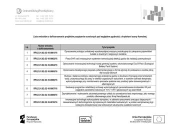 ul. Moniuszki7/9 90-101 Łódź www.cop.lodzkie.pl tel. /+42/ 230 15 50 fax /+42/ 230 15 51 [email protected] Lista wniosków o dofinansowanie projektów pozytywnie ocenionych pod względem zgodności z kryteriami oceny formalnej Lp. Numer wniosku o dofinansowanie Tytuł projektu 1 RPLD.01.02.02-10-0001/16 Opracowanie prototypu unikatowej wysokowydajnej maszyny produkcyjnej do zakręcania pojemników/ butelek o dowolnym/ nietypowym kształcie 2 RPLD.01.02.02-10-0002/16 Prace B+R nad innowacyjnym systemem termowizyjnej detekcji gazów dla instalacji przemysłowych 3 RPLD.01.02.02-10-0004/16 Opracowanie innowacyjnej technologii nowej generacji systemu akumulatorowego Eco B-Pack (Ecological Battery Pack System) 4 RPLD.01.02.02-10-0005/16 5 RPLD.01.02.02-10-0006/16 6 RPLD.01.02.02-10-0007/16 7 RPLD.01.02.02-10-0009/16 8 RPLD.01.02.02-10-0010/16 Opracowanie bioaktywnego preparatu pofermentacyjnego w formie płynnej do podawania w wodzie pitnej dla kurcząt rzeźnych Budowa i badania prototypu stacjonarnego analizatora gazów w obudowie chroniącej przed wnikaniem wody, przeznaczonego do pracy w strefach zagrożonych wybuchem, w szerokim zakresie temperatur, wykorzystywanego przy monitorowaniu procesów spalania oraz produkcji paliw konwencjonalnych i alternatywnych Ewaluacja programów rehabilitacji ruchowej wykorzystujących personalizowane środowisko VR pod względem parametrów ilościowych T-HI, T-VHI i jakościowych wg skali SSeS Zaprojektowanie i wytworzenie zautomatyzowanego układu do prowadzenia testu wapniowego, jako nowego produktu oferowanego przez firmę NanoSpaceLab Innowacyjne technologie wykorzystania styropianu, w zakresie opracowania znacząco ulepszonych i zaawansowanych technologicznie styropianowych materiałów budowlanych, w postaci wentylowanej płyty izolacyjno-dociepleniowej oraz izolowanych akustycznie pustaków ściennych 9 RPLD.01.02.02-10-0012/16 Wykorzystanie innowacyjnych tranzystorów SiC oraz zastosowanie chłodzenia cieczowego w aparaturze pojazdów komunikacji miejskiej i infrastrukturze obsługowej 10 RPLD.01.02.02-10-0013/16 Opracowanie rozwiązań metodycznych, funkcjonalnych i technologicznych na potrzeby systemu typu Marketing Automation zgodnego z koncepcją Omnichannel Marketing 11 RPLD.01.02.02-10-0015/16 Opracowanie innowacyjnych mechanizmów wspierających zaangażowanie i motywację użytkowników platformy e-learningowej LearnWay 12 RPLD.01.02.02-10-0016/16 „ADD-VALUE” Nowy Adserwer oparty na rozszerzonych źródłach danych generujący wartość dodaną w biznesie 13 RPLD.01.02.02-10-0017/16 14 RPLD.01.02.02-10-0019/16 15 RPLD.01.02.02-10-0020/16 16 RPLD.01.02.02-10-0022/16 17 RPLD.01.02.02-10-0023/16 Rodzina multifunkcyjnych maszyn rolniczych do uprawy uproszczonej 18 RPLD.01.02.02-10-0026/16 Opracowanie innowacyjnego rozwiązania IT z zastosowaniem rzeczywistości wirtualnej (Symulatora VR) do wspierania terapii lęków społecznych oraz podnoszenia kompetencji społecznych 19 RPLD.01.02.02-10-0027/16 Innowacyjny system informatyczny do obsługi małego lotnictwa cywilnego typu CAMO 20 RPLD.01.02.02-10-0028/16 Badania metod optymalizacji zagadnień VRP 21 RPLD.01.02.02-10-0029/16 Prace badawczo-rozwojowe nad unikatowym systemem do automatycznej inwentaryzacji środków trwałych 22 RPLD.01.02.02-10-0030/16 Prace badawczo rozwojowe nad idealnym strojem treningowym dla tancerek WIESIO – Wielowymiarowy Innowacyjny Ekspercki System Informacji o Otoczeniu, wykorzystujący technologie zbliżeniowe Przeprowadzenie przez Trimen Chemicals S.A. badań przemysłowych i prac rozwojowych w zakresie opracowania syntezy optycznie czystych aminokwasów metodą asymetrycznego uwodornienia aminoakrylanów Mobilny, Ekologiczny System Transportowy –MEST innowacyjny system monitorowania stanu zespołu jezdnego i nacisku na osie dla naczep samochodów ciężarowych, poprawiający bezpieczeństwo w transporcie drogowym Przeprowadzenie prac badawczo rozwojowych przez LIW Care Technology celem opracowania systemu siedzisk ortopedycznych w szczególności dla dzieci i młodzieży z porażeniami i niedowładami trzy lub czterokończynowymi oraz przy porażeniach dwukończynowych jednostronnych lub skrzyżowanych 23 RPLD.01.02.02-10-0033/16 Opracowanie innowacyjnych leków generycznych przeciw schorzeniom o wysokiej częstości zachorowań 24 RPLD.01.02.02-10-0035/16 System autonomicznej nawigacji dronów 25 RPLD.01.02.02-10-0036/16 26 RPLD.01.02.02-10-0037/16 27 RPLD.01.02.02-10-0039/16 Badania i prace rozwojowe służące powstaniu udoskonalonego produktu w postaci paliwa stosowanego w energetyce – biomasa o optymalnych parametrach spalania 28 RPLD.01.02.02-10-0042/16 Opracowanie nowej receptury żeli światłoutwardzalnych 29 RPLD.01.02.02-10-0043/16 Opracowanie rozwiązania technologicznego dla suszenia zróżnicowanych strumieni mokrej biomasy – prace badawczo – rozwojowe w przedsiębiorstwie Eko - Max 30 RPLD.01.02.02-10-0044/16 Opracowanie innowacyjnej technologii modelowania oraz automatyzacji konfiguracji infrastruktury ICT RPLD.01.02.02-10-0049/16 Opracowanie procesu gięcia parapetów PCV dla okien nietypowych przez firmę P.H.U. ROTA Przemysław Taraska 32 RPLD.01.02.02-10-0052/16 Stworzenie platformy technologicznej WHC wspierającej realizację zarządzania procesowego w ochronie zdrowia 33 RPLD.01.02.02-10-0054/16 34 RPLD.01.02.02-10-0055/16 35 RPLD.01.02.02-10-0056/16 IKK – Innowacyjne Krzesło Kardiologiczne 36 RPLD.01.02.02-10-0057/16 Badanie przemysłowe i prace rozwojowe nad inteligentnym systemem kontroli procesów 31 Hydrozagadka – przeprowadzenie badań przemysłowych i eksperymentalnych prac rozwojowych w celu opracowania nowych materiałów hydrofobizujących, superhydrofobizujących i oleofobizujących powierzchnie różnego typu Opracowanie nowoczesnego mechanizmu nawigacji w oparciu o innowacyjny algorytm na potrzeby zastosowania wirtualnej rzeczywistości (VR) w grach mobilnych STERCUS innowacyjna instalacja do produkcji e