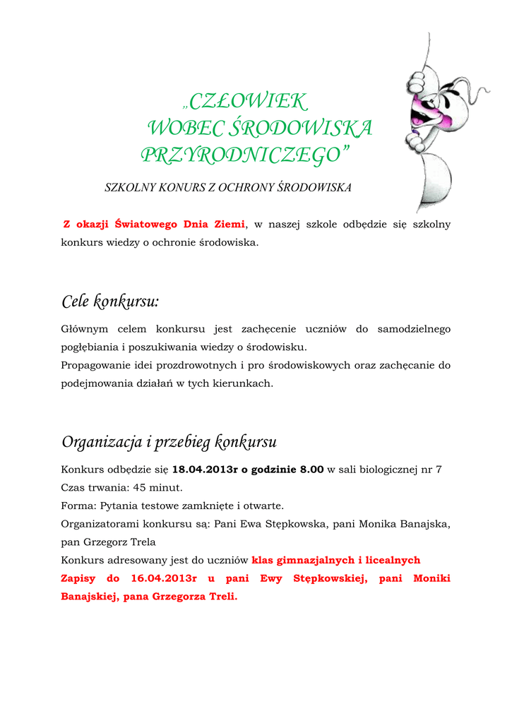 CZŁOWIEK WOBEC ŚRODOWISKA PRZYRODNICZEGO” ,, SZKOLNY KONURS Z OCHRONY ŚRODOWISKA Z okazji Światowego Dnia Ziemi, w naszej szkole odbędzie się szkolny konkurs wiedzy o ochronie środowiska. Cele konkursu: Głównym celem konkursu jest zachęcenie uczniów do samodzielnego pogłębiania i poszukiwania wiedzy o środowisku. Propagowanie idei prozdrowotnych i pro środowiskowych oraz zachęcanie do podejmowania działań w tych kierunkach. Organizacja i przebieg konkursu Konkurs odbędzie się 18.04.2013r o godzinie 8.00 w sali biologicznej nr 7 Czas trwania: 45 minut. Forma: Pytania testowe zamknięte i otwarte. Organizatorami konkursu są: Pani Ewa Stępkowska, pani Monika Banajska, pan Grzegorz Trela Konkurs adresowany jest do uczniów klas gimnazjalnych i licealnych Zapisy do 16.04.2013r u pani Banajskiej, pana Grzegorza Treli. Ewy Stępkowskiej, pani Moniki Zagadnienia  Charakterystyka głównych zanieczyszczeń powietrza atmosferycznego.  Niekorzystne zjawiska związane z zanieczyszczeniami powietrza atmosferycznego i ich zapobieganie (kwaśne deszcze, smog, efekt cieplarniany, dziura ozonowa)  Zanieczyszczenie wód, gleby i ich ochrona  Wpływ chemizacji środowiska na zdrowie człowieka,  Rodzaje zasobów przyrody.  Rolnictwo zrównoważone.  Formy ochrony przyrody (ochrona gatunkowa, indywidualna, biocenotyczna)  Przykłady racjonalnego gospodarowania zasobami przyrody, w tym wykorzystanie alternatywnych źródeł energii.  Wykazać wpływ występowania zasobów naturalnych na działalność gospodarczą człowieka.  Przedstawić konsekwencje pozyskiwania i wykorzystywania zasobów naturalnych. Proponowana literatura        W. Lewiński „Biologia” cz. 2 wyd. Operon Solomon, Berg, Martin, Villee – „Biologia” wyd. Mulico Oficyna Wydawnicza B.Bukała „Ekologia z biogeografią i ochroną środowiska” wyd. Omega B.Sągin "Puls życia 3" podręcznik dla gimnazjum http://www.mos.gov.pl/ http://chronmyprzyrode.pl/ http://niezabijaj.eu/