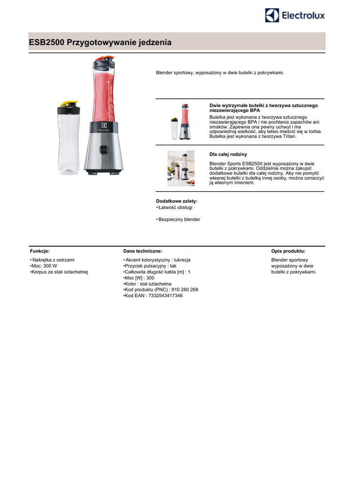 ESB2500 Przygotowywanie jedzenia Blender sportowy, wyposażony w dwie butelki z pokrywkami. Dwie wytrzymałe butelki z tworzywa sztucznego niezawierającego BPA Butelka jest wykonana z tworzywa sztucznego niezawierającego BPA i nie pochłania zapachów ani smaków. Zapewnia ona pewny uchwyt i ma odpowiednią wielkość, aby łatwo mieścić się w torbie. Butelka jest wykonana z tworzywa Tritan. Dla całej rodziny Blender Sports ESB2500 jest wyposażony w dwie butelki z pokrywkami. Oddzielnie można zakupić dodatkowe butelki dla całej rodziny. Aby nie pomylić własnej butelki z butelką innej osoby, można oznaczyć ją własnym imieniem. Dodatkowe zalety: • Łatwość obsługi • Bezpieczny blender Funkcje: Dane techniczne: Opis produktu: • Nakrętka z ostrzami •Moc: 300 W •Korpus ze stali szlachetnej • Akcent kolorystyczny : lukrecja •Przycisk pulsacyjny : tak •Całkowita długość kabla [m] : 1 •Moc [W] : 300 •Kolor : stal szlachetna •Kod produktu (PNC) : 910 280 269 •Kod EAN : 7332543417346 Blender sportowy wyposażony w dwie butelki z pokrywkami.