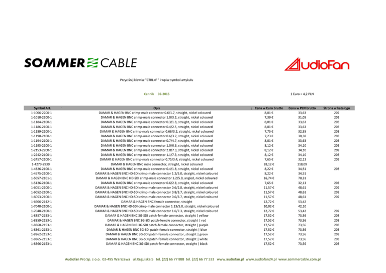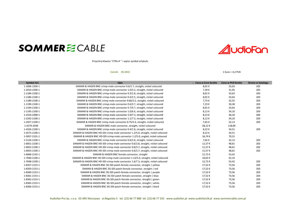 Prod.grp. 0 Prod.grp. 1 Prod.grp. 2 Prod.grp. 3 Prod.grp. 4 Prod.grp. 6 Prod.grp. 7 Please insert your VAT rate here: 23% Przyciśnij klawisz "CTRL+F " i wpisz symbol artykułu Cennik Symbol Art. Stary symbol Art. 1-1006-2200-1 1-1010-2200-1 1-1184-2100-1 1-1186-2100-1 1-1189-2100-1 1-1190-2100-1 1-1194-2100-1 1-1195-2100-1 1-2153-2200-1 1-2242-2100-1 1-2457-2100-1 1-4279-2930 1-4326-2100-1 1-4575-2100-1 1-5057-2101-1 1-5126-2100-1 1-6051-2100-1 1-6052-2100-1 1-6053-2100-1 1-6606-2142-1 1-7040-2100-1 1-7048-2100-1 1-8357-2153-1 1-8359-2153-1 1-8360-2153-1 1-8361-2153-1 1-8362-2153-1 1-8365-2153-1 1-8366-2153-1 05-2015 Opis DAMAR & HAGEN BNC crimp-male connector 0.6/1.7, straight, nickel coloured DAMAR & HAGEN BNC crimp-male connector 1.0/3.2, straight, nickel coloured DAMAR & HAGEN BNC crimp-male connector 0.3/1.8, straight, nickel coloured DAMAR & HAGEN BNC crimp-male connector 0.4/2.5, straight, nickel coloured DAMAR & HAGEN BNC crimp-male connector 0.66/3.2, straight, nickel coloured DAMAR & HAGEN BNC crimp-male connector 0.6/3.7, straight, nickel coloured DAMAR & HAGEN BNC crimp-male connector 0.7/4.7, straight, nickel coloured DAMAR & HAGEN BNC crimp-male connector 1.0/6.6, straight, nickel coloured DAMAR & HAGEN BNC crimp-male connector 2.0/7.3, straight, nickel coloured DAMAR & HAGEN BNC crimp-male connector 1.1/7.3, straight, nickel coloured DAMAR & HAGEN BNC crimp-male connector 0.75/3.4, straight, nickel coloured DAMAR & HAGEN BNC male connector, straight, nickel coloured DAMAR & HAGEN BNC crimp-male connector 0.4/1.8, straight, nickel coloured DAMAR & HAGEN BNC HD-SDI crimp-male connector 1.2/5.0, straight, nickel coloured DAMAR & HAGEN BNC HD-SDI crimp-male connector 1.2/5.0, angled, nickel coloured DAMAR & HAGEN BNC crimp-male connector 0.6/2.8, straight, nickel coloured DAMAR & HAGEN BNC HD-SDI crimp-male connector 0.6/2.8, straight, nickel coloured DAMAR & HAGEN BNC HD-SDI crimp-male connector 0.8/3.7, straight, nickel coloured DAMAR & HAGEN BNC HD-SDI crimp-male connector 0.6/3.7, straight, nickel coloured DAMAR & HAGEN BNC female connector, straight DAMAR & HAGEN BNC HD-SDI crimp-male connector 1.13/5.0, straight, nickel coloured DAMAR & HAGEN BNC HD-SDI crimp-male connector 1.6/7.3, straight, nickel coloured DAMAR & HAGEN BNC 3G-SDI patch-female connector, straight | yellow DAMAR & HAGEN BNC 3G-SDI patch-female connector, straight | red DAMAR & HAGEN BNC 3G-SDI patch-female connector, straight | purple DAMAR & HAGEN BNC 3G-SDI patch-female connector, straight | blue DAMAR & HAGEN BNC 3G-SDI patch-female connector, straight | green DAMAR & HAGEN BNC 3G-SDI patch-female connector, straight | white DAMAR & HAGEN BNC 3G-SDI patch-female connector, straight | black 1 Euro = 4,2 PLN Net price Cena w Euro brutto 8,01 € 7,39 € 8,01 € 8,01 € 7,75 € 7,23 € 8,01 € 8,12 € 8,12 € 8,12 € 7,65 € 28,12 € 8,22 € 8,22 € 16,74 € 7,65 € 11,57 € 11,57 € 11,57 € 12,72 € 10,02 € 12,72 € 17,52 € 17,52 € 17,52 € 17,52 € 17,52 € 17,52 € 17,52 € Cena w PLN brutto 33,63 31,05 33,63 33,63 32,55 30,38 33,63 34,10 34,10 34,10 32,13 118,09 34,51 34,51 70,31 32,13 48,61 48,61 48,61 53,42 42,10 53,42 73,56 73,56 73,56 73,56 73,56 73,56 73,56 Audiofan Pro Sp. z o.o. 02-495 Warszawa ul.Regulska 5 tel. (22) 66 77 888 tel. (22) 66 77 333 www.audiofan.pl www.audiofan24.pl www.sommercable.com.pl Strona w katalogu 202 202 203 203 203 203 203 203 202 203 203 203 203 202 202 202 202 203 203 203 203 203 203 203 1-8478-13100-1 1-8481-13100-1 1-8482-13100-1 1-8483-13100-1 1-8485-13100-1 100-0051-02 100-0051-04 100-0051-12+2 100-0051-16+2 100-0051-20 100-0051-24+2 100-0051-34+2 100-0051-40+2 100-0051-48+2 100-0071-08 100-0101-02 100-0101-04 100-0101-04F 100-0101-08 100-0101-08F 100-0101-12 100-0101-12F 100-0101-16 100-0101-20 100-0101-24 100-0101-32 100-0201-16 100-0201-24 100-0201-32 100-0302-02 100-0302-04 100-0302-06 100-0302-08 100-0302-12 100-0302-16 100-0351-08F 100-0351-10 100-0351-10F 100-0356-10 100-0401-08 100-0401-10F 100-0401-12 100-0401-16 100-0401-24 100-0401-32 100-0401-40 100-0401-48 DAMAR & HAGEN BNC crimp-male connector 0.6/2.8, straight, silver DAMAR & HAGEN BNC crimp-male connector 0.8/3.7, straight, silver DAMAR & HAGEN BNC crimp-male connector 1.0/4.8, straight, silver DAMAR & HAGEN BNC crimp-male connector 1.2L/5.0, straight, silver DAMAR & HAGEN BNC crimp-male connector 1.6L/7.3, straight, silver Multipair SC-Planet FMC; S-PVC; black, mat | 2 x 0,19 mm2 x number of pairs | 02 Multipair SC-Planet FMC; S-PVC; black, mat | 2 x 0,19 mm2 x number of pairs | 04 Multipair SC-Planet FMC; S-PVC; black, mat | 2 x 0,19 mm2 x number of pairs | 14 Multipair SC-Planet FMC; S-PVC; black, mat | 2 x 0,19 mm2 x number of pairs | 18 Multipair SC-Planet FMC; S-PVC; black, mat | 2 x 0,19 mm2 x number of pairs | 20 Multipair SC-Planet FMC; S-PVC; black, mat | 2 x 0,19 mm2 x number of pairs | 26 Multipair SC-Planet FMC; S-PVC; black, mat | 2 x 0,19 mm2 x number of pairs | 36 Multipair SC-Planet FMC; S-PVC; black, mat | 2 x 0,19 mm2 x number of pairs | 42 Multipair SC-Planet FMC; S-PVC; black, mat | 2 x 0,19 mm2 x number of pairs | 50 SC-Mistral FLAT; 8 x 2 x 0,11 mm2; PVC; 30 x 5,5 mm; black Multipair SC-Mistral MCF; S-PVC; black, mat | 2 x 0,22 mm2 x number of pairs | 02 | S-PVC Multipair SC-Mistral MCF; S-PVC; black, mat | 2 x 0,22 mm2 x number of pairs | 04 | S-PVC Multipair SC-Mistral MCF; S-PVC; black, mat | 2 x 0,22 mm2 x number of pairs | 04 | FRNC Multipair SC-Mistral MCF; S-PVC; black, mat | 2 x 0,22 mm2 x number of pairs | 08 | S-PVC Multipair SC-Mistral MCF; S-PVC; black, mat | 2 x 0,22 mm2 x number of pairs | 08 | FRNC Multipair SC-Mistral MCF; S-PVC; black, mat | 2 x 0,22 mm2 x number of pairs | 12 | S-PVC Multipair SC-Mistral MCF; S-PVC; black, mat | 2 x 0,22 mm2 x number of pairs | 12 | FRNC Multipair SC-Mistral MCF; S-PVC; black, mat | 2 x 0,22 mm2 x number of pairs | 16 | S-PVC Multipair SC-Mistral MCF; S-PVC; black, mat | 2 x 0,22 mm2 x num
