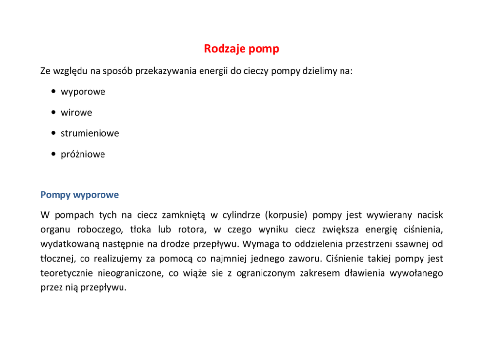 Rodzaje pomp Ze względu na sposób przekazywania energii do cieczy pompy dzielimy na: • wyporowe • wirowe • strumieniowe • próżniowe Pompy wyporowe W pompach tych na ciecz zamkniętą w cylindrze (korpusie) pompy jest wywierany nacisk organu roboczego, tłoka lub rotora, w czego wyniku ciecz zwiększa energię ciśnienia, wydatkowaną następnie na drodze przepływu. Wymaga to oddzielenia przestrzeni ssawnej od tłocznej, co realizujemy za pomocą co najmniej jednego zaworu. Ciśnienie takiej pompy jest teoretycznie nieograniczone, co wiąże sie z ograniczonym zakresem dławienia wywołanego przez nią przepływu. Pompy wyporowe dzielimy na tłokowe i rotacyjne. Pompy tłokowe realizują ruch posuwisto-zwrotny tłoka, nurnika lub membrany. Pompy wyporowe charakteryzuje wysokość ssania Hs wyrażona w metrach słupka cieczy. Pompy tłokowe można podzielić na: • jednostronnego działania • dwustronnego działania • nurnikowe • membranowe W pompach rotacyjnych kształt tłoka oraz ruch cieczy w korpusie jest rotacyjny. Dzięki temu jest bardziej wyrównany niż w pompach z ruchem posuwisto-zwrotnym. Rotor mogą stanowić koła zębate, krzywki lub bębny. Mogą być też stosowane łopatki. Pompy wirowe Organem roboczym jest w nich wirnik, który zanurzony w cieczy zamkniętej w korpusie pompy wywiera na nią nacisk i wprowadza w ruch obrotowy. Ciecz uzyskuje energię kinetyczną, którą zamienia na energię ciśnienia w wylocie pompy – dyfuzorze. Przepływ cieczy przez pompę wirowa może być promieniowy – odśrodkowy, osiowy lub złożony. Dławienie przepływu nie stwarza niebezpieczeństwa gwałtownego wzrostu ciśnienia. Mają większą wydajność od pomp wyporowych. Dzielimy je na: • odśrodkowe (ciecz wpływa osiowo do wirnika, odpływa na zewnątrz wirnika) • diagonalne (ciecz wpływa osiowo do wirnika, odpływa pod kątem) • osiowe (śmigłowe) Wydajność pomp wirowych. Wydajność pomp wirowych zależy od przekroju swobodnego wirnika dla przepływu cieczy, prędkości promieniowej cieczy i współczynnika strat objętościowych w obrębie pompy. Wysokość podnoszenia H jest równa: H = Hg + (p2 – p1)/ρg + Z gdzie: Hg – geometryczna wysokość podnoszenia cieczy Z – suma oporów przewodu ssącego i tłoczącego p1, p2 – ciśnienia w poszczególnych zbiornikach Moc użyteczna przekazana pompowanej cieczy: Pużyt = Qvρ g H [W] Gdzie: N – zapotrzebowanie mocy, H – wysokość tłoczenia. Pompy strumieniowe Pompy te wykorzystują zjawisko Venturiego do ssania lub tłoczenia. Na skutek zmiany pola przekroju dla przepływu następuje zamiana energii płynu z energii ciśnienia na kinetyczną. Podczas wypływu z dyszy 1 czynnika roboczego jego prędkość liniowa wzrasta a ciśnienie maleje. Powoduje to zassanie płynu z przewodu 2, wymieszanie z czynnikiem roboczym w dyszy 4 i wlot do dyfuzora, w którym ciśnienie tej mieszaniny wzrasta wypychając płyn na zewnątrz. Pompy próżniowe Służą one do usuwania gazów i par z przestrzeni zamkniętej. Ciśnienie w tej przestrzeni spada. Jednocześnie spada wydajność pompy. Stosuje się pompy próżniowe olejowe, molekularne, strumieniowe ejekcyjne i dyfuzyjne. Sprężarki Sprężarki stosujemy w celu sprężenia gazu, to jest zmniejszenia jego objętości w celu wykorzystania energii jego ciśnienia do wykonania pracy lub przesłania gazu na odległość. Sprężarki możemy podzielić na: • wyporowe (kompresory) – sprężają małe strumienie gazów do wysokich ciśnień • wirowe (zaliczamy do nich wentylatory) – sprężają szerokie strumienie gazów do niewielkich ciśnień Stosunek ciśnienia tłoczenia do ciśnienia ssania określamy jako stopień sprężenia lub spręż. ε = pt/pS Sprężarki wyporowe Pracują na podobnej zasadzie jak pompy wyporowe. Możemy je podzielić na: • tłokowe • rotacyjne • membranowe Sprężarki wirowe Sprężarki o układzie wielostopniowym nazywamy turbosprężarkami. Dobór sprężarki Przy doborze uwzględniamy: • wielkość strumienia sprężonego gazu, jego właściwości i wymagany spręż • charakterystykę sieci gazu sprężonego • zapotrzebowanie mocy • warunki lokalizacyjne i inne. Literatura: J.Warych „Aparatura chemiczna i procesowa” Oficyna Wydawnicza Pol. Warsz. Warszawa 1996