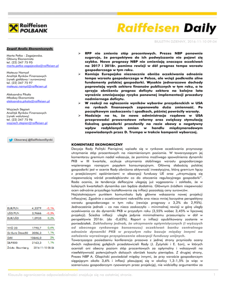 BIULETYN DZIENNY, 2016-11-10 09:04 Zespół Analiz Ekonomicznych: Marta Petka - Zagajewska. Główny Ekonomista tel. (22) 347 75 95 [email protected] Mateusz Namysł Analityk Rynków Finansowych (rynek giełdowy i surowcowy) tel. (22) 347 75 97 [email protected] Aleksandra Pikała Młodszy Ekonomista [email protected] Wojciech Stępień Analityk Rynków Finansowych (rynek walutowy) tel. (22) 347 75 96 [email protected]     RPP nie zmienia stóp procentowych. Prezes NBP ponownie sugeruje, że perspektywa do ich podwyższania nie pojawi się szybko. Nowe prognozy NBP nie zmieniają znacząco oczekiwań na 2017 i 2018r. pomimo rewizji w dół prognoz tempa wzrostu gospodarczego w tym roku. Komisja Europejska nieznacznie obniża oczekiwania odnośnie tempa wzrostu gospodarczego w Polsce, ale wciąż podkreśla silne fundamenty polskiej gospodarki. Wysokie jednorazowe dochody poprawiają wynik sektora finansów publicznych w tym roku, a to sprzyja obniżeniu prognoz deficytu sektora na kolejne lata wyraźnie zmniejszając ryzyko ponownej implementacji procedury nadmiernego deficytu. W reakcji na ogłoszenie wyników wyborów prezydenckich w USA na rynkach finansowych zapanowała duża zmienność. Po początkowym zaskoczeniu i spadkach, później powróciły wzrosty. Nadzieje na to, że nowa administracja rządowa w USA przeprowadzi prowzrostowe reformy oraz zwiększy stymulację fiskalną gospodarki przesłoniły na razie obawy o negatywny wpływ radyklanych zmian w handlu międzynarodowym zapowiadanych przez D. Trumpa w trakcie kampanii wyborczej. KOMENTARZ EKONOMICZNY Decyzja Rady Polityki Pieniężnej wpisała się w rynkowe oczekiwania przynosząc utrzymanie stóp procentowych na niezmienionym poziomie. W towarzyszącym jej komentarzu gremium nadal wskazuje, że pomimo możliwego spowolnienia dynamiki PKB w III kwartale, oczkuje utrzymania stabilnego wzrostu gospodarczego wspieranego rosnącym popytem konsumpcyjnym. Główną słabością polskiej gospodarki jest w ocenie Rady obniżona aktywność inwestycyjna, którą gremium łączy z przejściowymi opóźnieniami w absorpcji funduszy UE oraz „utrzymującą się niepewnością wśród przedsiębiorstw co do otoczenia regulacyjnego gospodarki”. Rada ocenia, że tendencje deflacyjne ulegają już wygaszaniu i zakłada, że w kolejnych kwartałach dynamika cen będzie dodatnia. Głównym źródłem niepewności ocen odnośnie przyszłego kształtowania się inflacji pozostają ceny surowców. Najistotniejszym punktem komunikatu były główne wskazania nowej projekcji inflacyjnej. Zgodnie z oczekiwaniami nakreśliła ona nieco mniej korzystne perspektywy wzrostu gospodarczego w tym roku (rewizja prognozy z 3,2% do 2,95%). Jednocześnie jednak – co nas nieco zaskoczyło – minimalnej rewizji w górę uległy oczekiwania co do dynamiki PKB w przyszłym roku (3,55% wobec 3,45% w lipcowej projekcji). Ścieżka inflacji uległa jedynie minimalnemu przesunięciu w dół w perspektywie 2016r. (do -0,65%). Raport o inflacji opublikowany zostanie w poniedziałek. Zakładamy jednak, że utrzymanie optymistycznych (i wyższych od obecnego rynkowego konsensusu) oczekiwań banku centralnego odnośnie dynamiki PKB w przyszłym roku bazuje między innymi na założeniu wyraźnego przyspieszenia absorpcji funduszy unijnych. Towarzysząca posiedzeniu konferencja prasowa z jednej strony przyniosła oceny dwóch najbardziej gołębich przedstawicieli Rady (J. Żyżyński i E. Łon), w których oceniali oni obecny poziom stóp procentowych za optymalny i wskazywali na nieefektywność potencjalnych dalszych obniżek kosztu pieniądza. Z drugiej strony, Prezes NBP A. Glapiński powiedział między innymi, że przy wzroście gospodarczym sięgającym około 3,6% i inflacji plasującej się w okolicy 1,3-1,5% (a więc w scenariuszu gospodarczym rysowanym przez projekcję), nie widziałby argumentów za Klauzula ograniczenia odpowiedzialności znajduje się na ostatniej stronie. 1 BIULETYN DZIENNY, 10 listopada 2016, GODZ 9.10 zacieśnianiem polityki pieniężnej. Wydaje się tym samym, że nastawienie Prezesa NBP do scenariusza podwyżek stóp procentowych uległo w perspektywie ostatnich kilku miesięcy ochłodzeniu. Zwiększa to szanse na to, że okres stabilizacji stóp procentowych w Polsce będzie się wydłużał sięgając z dużą dozą prawdopodobieństwa także poza 2017r. W jesiennej rundzie prognoz Komisja Europejska zrewidowała nieznacznie w dół swoje oczekiwania odnośnie tempa wzrostu gospodarczego w Polsce. Obecnie, w ocenie Komisji, dynamika PKB sięgnie w Polsce 3,1% w tym roku, 3,4% w 2017r. i 3,2% w 2018r. W rundzie wiosennej analogiczne prognozy zakładały 3,7%-owy wzrost PKB w tym roku i 3,6%-owy wzrost rok później. Pomimo rewizji Komisja podkreśliła korzystne perspektywy polskiej gospodarki i oceniła, że bilans ryzyk dla przedstawionej prognozy jest neutralny. Komisja podkreśla siłę popytu konsumpcyjnego, wspieranego nie tylko wyższymi transferami budżetowymi, ale także poprawiającą się sytuacją na rynku pracy, i oczekuje, że w kolejny rok przyniesie powrót do wyższej aktywności inwestycyjnej. Dzięki wysokim jednorazowym dochodom wyniki sektora finansów publicznych za 2016r. będą najprawdopodobniej znacząco lepsze od wcześniejszych oczekiwań KE. W konsekwencji prognoza tegorocznego deficytu sektora finansów publicznych została zrewidowana z 2,6% zakładanych wiosną, do 2,4%. Obniżono także zakładaną ścieżkę deficytów na w 2017r. – z 3,1% do 3,0%. W komentarzu Komisja stwierdziła jednocześnie, że przedstawione prognozy, nie uwzględniają jeszcze spodziewanej poprawy w ściągalności podatków. Przedstawiona ścieżka wyników sektora finansów publicznych wskazuje, że w najbliższym czasie nie ma ryzyka, by Polska ponownie znalazła się pod procedurą nadmiernego deficytu. Stanowi to także istotny argument z punktu widzenia nadciągających ponownych aktualizacji ocen ratingowych 