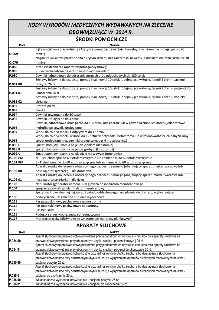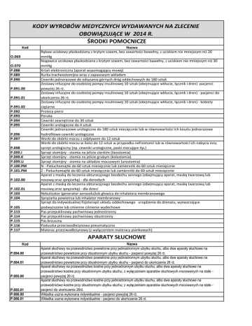 KODY WYROBÓW MEDYCZNYCH WYDAWANYCH NA ZLECENIE OBOWIĄZUJĄCE W 2014 R. ŚRODKI POMOCNICZE Kod O.069 O.070 P.088 P.089 P.090 P.091.00 P.091.01 P.091.02 P.092 P.093 P.094 P.095 P.096 P.097 P.098 P.099.I P.099.K P.099.U P.100.PM P.101.PM P.102.00 P.102.01 P.103 P.104 P.105 P.113 P.114 P.115 P.116 P.117 Nazwa Rękaw uciskowy płaskodziany z krytym szwem, bez zawartości bawełny, z uciskiem nie mniejszym niż 20 mmHg Nogawica uciskowa płaskodziana z krytym szwem, bez zawartości bawełny, z uciskiem nie mniejszym niż 30 mmHg Krtań elektroniczna (aparat wspomagający mowę) Rurka tracheostomijna wraz z zapasowym wkładem Cewniki jednorazowe do odsysania górnych dróg oddechowych do 180 sztuk Zestawy infuzyjne do osobistej pompy insulinowej 10 sztuk (obejmujące wkłucie, łącznik i dren) -pacjenci powyżej 26 rż. Zestawy infuzyjne do osobistej pompy insulinowej 10 sztuk (obejmujące wkłucie, łącznik i dren) - pacjenci do ukończenia 26 rż. Zestawy infuzyjne do osobistej pompy insulinowej 10 sztuk (obejmujące wkłucie, łącznik i dren) - kobiety ciężarne Proteza piersi Peruka Cewniki zewnętrzne do 30 sztuk Cewniki urologiczne do 4 sztuk Cewniki jednorazowe urologiczne do 180 sztuk miesięcznie lub w równowartości ich kosztu jednorazowe hydrofilowe cewniki urologiczne Worki do zbiórki moczu z odpływem do 12 sztuk Worki do zbiórki moczu w ilości do 12 sztuk w przypadku nefrostomii lub w równowartości ich nabycia inny sprzęt urologiczny (np. cewniki urologiczne, paski mocujące itp.) Sprzęt stomijny - stomia na jelicie cienkim (ileostomia) Sprzęt stomijny - stomia na jelicie grubym (kolostomia) Sprzęt stomijny - stomia na układzie moczowym (urostomia) N - Pieluchomajtki do 60 sztuk miesięcznie lub zamienniki do 60 sztuk miesięcznie Z - Pieluchomajtki do 60 sztuk miesięcznie lub zamienniki do 60 sztuk miesięcznie Aparat z maską do leczenia obturacyjnego bezdechu sennego (obejmujący aparat, maskę twarzową lub nosową oraz sprężarkę) - dla dorosłych Aparat z maską do leczenia obturacyjnego bezdechu sennego (obejmujący aparat, maskę twarzową lub nosową oraz sprężarkę) - dla dzieci Nebulizator (generator aerozolu)lub głowica do inhalatora membranowego Sprężarka powietrza lub inhalator membranowy Sprzęt do indywidualnej fizjoterapii układu oddechowego urządzenia do drenażu, wytwarzające podwyższone lub zmienne ciśnienie wydechowe Pas przepuklinowy pachwinowy jednostronny Pas przepuklinowy pachwinowy obustronny Pas brzuszny Poduszka przeciwodleżynowa pneumatyczna Materac przeciwodleżynowy (z wyłączeniem materacy piankowych) APARATY SŁUCHOWE Kod P.084.00 P.084.01 P.085.00 P.085.01 P.086.00 P.086.01 Nazwa Aparat słuchowy na przewodnictwo powietrzne przy jednostronnym ubytku słuchu, albo dwa aparaty słuchowe na przewodnictwo powietrzne przy obustronnym ubytku słuchu - pacjenci powyżej 26 rż. Aparat słuchowy na przewodnictwo powietrzne przy jednostronnym ubytku słuchu, albo dwa aparaty słuchowe na przewodnictwo powietrzne przy obustronnym ubytku słuchu - pacjenci do ukończenia 26 rż. Aparat słuchowy na przewodnictwo kostne przy jednostronnym ubytku słuchu, albo dwa aparaty słuchowe na przewodnictwo kostne przy obustronnym ubytku słuchu; z wyłączeniem aparatów słuchowych mocowanych na stałe pacjenci powyżej 26 rż. Aparat słuchowy na przewodnictwo kostne przy jednostronnym ubytku słuchu, albo dwa aparaty słuchowe na przewodnictwo kostne przy obustronnym ubytku słuchu; z wyłączeniem aparatów słuchowych mocowanych na stałe pacjenci do ukończenia 26rż. Wkładka uszna wykonana indywidualnie - pacjenci powyżej 26 rż. Wkładka uszna wykonana indywidualnie - pacjenci do ukończenia 26 rż. P.087.01 Systemy wspomagające słyszenie PRZEDMIOTY ORTOPEDYCZNE Kod A.001 A.002 A.003 B.004 B.005 B.006 B.007 B.008 B.009 B.010 B.011 C.012 C.013 C.014 C.015 C.016 C.017 D.018 D.019 D.020 E.021 F.022 F.023 G.024 G.025 G.026 G.027 H.028.00 H.028.01 H.029.00 H.029.01 H.030.00 H.030.01 H.031.00 H.031.01 H.032.00 H.032.01 H.033.01 I.034.00 I.034.01 I.035.00 I.035.01 J.036.00 J.036.01 J.037.00 J.037.01 J.038.00 J.038.01 J.039.00 J.039.01 J.040.00 J.040.01 J.041.01 J.042.01 J.043.00 Nazwa Protezowa wkładka do buta uzupełniająca stopę - do zwykłego obuwia Proteza uzupełniająca stopę Proteza ostateczna w obrębie stawu skokowego z kikutem oporowym Proteza tymczasowa podudzia Proteza ostateczna skorupowa podudzia z tuleją udową i połączeniem w obrębie stawu kolanowego Proteza ostateczna modularna podudzia z tuleją udową i połączeniem w obrębie stawu kolanowego Proteza ostateczna skorupowa podudzia Proteza ostateczna modularna podudzia Wymiana leja w protezie tymczasowej podudzia Wymiana leja w protezie ostatecznej podudzia Protezowe wyrównanie skrócenia kończyny dolnej w obrębie podudzia Proteza tymczasowa w obrębie uda Proteza ostateczna skorupowa w obrębie uda Proteza ostateczna modularna w obrębie uda Protezowe wyrównanie skrócenia kończyny dolnej w obrębie uda Wymiana leja w protezie tymczasowej uda Wymiana leja w protezie ostatecznej uda Proteza ostateczna skorupowa z koszem biodrowym po wyłuszczeniu w stawie biodrowym lub z krótkim kikutem wymagającym zaprotezowania z koszem biodrowym Proteza ostateczna modularna z koszem biodrowym po wyłuszczeniu w stawie biodrowym lub z krótkim kikutem wymagającym zaprotezowania z koszem biodrowym Wymiana kosza biodrowego po wyłuszczeniu w stawie biodrowym Proteza kosmetyczna w obrębie ręki Proteza kosmetyczna w obrębie przedramienia Proteza robocza z końcówką roboczą w obrębie przedramienia Proteza kosmetyczna w obrębie ramienia Proteza robocza z końcówką roboczą w obrębie ramienia Proteza kosmetyczna całej kończyny górnej po wyłuszczeniu w obrębie stawu barkowego Proteza robocza z końcówką roboczą całej kończyny górnej po wyłuszczeniu w obrębie stawu barkowego Orteza obejmująca goleń i stopę lub ze strzemieniem (typu AFO) - dla d
