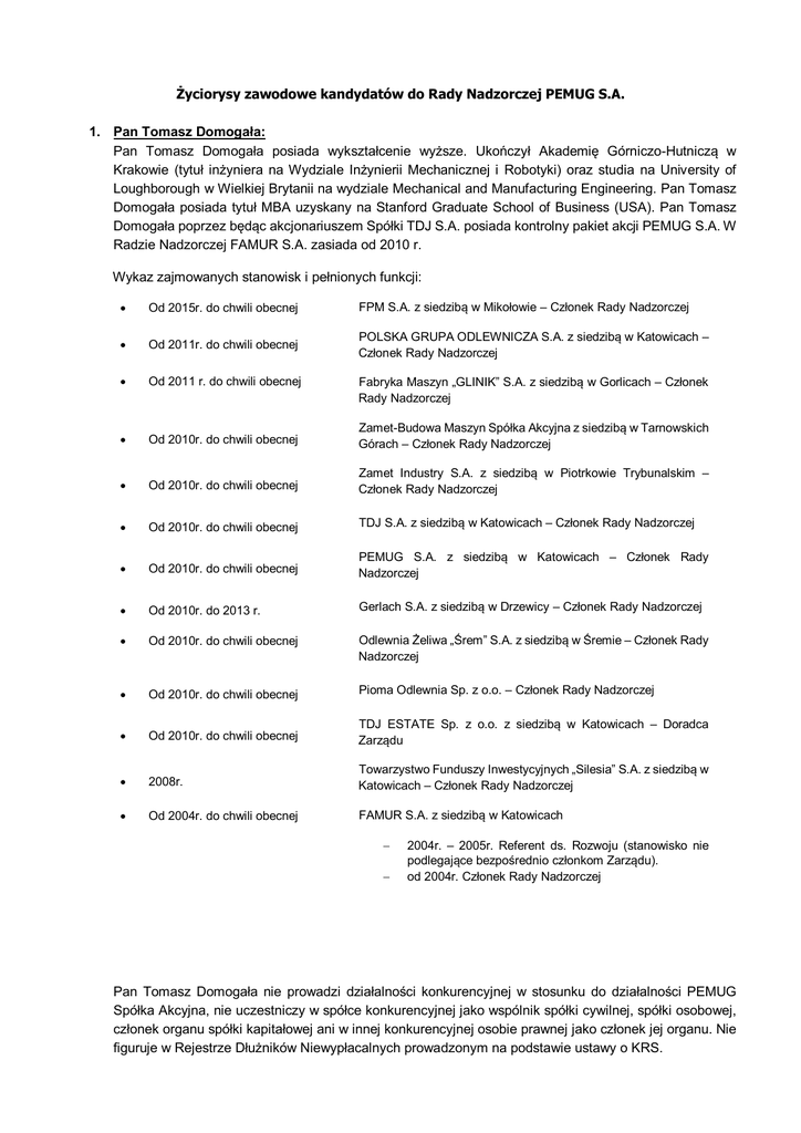 Życiorysy zawodowe kandydatów do Rady Nadzorczej PEMUG S.A. 1. Pan Tomasz Domogała: Pan Tomasz Domogała posiada wykształcenie wyższe. Ukończył Akademię Górniczo-Hutniczą w Krakowie (tytuł inżyniera na Wydziale Inżynierii Mechanicznej i Robotyki) oraz studia na University of Loughborough w Wielkiej Brytanii na wydziale Mechanical and Manufacturing Engineering. Pan Tomasz Domogała posiada tytuł MBA uzyskany na Stanford Graduate School of Business (USA). Pan Tomasz Domogała poprzez będąc akcjonariuszem Spółki TDJ S.A. posiada kontrolny pakiet akcji PEMUG S.A. W Radzie Nadzorczej FAMUR S.A. zasiada od 2010 r. Wykaz zajmowanych stanowisk i pełnionych funkcji: Od 2015r. do chwili obecnej FPM S.A. z siedzibą w Mikołowie – Członek Rady Nadzorczej Od 2011r. do chwili obecnej POLSKA GRUPA ODLEWNICZA S.A. z siedzibą w Katowicach – Członek Rady Nadzorczej Od 2011 r. do chwili obecnej Od 2010r. do chwili obecnej Zamet-Budowa Maszyn Spółka Akcyjna z siedzibą w Tarnowskich Górach – Członek Rady Nadzorczej Od 2010r. do chwili obecnej Zamet Industry S.A. z siedzibą w Piotrkowie Trybunalskim – Członek Rady Nadzorczej Od 2010r. do chwili obecnej TDJ S.A. z siedzibą w Katowicach – Członek Rady Nadzorczej Od 2010r. do chwili obecnej PEMUG S.A. z siedzibą w Katowicach – Członek Rady Nadzorczej Od 2010r. do 2013 r. Gerlach S.A. z siedzibą w Drzewicy – Członek Rady Nadzorczej Od 2010r. do chwili obecnej Odlewnia Żeliwa „Śrem” S.A. z siedzibą w Śremie – Członek Rady Nadzorczej Od 2010r. do chwili obecnej Pioma Odlewnia Sp. z o.o. – Członek Rady Nadzorczej Od 2010r. do chwili obecnej TDJ ESTATE Sp. z o.o. z siedzibą w Katowicach – Doradca Zarządu 2008r. Towarzystwo Funduszy Inwestycyjnych „Silesia” S.A. z siedzibą w Katowicach – Członek Rady Nadzorczej Od 2004r. do chwili obecnej FAMUR S.A. z siedzibą w Katowicach Fabryka Maszyn „GLINIK” S.A. z siedzibą w Gorlicach – Członek Rady Nadzorczej 2004r. – 2005r. Referent ds. Rozwoju (stanowisko nie podlegające bezpośrednio członkom Zarządu). od 2004r. Członek Rady Nadzorczej Pan Tomasz Domogała nie prowadzi działalności konkurencyjnej w stosunku do działalności PEMUG Spółka Akcyjna, nie uczestniczy w spółce konkurencyjnej jako wspólnik spółki cywilnej, spółki osobowej, członek organu spółki kapitałowej ani w innej konkurencyjnej osobie prawnej jako członek jej organu. Nie figuruje w Rejestrze Dłużników Niewypłacalnych prowadzonym na podstawie ustawy o KRS. 2. Czesław Kisiel Pan Czesław Kisiel posiada wykształcenie wyższe. Ukończył Akademię Ekonomiczną w Krakowie, Wydział: Ekonomika Produkcji, Kierunek: Planowanie i Finansowanie Gospodarki Narodowej, Specjalizacja: Planowanie. Pan Czesław Kisiel ukończył „Podyplomowe Studia Menedżerskie oparte o strukturę MBA" organizowane przez SGH w Warszawie. Pan Czesław Kisiel ukończył także m.in. kurs Syndyka i Likwidatora oraz kurs na członków rad nadzorczych w jednoosobowych Spółkach Skarbu Państwa oraz spółkach z udziałem Skarbu Państwa – organizowany przez Ministerstwo Przemysłu i Handlu oraz „Business Consulting Service”. Pełnione funkcje: Od 2016r. do chwili obecnej TDJ Equity V Sp. z o.o. z siedzibą w Katowicach – Prezes Zarządu Od 2016r. do chwili obecnej TDJ Equity IV S.A. z siedzibą w Katowicach – Prezes Zarządu Od 2015r. do chwili obecnej Zamet Budowa Maszyn S.A. z siedzibą w Tarnowskich Górach – Członek Rady Nadzorczej Od 2015r. do chwili obecnej FPM S.A. z siedzibą w Mikołowie, Członek Rady Nadzorczej Od 2014r. do chwili obecnej FUGO S.A. z siedzibą w Koninie, Członek Rady Nadzorczej Od 2014r. do chwili obecnej Od 2013r. do chwili obecnej FUGO ODLEW Sp. z o.o. z siedzibą w Koninie – Członek Rady Nadzorczej TDJ EQUITY I Sp. z o.o. z siedzibą w Tarnowskich Górach – Prezes Zarządu TDJ EQUITY II Sp. z o.o. z siedzibą w Tarnowskich Górach– Prezes Zarządu Od 2011r. do chwili obecnej TDJ Finance Sp. z o.o. z siedzibą w Katowicach – Prezes Zarządu Od 2013r. do chwili obecnej Od 2011r. do chwili obecnej FAMUR FAMAK S.A. z siedzibą w Kluczborku – Członek Rady Nadzorczej POLSKA GRUPA ODLEWNICZA S.A. z siedzibą w Katowicach Członek Rady Nadzorczej Fabryka Maszyn „GLINIK” S.A. z siedzibą w Gorlicach – Członek Rady Nadzorczej Od 2010r. do chwili obecnej ZAMET INDUSTRY S.A. Członek Rady Nadzorczej Od 2010r. do chwili obecnej PEMUG S.A. z siedzibą w Katowicach - Członek Rady Nadzorczej Od 2010r. do chwili obecnej TDJ S.A. z siedzibą w Katowicach - Prezes Zarządu 2010r. – 2011r. REMAG S.A. z siedzibą w Katowicach - Członek Rady Nadzorczej Od 2014r. do chwili obecnej Od 2011r. do chwili obecnej 2010r. z siedzibą w Piotrkowie Trybunalskim - „Pemug Inwestycje i Sprzęt" Sp. z o.o. z siedzibą w Katowicach -Członek Rady Nadzorczej 2010r Przedsiębiorstwo Usługowe „AB Consulting” Sp. z o. z siedzibą w Opolu - Prezes Zarządu 2009 r. do 2012 r. TDJ Estate Sp. z o.o. z siedzibą w Katowicach – Prezes Zarządu Od 2009r. do chwili obecnej FAMUR S.A. z siedzibą w Katowicach - Członek Rady Nadzorczej 2009r. Zamet – Budowa Maszyn S.A. z siedzibą w Tarnowskich Górach Wiceprezes Zarządu 2008r. – 2009r. Zamet - Budowa Maszyn S.A. z siedzibą w Tarnowskich Górach Członek Rady Nadzorczej Od 2008r. do 2013 r. „Towarzystwo Funduszy Inwestycyjnych Silesia" S.A. z siedzibą w Katowicach - Członek Rady Nadzorczej 2007r. – 2010r. TDJ Investments Sp. z o.o. z siedzibą w Katowicach - Prezes Zarządu 2007r. - 2008r. Zakłady Mechaniczne ZGODA Sp. z o.o. w likwidacji z siedzibą w Świętochłowicach - Członek Rady Nadzorczej 2006r. - 2008r. Jastrzębska Spółka Węglowa S.A. z siedzibą w Jastrzębiu Zdroju Członek Rady Nadzorczej 2006r. PIOMA S.A. z siedzibą Piotrkowie Trybunalskim – Członek Zarządu 2006r. Pioma - Odlewnia Sp. z o.o. z siedzibą w Piotrkowie Trybunalskim Członek Rady Nadzorczej 2005r. Warmiński