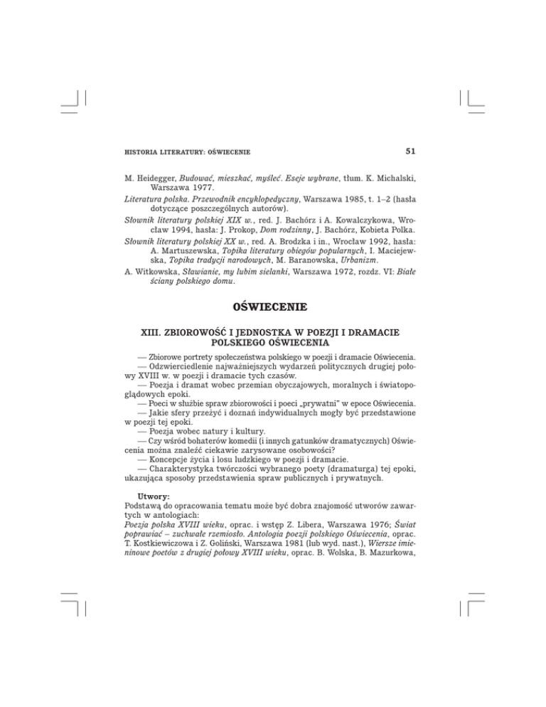HISTORIA LITERATURY: OŚWIECENIE 51 M. Heidegger, Budować, mieszkać, myśleć. Eseje wybrane, tłum. K. Michalski, Warszawa 1977. Literatura polska. Przewodnik encyklopedyczny, Warszawa 1985, t. 1–2 (hasła dotyczące poszczególnych autorów). Słownik literatury polskiej XIX w., red. J. Bachórz i A. Kowalczykowa, Wrocław 1994, hasła: J. Prokop, Dom rodzinny, J. Bachórz, Kobieta Polka. Słownik literatury polskiej XX w., red. A. Brodzka i in., Wrocław 1992, hasła: A. Martuszewska, Topika literatury obiegów popularnych, I. Maciejewska, Topika tradycji narodowych, M. Baranowska, Urbanizm. A. Witkowska, Sławianie, my lubim sielanki, Warszawa 1972, rozdz. VI: Białe ściany polskiego domu. OŚWIECENIE XIII. ZBIOROWOŚĆ I JEDNOSTKA W POEZJI I DRAMACIE POLSKIEGO OŚWIECENIA — Zbiorowe portrety społeczeństwa polskiego w poezji i dramacie Oświecenia. — Odzwierciedlenie najważniejszych wydarzeń politycznych drugiej połowy XVIII w. w poezji i dramacie tych czasów. — Poezja i dramat wobec przemian obyczajowych, moralnych i światopoglądowych epoki. — Poeci w służbie spraw zbiorowości i poeci „prywatni” w epoce Oświecenia. — Jakie sfery przeżyć i doznań indywidualnych mogły być przedstawione w poezji tej epoki. — Poezja wobec natury i kultury. — Czy wśród bohaterów komedii (i innych gatunków dramatycznych) Oświecenia można znaleźć ciekawie zarysowane osobowości? — Koncepcje życia i losu ludzkiego w poezji i dramacie. — Charakterystyka twórczości wybranego poety (dramaturga) tej epoki, ukazująca sposoby przedstawienia spraw publicznych i prywatnych. Utwory: Podstawą do opracowania tematu może być dobra znajomość utworów zawartych w antologiach: Poezja polska XVIII wieku, oprac. i wstęp Z. Libera, Warszawa 1976; Świat poprawiać – zuchwałe rzemiosło. Antologia poezji polskiego Oświecenia, oprac. T. Kostkiewiczowa i Z. Goliński, Warszawa 1981 (lub wyd. nast.), Wiersze imieninowe poetów z drugiej połowy XVIII wieku, oprac. B. Wolska, B. Mazurkowa, 52 PRZEWODNIK PO TEMATACH OLIMPIADY LITERATURY I JĘZYKA POLSKIEGO T. Chachulski, Warszawa 2011; także – znajomość wybranych utworów dramatycznych: F. Bohomolca, F. Zabłockiego (Fircyk w zalotach, Sarmatyzm, Król w kraju rozkoszy), W. Bogusławskiego (Krakowiacy i górale, Henryk VI na łowach), J.U. Niemcewicza (Powrót posła). Również – wybory poezji (wraz z zawartymi w nich wstępami): F. Karpińskiego (Poezje wybrane, Wrocław 1997, BN, s. I, nr 89), F.D. Kniaźnina (Wiersze wybrane, Warszawa 1981), I. Krasickiego (Wybór liryków, Wrocław 1985, BN, s. I, nr 252), A. Naruszewicza (Liryki wybrane, Warszawa 1964, Poezje zebrane: t. 1, Warszawa 2005, t. 2, Warszawa 2009, t. 3, Warszawa 2012), S. Trembeckiego (Wiersze wybrane, Warszawa 1965), T.K. Węgierskiego (Wiersze wybrane, Warszawa 1974). Opracowania: J. Abramowska, „Bajki i przypowieści” Krasickiego czyli krytyka sztuki sądzenia, „Pamiętnik Literacki” 1972, z. 1. W. Borowy, O poezji polskiej w wieku XVIII, wyd. 2, Warszawa 1978. M. Cieński, Literatura polskiego oświecenia wobec tradycji i Europy. Studia, Kraków 2013 (wybrane rozdziały). Czytanie Kniaźnina, red. B. Mazurkowa, T. Chachulski, Warszawa 2010. Czytanie Naruszewicza. Interpretacje, red. T. Chachulski, Wrocław 2000 (tu szczególnie interpretacje Pieśni ciarlatańskiej na jarmarku, Do Stanisława Augusta, satyr Szlachetność i Głupstwo, Balonu). Dramat polski. Interpretacje, cz. I, red. H. Ciechowicz i Z. Majchrowski, Gdańsk 2001 (tu szczególnie: T. Kostkiewiczowa, Fircyk w zalotach; P. Mitzner, Cud mniemany czyli Krakowiacy i Górale; K. Kurek, Powrót posła). Dramaty Franciszka Zabłockiego. Interpretacje, red. M. Cieński i T. Kostkiewiczowa, Wrocław 2000 (tu szczególnie: P. Matuszewska, Zabobonnik; T. Chachulski, Żółta szlafmyca; T. Witczak, Sarmatyzm). Z. Goliński, Ignacy Krasicki, Warszawa 1979 (lub wyd. nast. 2002). P. Kaczyński, Rodzina w literaturze stanisławowskiej. Motywy – konwencje – poglądy, Wrocław 2009. M. Klimowicz, Oświecenie, Warszawa 1972 (lub wyd. nast.), cz. I rozdz. 2–3, cz. II rozdz. 3–4, cz. III rozdz. 1–2, cz. IV rozdz. 2–3. T. Kostkiewiczowa, Horyzonty wyobraźni. O języku poezji czasów Oświecenia, Warszawa 1984. T. Kostkiewiczowa, Klasycyzm, sentymentalizm, rokoko. Szkice o prądach literackich polskiego Oświecenia, Warszawa 1975 (lub wyd. nast.). T. Kostkiewiczowa, Kniaźnin jako poeta liryczny, Wrocław 1971. T. Kostkiewiczowa, Polski wiek świateł. Obszary swoistości, Wrocław 2002. HISTORIA LITERATURY: OŚWIECENIE 53 T. Kostkiewiczowa, Z oddali i z bliska. Studia o wieku oświecenia, Warszawa 2010. Z. Libera, Oświecenie, Warszawa 1974 (lub wyd. nast.). B. Mazurkowa, Na ziemskich i niebieskich szlakach. Studia o poezji Franciszka Zabłockiego i Franciszka Dionizego Kniaźnina, Katowice 2008. A. Nasiłowska, Poezja opisowa Stanisława Trembeckiego, Wrocław 1990. R. Przybylski, Klasycyzm, czyli prawdziwy koniec Królestwa Polskiego, Warszawa 1983 (lub wyd. nast.). Z. Raszewski, Bogusławski, t. 1–2, Warszawa 1972. M. Rutkowska, Terminologia dramatu i teatru w polskim oświeceniu, Poznań 2007. Słownik literatury polskiego Oświecenia, red. T. Kostkiewiczowa, Wrocław 1977 (lub wyd. nast., szczególnie hasła: Elegia, Erotyk, Komedia, Liryka, List poetycki, Oda, Okolicznościowa literatura polityczna, Satyra, Sielanka). J. Snopek, Oświecenie. Szkic do portretu epoki, Warszawa 1999. R. Sobol, Franciszek Karpiński, Warszawa 1979. Cz. Zgorzelski, Naruszewicz – poeta, w: Od Oświecenia ku romantyzmowi i współczesności, Kraków 1978. XIV. „NA CO ROZUM ZDA SIĘ?” BAJKI XBW – OŚWIECENIOWE ARCYDZIEŁO — Tradycja gatunku: antyk, średniowiecze, Europa nowożytna, wątki orientalne; bajka w dawnej Polsce. Poetyka i „filozofia” gatunku, odmiany gatunkowe (bajka epigramatyczna, narracyjna), gatunki pokrewne. J. de La Fontaine i G. E. Lessing. Bajka ezopowa. 