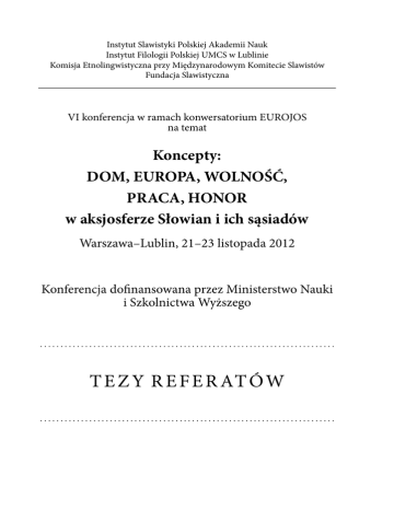 Instytut Slawistyki Polskiej Akademii Nauk Instytut Filologii Polskiej UMCS w Lublinie Komisja Etnolingwistyczna przy Międzynarodowym Komitecie Slawistów Fundacja Slawistyczna VI konferencja w ramach konwersatorium EUROJOS na temat Koncepty: DOM, EUROPA, WOLNOŚĆ, PRACA, HONOR w aksjosferze Słowian i ich sąsiadów Warszawa–Lublin, 21–23 listopada 2012 Konferencja do nansowana przez Ministerstwo Nauki i Szkolnictwa Wyższego ........................................................................ T E Z Y R E F E R AT Ó W ........................................................................ Spis treści Program konferencji . . . . . . . . . . . . . . . . . . . . . . . . . . . . . . . . . . . . 21 listopada 2012 (środa): Problemy metodologiczne EUROJOS i referaty plenarne 22 listopada 2012 (czwartek): DOM i EUROPA . . . . . . . . . . . . . . . . . . . . 23 listopada 2012 (piątek): WOLNOŚĆ, PRACA i HONOR . . . . . . . . . . . . . 3 3 4 6 Tezy referatów . . . . . . . . . . . . . . . . . . . . . . . . . . . . . . . . . . . . . . . . 9 Skład i łamanie w systemie XELATEX: Sebastian Wasiuta 2 Program konferencji I. Problemy metodologiczne EUROJOS 21 listopada 2012 (środa) Miejsce obrad: Warszawa, Pałac Staszica, Nowy Świat 72, Sala Okrągłego Stołu godz. 10.00–12.00 (sesja połączona z zebraniem otwartym Rady Naukowej EUROJOS i Sekcji Etnolingwistycznej Komitetu Językoznawstwa PAN) Otwarcie: Dyrektor Instytutu Slawistyki PAN dr Anna Engelking, Wicedyrektor IFP UMCS prof. dr hab. Stanisława Niebrzegowska-Bartmińska, Prezes Fundacji Slawistycznej dr Ewa Golachowska. Wręczenie prof. Renacie Grzegorczykowej dedykowanego Jej 24. tomu „Etnolingwistyki”. Przewodniczenie obradom: Anna Engelking, Aleksey Yudin 1. Maciej Abramowicz (OBTA, Warszawa), Iwona Bielińska-Gardziel (Instytut Slawistyki PAN, Warszawa): O stanie prac w ramach konwersatorium EUROJOS 2. Jerzy Bartmiński (UMCS Lublin; Instytut Slawistyki PAN, Warszawa): Dlaczego w eksplikacji konceptów warto łączyć dane systemowe, ankietowe i tekstowe? 3. Wojciech Chlebda (Uniwersytet Opolski, Opole): O możliwościach de nicji syntetycznej w etnolingwistycznym opisie pojęć 4. Stanisława Niebrzegowska-Bartmińska (UMCS, Lublin): Projekt badawczy (ETNO)EUROJOS a program etnolingwistyki kognitywnej godz. 12.00–12.30: przerwa na kawę godz. 12.30–14.10: obrady 3 Przewodniczenie obradom: Jadwiga Puzynina, Jerzy Bartmiński 5. Svetlana Tolstaja (RAN, Moskwa): Русская ЧЕСТЬ и польский HONOR 6. Irina Sedakova (RAN, Moskwa): Смена ценностных парадигм в России зимой 2011–2012 гг.: О ‘честности’ 7. Elena Berezovič (Uniwersytet Uralski, Rosja): К изучению семантических трансформаций ценностной лексики в русском языке (‘самолюбие’ или ‘любовь к себе’?) 8. Eric Metz (Amsterdam), Aleksey Yudin (Uniwersytet w Gandawie, Belgia), Anne Delizee (Mons), Natalya Kostyak (Hamburg): JOS a problemy przekładu – ros. ‘obščestvennost’ i jego tłumaczenia na języki niderlandzki, niemiecki, angielski, ukraiński, polski i francuski 9. Hanna Popowska-Taborska (Warszawa), Nicole Dołowy-Rybińska (Instytut Slawistyki PAN, Warszawa): Językowy obraz świata a normalizowane współcześnie języki mniejszościowe (kaszubski i bretoński) godz. 14.10–15.00: dyskusja godz. 15.00: obiad godz. 16.30: wyjazd do Lublina II. Referaty poświęcone poszczególnym konceptom 22 listopada 2012 (czwartek) Miejsce obrad: Lublin, Uniwersytet Marii Curie-Skłodowskiej, Pl. Marii Curie-Skłodowskiej 4a, sala obrad Rady Wydziału Humanistycznego, Nowa Humanistyka godz. 9.00–11.00: obrady Otwarcie: JM Rektor UMCS prof. dr hab. Stanisław Michałowski, Dziekan Wydziału Humanistycznego UMCS prof. dr hab. Robert Litwiński, Dyrektor IFP UMCS prof. dr hab. Barbara Czwórnóg-Jadczak. BLOK 1 – DOM Przewodniczenie obradom: Wojciech Chlebda, Irina Sedakova 10. Dorota Pazio-Wlazłowska (Instytut Slawistyki PAN, Warszawa), Olga Rotmistrova (Państwowy Uniwersytet Politechniczny, Sankt-Petersburg): DOM w aksjosferze współczesnych Rosjan 4 11. Galina Jaworska (Narodowy Instytut Studiów Strategicznych, Ukraina): ДОМ в современном украинском языке: утопия и установки общества потребления 12. Małgorzata Misiak (Uniwersytet Wrocławski, Wrocław): DOM w języku i kulturze Łemków 13. Jadwiga Kozłowska-Doda (UMCS, Lublin): DOM w językowo-kulturowym obrazie świata Białorusinów godz. 11.00–11.30: dyskusja godz. 11.30–12.00: przerwa na kawę godz. 12.00–13.40: obrady Przewodniczenie obradom: Swietlana Martinek, Dorota Pazio-Wlazłowska 14. Iwona Bielińska-Gardziel (Instytut Slawistyki PAN, Warszawa): Pro lowanie konceptu DOM we współczesnym polskim dyskursie publicznym 15. Joanna Popielska-Grzybowska (Akademia Humanistyczna, Pułtusk), Jo B. Harper (Uniwersytet w Londynie, Wielka Brytania): e concept of HOME in British English 16. Elżbieta Skibińska (Uniwersytet Wrocławski): DOM à la française: obraz potoczny a obraz słownikowy 17. Maria Zadencka (Uniwersytet w Sztokholmie, Szwecja): Szwedzkie pojęcia DOMU: dynamika zasięgu pól semantycznych 18. Zuzanna Bułat-Silva (Uniwersytet Wrocławski, Wrocław): Portugalski DOM – badanie korpusowe [komunikat] 19. Joanna Popielska-Grzybowska (Akademia Humanistyczna, Pułtusk), Massimiliano Franci (Università di Firenze, Włochy): e concept of ‘pr’ (HOME/HOUSE) in Ancient Egyptian [komunikat] godz. 13.40–14.10: dyskusja godz. 14.15–15.15: obiad godz. 15.15–16.35: obrady BLOK 2 – EUROPA Przewodniczenie obradom: Elena Berezovič, Elżbieta Skibińska 20. Olga Frolova (Moskiewski Uniwersytet Państwowy, Rosja): Что такое ‘европейскость’ в русской картине мира? 21. Galina M. Wasiliewa (Rosyjski Państwowy 