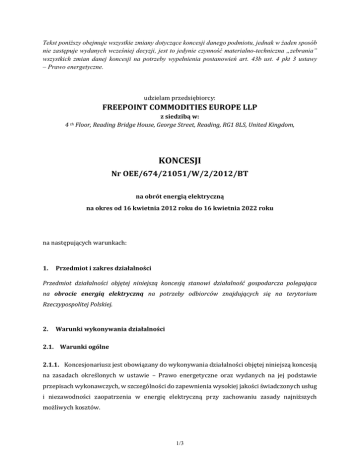 Tekst poniższy obejmuje wszystkie zmiany dotyczące koncesji danego podmiotu, jednak w żaden sposób nie zastępuje wydanych wcześniej decyzji, jest to jedynie czynność materialno-techniczna „zebrania” wszystkich zmian danej koncesji na potrzeby wypełnienia postanowień art. 43b ust. 4 pkt 3 ustawy – Prawo energetyczne. udzielam przedsiębiorcy: FREEPOINT COMMODITIES EUROPE LLP z siedzibą w: 4 Floor, Reading Bridge House, George Street, Reading, RG1 8LS, United Kingdom, th KONCESJI Nr OEE/674/21051/W/2/2012/BT na obrót energią elektryczną na okres od 16 kwietnia 2012 roku do 16 kwietnia 2022 roku na następujących warunkach: 1. Przedmiot i zakres działalności Przedmiot działalności objętej niniejszą koncesją stanowi działalność gospodarcza polegająca na obrocie energią elektryczną na potrzeby odbiorców znajdujących się na terytorium Rzeczypospolitej Polskiej. 2. Warunki wykonywania działalności 2.1. Warunki ogólne 2.1.1. Koncesjonariusz jest obowiązany do wykonywania działalności objętej niniejszą koncesją na zasadach określonych w ustawie – Prawo energetyczne oraz wydanych na jej podstawie przepisach wykonawczych, w szczególności do zapewnienia wysokiej jakości świadczonych usług i niezawodności zaopatrzenia w energię elektryczną przy zachowaniu zasady najniższych możliwych kosztów. 1/3 2.1.2. Koncesjonariusz nie może zawierać umów sprzedaży energii elektrycznej z przedsiębiorcami wykonującymi działalność gospodarczą w zakresie wytwarzania, przesyłania, dystrybucji lub obrotu energią elektryczną, jeżeli nie posiadają koncesji, w przypadkach gdy taka koncesja jest wymagana przepisami ustawy – Prawo energetyczne. 2.1.3. Koncesjonariusz nie może zawierać umów sprzedaży energii elektrycznej z przedsiębiorcami wykonującymi działalność gospodarczą w zakresie wytwarzania, przesyłania, dystrybucji lub obrotu energią elektryczną, jeżeli nie posiadają koncesji, w przypadkach gdy taka koncesja jest wymagana przepisami ustawy – Prawo energetyczne. 2.1.4. Koncesjonariusz nie będzie subsydiować działalności nie objętej niniejszą koncesją z przychodu osiąganego z działalności objętej tą koncesją. 2.2. Szczególne warunki wykonywania działalności objętej koncesją ze względu na właściwą obsługę odbiorców 2.2.1. Koncesjonariusz jest obowiązany do utrzymywania lub zagwarantowania możliwości pozyskania środków finansowych lub majątku pozwalających na zaspokojenie roszczeń osób trzecich mogących powstać wskutek niewłaściwego wykonywania działalności objętej koncesją. 2.3. Warunki zaprzestania działalności po wygaśnięciu koncesji lub jej cofnięciu 2.3.1. Koncesjonariusz, nie później niż na 18 miesięcy przed upływem ważności koncesji i zaprzestaniem działalności, spowoduje opracowanie na własny koszt i przedstawi Prezesowi URE analizę finansową (wraz z opinią i raportem biegłego rewidenta z przeprowadzonego badania sprawozdania finansowego Koncesjonariusza za ostatni rok działalności – jeśli obowiązek badania tego sprawozdania wynika z przepisów ustawy z dnia 29 września 1994 r. o rachunkowości /Dz. U. 2009 r. Nr 152, poz. 1223 z późn. zm./) w zakresie wykonywanej działalności koncesjonowanej, która określi, w szczególności, stan wywiązania się Koncesjonariusza ze zobowiązań względem osób trzecich na dzień przewidywanego zakończenia tej działalności. 2.3.2. Koncesjonariusz jest obowiązany do realizacji wniosków i zaleceń wynikających z powyższej analizy w najkrótszym możliwym terminie. 2.4. Udzielanie informacji 2.4.1. Koncesjonariusz jest obowiązany zawiadomić Prezesa URE o zmianach dotyczących wykonywanej działalności objętej niniejszą koncesją (w tym w szczególności firmy, siedziby, 2/3 numeru w rejestrze przedsiębiorców, numeru identyfikacji podatkowej, rozszerzenia bądź ograniczenia tej działalności) nie później niż na 14 dni od dnia ich powstania. 2.4.2. Koncesjonariusz jest obowiązany do pisemnego poinformowania Prezesa URE o zamiarze zaprzestania działalności koncesjonowanej nie później niż na 18 miesięcy przed przewidywaną datą zaprzestania działalności. 2.4.3. Koncesjonariusz jest obowiązany zawiadomić Prezesa URE o niepodjęciu działalności objętej koncesją, jeżeli nie podejmie jej w ciągu 6 miesięcy od dnia doręczenia koncesji, podając przyczyny niepodjęcia działalności; za datę podjęcia działalności uważa się datę faktycznego rozpoczęcia sprzedaży energii elektrycznej. 3/3