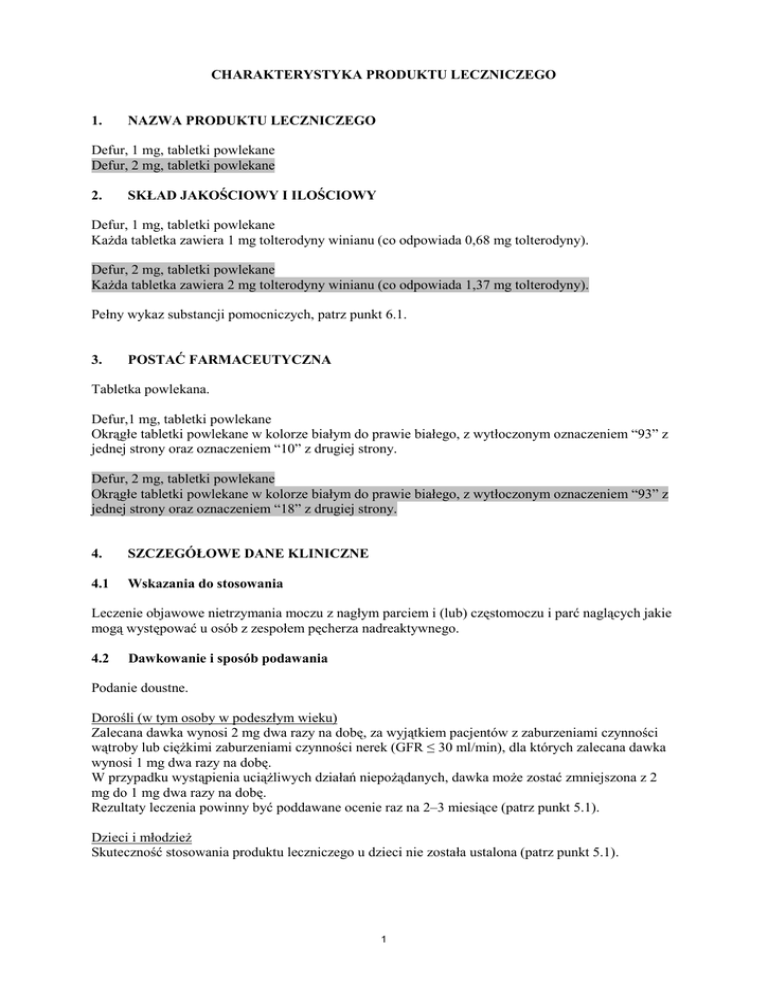 CHARAKTERYSTYKA PRODUKTU LECZNICZEGO 1. NAZWA PRODUKTU LECZNICZEGO Defur, 1 mg, tabletki powlekane Defur, 2 mg, tabletki powlekane 2. SKŁAD JAKOŚCIOWY I ILOŚCIOWY Defur, 1 mg, tabletki powlekane Każda tabletka zawiera 1 mg tolterodyny winianu (co odpowiada 0,68 mg tolterodyny). Defur, 2 mg, tabletki powlekane Każda tabletka zawiera 2 mg tolterodyny winianu (co odpowiada 1,37 mg tolterodyny). Pełny wykaz substancji pomocniczych, patrz punkt 6.1. 3. POSTAĆ FARMACEUTYCZNA Tabletka powlekana. Defur,1 mg, tabletki powlekane Okrągłe tabletki powlekane w kolorze białym do prawie białego, z wytłoczonym oznaczeniem “93” z jednej strony oraz oznaczeniem “10” z drugiej strony. Defur, 2 mg, tabletki powlekane Okrągłe tabletki powlekane w kolorze białym do prawie białego, z wytłoczonym oznaczeniem “93” z jednej strony oraz oznaczeniem “18” z drugiej strony. 4. SZCZEGÓŁOWE DANE KLINICZNE 4.1 Wskazania do stosowania Leczenie objawowe nietrzymania moczu z nagłym parciem i (lub) częstomoczu i parć naglących jakie mogą występować u osób z zespołem pęcherza nadreaktywnego. 4.2 Dawkowanie i sposób podawania Podanie doustne. Dorośli (w tym osoby w podeszłym wieku) Zalecana dawka wynosi 2 mg dwa razy na dobę, za wyjątkiem pacjentów z zaburzeniami czynności wątroby lub ciężkimi zaburzeniami czynności nerek (GFR ≤ 30 ml/min), dla których zalecana dawka wynosi 1 mg dwa razy na dobę. W przypadku wystąpienia uciążliwych działań niepożądanych, dawka może zostać zmniejszona z 2 mg do 1 mg dwa razy na dobę. Rezultaty leczenia powinny być poddawane ocenie raz na 2–3 miesiące (patrz punkt 5.1). Dzieci i młodzież Skuteczność stosowania produktu leczniczego u dzieci nie została ustalona (patrz punkt 5.1). 1 W związku z tym, stosowanie tolterodyny u dzieci nie jest wskazane. 4.3 Przeciwwskazania • • • • • • nadwrażliwość na substancję czynną lub którąkolwiek z substancji pomocniczych, zatrzymanie moczu, oporna na leczenie jaskra z wąskim kątem przesączania, miastenia, ciężka postać wrzodziejącego zapalenia jelita grubego, toksyczne rozszerzenie okrężnicy. 4.4 Specjalne ostrzeżenia i środki ostrożności dotyczące stosowania Należy zachować ostrożność stosując tolterodynę u pacjentów z następującymi dolegliwościami: • istotne klinicznie zablokowanie odpływu z pęcherza moczowego zagrażające zatrzymaniem moczu, • choroby układu pokarmowego przebiegające ze zwężeniem światła (np. zwężenie odźwiernika), • zaburzenia czynności nerek (patrz punkt 4.2), • choroby wątroby (patrz punkt 4.2 i 5.2), • neuropatia autonomiczna, • przepuklina rozworu przełykowego, • spowolniona perystaltyka układu pokarmowego. Wykazano, że wielokrotne lub całkowite dobowe dawki tolterodyny o natychmiastowym uwalnianiu wynoszące 4 mg (dawka terapeutyczna) oraz 8 mg (dawka większa od terapeutycznej) powodują wydłużenie odstępu QTc (patrz punkt 5.1). Kliniczne znaczenie tych obserwacji nie zostało wyjaśnione i jest uzależnione od indywidualnych czynników ryzyka i podatności pacjenta. Należy zachować ostrożność stosując tolterodynę u pacjentów z czynnikami ryzyka wydłużenia odstępu QT, z uwzględnieniem: • wrodzonego lub udokumentowanego nabytego wydłużenia odstępu QT, • zaburzeń elektrolitowych, takich jak hipokaliemia, hipomagnezemia i hipokalcemia • bradykardii, • istotnych, nabytych wcześniej chorób serca (tj. kardiomiopatia, choroba niedokrwienna serca, arytmia, zastoinowa niewydolność serca), • jednoczesnego podawania leków, które powodują wydłużenie odstępu QT, z uwzględnieniem leków z grupy IA (np. chinidyna, prokainamid) oraz leków antyarytmicznych z grupy III (np. amiodaron, sotalol). Jest to szczególnie istotne w przypadku przyjmowania silnych inhibitorów CYP3A4 (patrz punkt 5.1). Należy unikać jednoczesnego podawania silnych inhibitorów CYP3A4 (patrz punkt 4.5). Podobnie jak w przypadku każdego innego leczenia objawów parć naglących i nietrzymania moczu z towarzyszącym parciem, przed podjęciem leczenia należy rozważyć organiczne przyczyny parcia i częstomoczu. 4.5 Interakcje z innymi produktami leczniczymi i inne rodzaje interakcji Jednoczesne leczenie ogólne przy użyciu silnych inhibitorów CYP3A4, takich jak antybiotyki makrolidowe (np. erytromycyna i klarytromycyna), leków przeciwgrzybiczych (np. ketokonazol oraz itrakonazol) i antyproteaz nie jest wskazane, ze względu na podwyższone stężenie tolterodyny w surowicy u osób o wolnym typie metabolizmu przy udziale CYP2D6 i późniejsze ryzyko 2 przedawkowania (patrz punkt 4.4). Jednoczesne podawanie innych leków o właściwościach antymuskarynowych może powodować nasilenie działań terapeutycznych oraz działań niepożądanych. Z drugiej strony, działanie lecznicze tolterodyny może ulec osłabieniu wskutek jednoczesnego podawania leków z klasy agonistów cholinergicznych receptorów muskarynowych. Tolterodyna może obniżać skuteczność leków prokinetycznych, takich jak metoklopramid oraz cyzapryd. Jednoczesne stosowanie fluoksetyny (silnego inhibitora cytochromu CYP2D6) nie powoduje istotnej klinicznie interakcji, ponieważ tolterodyna i jej metabolit zależny od cytochromu CYP2D6, 5–hydroksymetylowa pochodna tolterodyny, są równie silne. W badaniach interakcji leków nie stwierdzono interakcji z warfaryną lub złożonymi, doustnymi lekami antykoncepcyjnymi (etynyloestradiol/lewonorgestrel). Badania kliniczne wykazały, że tolterodyna nie jest inhibitorem metabolicznym CYP2D6, 2C19, 3A4 lub 1A2. Dlatego też, nie należy spodziewać się wzrostu stężenia w osoczu leków metabolizowanych przez układy tych izoenzymów, podczas stosowania jednocześnie z tolterodyną. 4.6 Wpływ na płodność, ciążę i laktację Ciąża Brak wystarczających danych na temat stosowania tolterodyny przez kobiety w ciąży. Badania na zwierzętach wykazały toksyczność