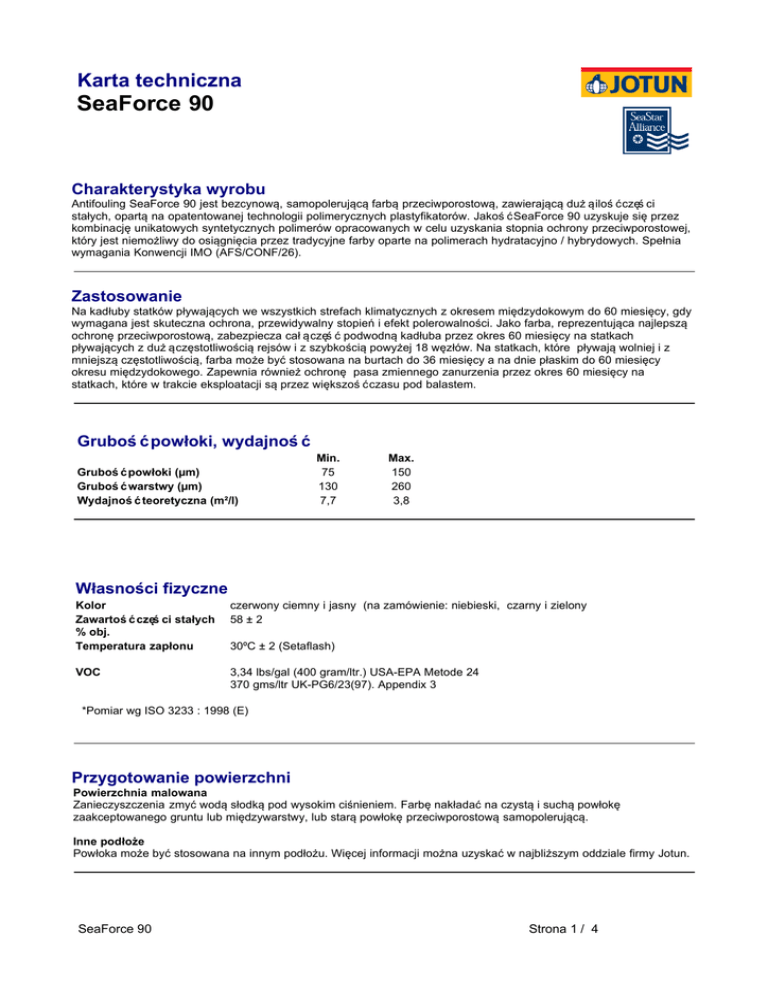 Karta techniczna SeaForce 90 Charakterystyka wyrobu Antifouling SeaForce 90 jest bezcynową , samopolerują cą farbą przeciwporostową , zawierają cą duż ą ilośćczęści stałych, opartą na opatentowanej technologii polimerycznych plastyfikatorów. JakośćSeaForce 90 uzyskuje się przez kombinację unikatowych syntetycznych polimerów opracowanych w celu uzyskania stopnia ochrony przeciwporostowej, który jest niemożliwy do osią gnięcia przez tradycyjne farby oparte na polimerach hydratacyjno / hybrydowych. Spełnia wymagania Konwencji IMO (AFS/CONF/26). Zastosowanie Na kadłuby statków pływają cych we wszystkich strefach klimatycznych z okresem międzydokowym do 60 miesięcy, gdy wymagana jest skuteczna ochrona, przewidywalny stopień i efekt polerowalności. Jako farba, reprezentują ca najlepszą ochronę przeciwporostową , zabezpiecza cał ą częśćpodwodną kadłuba przez okres 60 miesięcy na statkach pływają cych z duż ą częstotliwością rejsów i z szybkością powyżej 18 węzłów. Na statkach, które pływają wolniej i z mniejszą częstotliwością , farba może byćstosowana na burtach do 36 miesięcy a na dnie płaskim do 60 miesięcy okresu międzydokowego. Zapewnia również ochronę pasa zmiennego zanurzenia przez okres 60 miesięcy na statkach, które w trakcie eksploatacji są przez większośćczasu pod balastem. Grubośćpowłoki, wydajność Grubośćpowłoki (µm) Grubośćwarstwy (µm) Wydajnośćteoretyczna (m²/l) Min. 75 130 7,7 Max. 150 260 3,8 Własności fizyczne Kolor Zawartośćczęści stałych % obj. Temperatura zapłonu czerwony ciemny i jasny (na zamówienie: niebieski, czarny i zielony 58 ± 2 VOC 3,34 lbs/gal (400 gram/ltr.) USA-EPA Metode 24 370 gms/ltr UK-PG6/23(97). Appendix 3 30ºC ± 2 (Setaflash) *Pomiar wg ISO 3233 : 1998 (E) Przygotowanie powierzchni Powierzchnia malowana Zanieczyszczenia zmyćwodą słodką pod wysokim ciśnieniem. Farbę nakładaćna czystą i suchą powłokę zaakceptowanego gruntu lub międzywarstwy, lub starą powłokę przeciwporostową samopolerują cą . Inne podłoże Powłoka może byćstosowana na innym podłożu. Więcej informacji można uzyskaćw najbliższym oddziale firmy Jotun. SeaForce 90 Strona 1 / 4 Warunki podczas malowania Temperatura podłoża co najmniej 3ºC powyżej punktu rosy otaczają cego powietrza; pomiar temperatury i wilgotności względnej powietrza wykonaćw pobliżu podłoża. Konieczna dobra wentylacja w przestrzeni zamkniętej, aby zapewnić prawidłowe schnięcie powłoki. Metoda aplikacji Natrysk Pędzel Wałek Stosowaćnatrysk bezpowietrzny. Może byćstosowany; należy uzyskaćspecyfikowaną grubośćpowłoki. Może byćstosowany; należy uzyskaćspecyfikowaną grubośćpowłoki. Sposób stosowania Proporcje mieszania (obj.) wyrób jednoskładnikowy. Rozcieńczalnik/zmywacz Jotun Thinner No. 7 Instrukcja aplikacji natryskiem bezpowietrznym Ciśnienie w dyszy 15 MPa (150 kp/cm², 2100 psi.). Średnica dyszy 0.53 - 0.78 mm (0.021 - 0.031"). Ką t natrysku dyszy 65 - 80° Filtr należy sprawdzić, czy filtry sa czyste. SeaForce 90 Strona 2 / 4 Czas schnięcia Czas schnięcia zależy od cyrkulacji powietrza, temperatury, grubości i ilości powłok. Podane wartości są typowe dla: · Dobrej wentylacji (warunki zewnętrzne lub swobodny przepływ powietrza) · Typowej grubości powłoki · Jednej powłoki na podłożu obojętnym. Temperatura podłoża Powierzchnia sucha Całkowite wyschnięcie Czas do wodowania 1 Ponowne malowanie, min. 2 1. 1. 5°C 60 min 8h 12-24 h 10°C 60 min 6h 12-22 h 23°C 30 min 4h 10-20 h 40°C 30 min 3h 8-16 h 12 h 9h 7h 6h Interwał czasu wynika z okresu międzydokowego i całkowitej grubości użytego gruntu i farby przeciwporostowej. Czas schnięcia wydłuża się ze wzrostem grubości powłoki. Przed nałożeniem kolejnej warstwy, powierzchnia powinna byćsucha i wolna od wszelkich zanieczyszczeń. Powyższe informacje należy traktowaćjako wskazówki. Rzeczywisty czas schnięcia może ulec zmianie w zależności od grubości powłoki, warunków wentylacji, wilgotności powietrza, istnieją cego systemu malarskiego oraz wymagań mechanicznych powłoki, przydatności do transportu pomalowanego elementu, itp. Wymagania dotyczą ce konkretnego systemu powłokowego mogą byćprzedstawione oddzielnie z uwzględnieniem rzeczywistych warunków. Zalecana powłoka gruntowa: Odpowiednia farba przeciwkorozyjna stosowana z farbami Safeguard Universal ES lub Vinyguard Silvergrey 88 jako przekładki. Mogą byćspecyfikowane inne systemy w zależności od rejonu eksploatacji Przechowywanie Produkt musi byćprzechowywany zgodnie z obowią zują cymi przepisami. Zalecane jest przechowywanie pojemników w suchym dobrze wentylowanym pomieszczeniu, z dala od żródeł ciepła i ognia. Pojemniki powinny byćszczelnie zamknięte. Przygotowanie Ostrożnie obchodzićsię z produktem. Starannie wymieszaćprzed użyciem. Opakowanie 20 litrów. BHP Należy zwrócićuwagę na ostrzeżenia umieszczone na pojemniku. Stosowaćw warunkach dobrej wentylacji. Nie wdychaćpar i mgły produktu. Unikaćkontaktu ze skórą . W przypadku zanieczyszczenia skóry, należy natychmiast usunąć materiał odpowiednim środkiem zmywają cym, mydłem i wodą . W przypadku zanieczyszczenia oczu przemyć duż ą ilością wody i natychmiast zwrócićsię o pomoc lekarską . Szczegółowe informacje dotyczą ce BHP przy stosowaniu produktu znajdują się w Karcie Charakterystyki Preparatu Niebezpiecznego. SeaForce 90 Strona 3 / 4 UWAGA Informacje w Karcie Technicznej podane są zgodnie z naszą najlepszą wiedzą w oparciu o badania laboratoryjne i doświadczenia praktyczne. Ponieważ wyrób nie zawsze stosowany jest pod naszą kontrolą , możemy gwarantować jedynie jakośćwyrobu jako takiego. Zastrzegamy prawo do zmiany informacji podanych w Karcie Technicznej bez uprzedzenia. Jotun jest firmą o zasięgu światowym, posiadają cą fabryki, biura sprzedaży i magazyny w ponad 