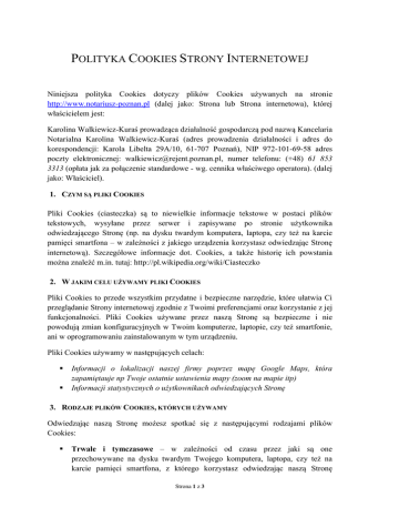 POLITYKA COOKIES STRONY INTERNETOWEJ Niniejsza polityka Cookies dotyczy plików Cookies używanych na stronie http://www.notariusz-poznan.pl (dalej jako: Strona lub Strona internetowa), której właścicielem jest: Karolina Walkiewicz-Kuraś prowadząca działalność gospodarczą pod nazwą Kancelaria Notarialna Karolina Walkiewicz-Kuraś (adres prowadzenia działalności i adres do korespondencji: Karola Libelta 29A/10, 61-707 Poznań), NIP 972-101-69-58 adres poczty elektronicznej: [email protected], numer telefonu: (+48) 61 853 3313 (opłata jak za połączenie standardowe - wg. cennika właściwego operatora). (dalej jako: Właściciel). 1. CZYM SĄ PLIKI COOKIES Pliki Cookies (ciasteczka) są to niewielkie informacje tekstowe w postaci plików tekstowych, wysyłane przez serwer i zapisywane po stronie użytkownika odwiedzającego Stronę (np. na dysku twardym komputera, laptopa, czy też na karcie pamięci smartfona – w zależności z jakiego urządzenia korzystasz odwiedzając Stronę internetową). Szczegółowe informacje dot. Cookies, a także historię ich powstania można znaleźć m.in. tutaj: http://pl.wikipedia.org/wiki/Ciasteczko 2. W JAKIM CELU UŻYWAMY PLIKI COOKIES Pliki Cookies to przede wszystkim przydatne i bezpieczne narzędzie, które ułatwia Ci przeglądanie Strony internetowej zgodnie z Twoimi preferencjami oraz korzystanie z jej funkcjonalności. Pliki Cookies używane przez naszą Stronę są bezpieczne i nie powodują zmian konfiguracyjnych w Twoim komputerze, laptopie, czy też smartfonie, ani w oprogramowaniu zainstalowanym w tym urządzeniu. Pliki Cookies używamy w następujących celach: Informacji o lokalizacji naszej firmy poprzez mapę Google Maps, która zapamiętauje np Twoje ostatnie ustawienia mapy (zoom na mapie itp) Informacji statystycznych o użytkownikach odwiedzających Stronę 3. RODZAJE PLIKÓW COOKIES, KTÓRYCH UŻYWAMY Odwiedzając naszą Stronę możesz spotkać się z następującymi rodzajami plików Cookies: Trwałe i tymczasowe – w zależności od czasu przez jaki są one przechowywane na dysku twardym Twojego komputera, laptopa, czy też na karcie pamięci smartfona, z którego korzystasz odwiedzając naszą Stronę Strona 1 z 3 internetową. Pliki tymczasowe to pliki Cookies, które przechowywane są przez stosunkowo krótki okres czasu – usuwane są w momencie zamknięcia przeglądarki internetowej, z której korzystasz. Pliki tymczasowe są też z tego powodu często określone plikami sesyjnymi. Pliki trwałe (nazywane również plikami stałymi) to pliki Cookies, które z reguły przechowywane są przez okres dłuższy niż w przypadku plików tymczasowych – okres ich przechowywania trwa przez czas określony w parametrach danego pliku Cookies albo do momentu ich samodzielnego usunięcia przez Ciebie. Własne i zewnętrzne – w zależności od tego, czy dany plik Cookies pochodzi bezpośrednio ze Strony, czy też ze strony podmiotu trzeciego za pośrednictwem naszej Strony (np. w wypadku udostępnienia powierzchni Strony jednej z sieci reklamowych lub prowadzenia anonimowych statystyk przy wykorzystaniu Google Analytics). W tym ostatnim wypadku zalecamy również zapoznanie się z polityką Cookies lub polityką prywatności danego podmiotu trzeciego. Poniżej znajdziesz szczegółową informację o celu i rodzaju plików Cookies używanych na naszej Stronie: Nazwa pliku Cookies Cel używania pliku Cookies Pochodzenie pliku Cookies Czas zapisu pliku Cookies Czy plik Cookies jest wymagany do prawidłowego korzystania ze strony GOOGLE ANALYTICS _utma unikalny identyfikator domeny ok 2 lat _utmb odpowiedzialne za przechowywanie informacji na temat danej odwiedziny _utmc współpracuje z _utmb wygasa po zamknięciu przeglądarki _utmz zawiera ono informację na temat źródeł odwiedzin ok 6 miesięcy google.com oraz adlers.com.pl wygasa po zamknięciu przeglądarki nie jest wymagany do korzystania ze strony GOOGLE MAPS wygasa po zamknięciu przeglądarki S SSID NID APISID SID Pliki Cookies są używane w celu wyświetlania informacji dotyczącej mapy pobieranej z serwisu firmy Google. ok. 10 lat google.pl i google.com Więcej informacji: http://www.google.com/policie s/privacy/ ok 6 miesięcy ok. 10 lat ok. 10 lat PREF ok. 2 lat Strona 2 z 3 nie jest wymagany do korzystania ze strony SAPISID ok. 10 lat HSID ok. 10 lat S_adsense wygasa po zamknięciu przeglądarki S_adsense3-ui wygasa po zamknięciu przeglądarki Informację, czy dany plik Cookies jest trwały, tymczasowy, własny czy zewnętrzny, a także termin jego przechowywania można także uzyskać korzystając z odpowiednich opcji własnej przeglądarki internetowej – w tym celu odsyłamy do działu pomocy przeglądarki internetowej. 4. ZARZĄDZANIE PLIKAMI COOKIES, ZGODA NA ICH UŻYWANIE Standardowo większość przeglądarek internetowych dostępnych na rynku domyślnie akceptuje zapisywanie plików Cookies. Masz możliwość określenia warunków korzystania z plików Cookies za pomocą ustawień własnej przeglądarki internetowej. Oznacza to, że możesz np. częściowo ograniczyć (np. czasowo) lub całkowicie wyłączyć możliwość zapisywania plików Cookies na Twoim komputerze – w tym ostatnim wypadku jednak może to mieć wpływ na niektóre funkcjonalności Strony internetowej. Ustawienia Twojej przeglądarki internetowej w zakresie plików Cookies są istotne z punktu widzenia zgody na korzystanie z plików Cookies przez naszą Stronę – zgodnie z przepisami taka zgoda może być również wyrażona poprzez ustawienia przeglądarki internetowej. Szczegółowe informacje na temat zmiany ustawień dotyczących plików Cookies oraz ich samodzielnego usuwania w najpopularniejszych przeglądarkach internetowych dostępne są w dziale pomocy przeglądarki internetowej oraz na poniższych stronach: • • • • • w przeglądarce Chrome w przeglądarce Firefox w przęglądarce Internet Explorer w przeglądarce Opera w przeglądarce Safari Strona 