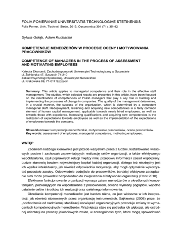 FOLIA POMERANAE UNIVERSITATIS TECHNOLOGIAE STETINENSIS Folia Pomer. Univ. Technol. Stetin. 2013, Oeconomica 301 (71), 35–42 Sylwia Gołąb, Adam Kucharski KOMPETENCJE MENEDŻERÓW W PROCESIE OCENY I MOTYWOWANIA PRACOWNIKÓW COMPETENCE OF MANAGERS IN THE PROCESS OF ASSESSMENT AND MOTIVATING EMPLOYEES Katedra Ekonomii, Zachodniopomorski Uniwersytet Technologiczny w Szczecinie ul. Żołnierska 47, Szczecin 71-210 Zakład Psychologii Społecznej, Uniwersytet Szczeciński ul. Krakowska 69, 71-017 Szczecin Summary. This article applies to managerial competence and their role in the effective staff management. The studies, which selected results are presented in this article, have been focused on the identification of competencies of Polish managers that play a key role in building and implementing the processes of change in companies. The quality of the management determines, in a crucial manner, the success of the organization, which is determined by a competent managerial staff. Redeployment, retraining and acquiring new competencies is a fairly common element of human capital management, applicable towards newly hired employees, as well as towards those with experience. Increasing qualifications and acquiring new competencies is the realization of expectations towards employees as well as the implementation of the expectations of employees towards the company. Słowa kluczowe: kompetencje menedżerskie, motywowanie pracowników, ocena pracowników. Key words: assessment of employees, managerial competence, motivating employees. WSTĘP Zadaniem każdego kierownika jest przede wszystkim praca z ludźmi, kształtowanie właściwych postaw i zachowań zapewniających realizację celów organizacji, a także efektywnego współdziałania, czyli poprawnych relacji między nimi, przepływu informacji i zasad współpracy. Ludzie stanowią bowiem najważniejszy kapitał każdej organizacji, dlatego też niezbędny jest ich wysiłek intelektualny, jak również odpowiednia motywacja, aby mogli optymalnie wykorzystać pozostałe zasoby. Odpowiednie podejście do pracowników, bardziej efektywne zarządzanie nimi może prowadzić bezpośrednio do zwiększenia efektywności organizacji (Penc 2010). Efektywne funkcjonowanie organizacji wymaga zatem menedżerów o określonych kompetencjach, pozwalających na współdziałanie z pracownikiem, otwarte wymiany poglądów, wspólne ustalanie celów i środków ich realizacji oraz rzetelnego informowania. Określanie kompetencji menedżerów jest bardzo różne, co jest widoczne w ich interpretacji, jak również stosowanych przez organizację instrumentach. Sajkiewicz (2008) pisze, że „odchodzenie od nadmiernej stabilizacji rozwiązań organizacyjnych powoduje zmiany w wymaganiach kompetencyjnych menedżerów. Ważniejsza staje się potrzeba ich głębszej, ale ostrożnej orientacji na procesy jakościowych zmian, w szczególności tych, które mogą spowodować 36 S. Gołąb, A. Kucharski zakłócenie równowagi w przedsiębiorstwie”. Menedżerowie muszą zatem w sposób kreatywny stosować instrumenty doskonalenia organizacji i rozwiązania wspierające. W literaturze przedmiotu można spotkać różne zakresy kompetencji, których wymaga się od menedżerów. Kierownika cechuje: wygląd (powierzchowność), cechy osobowości, umiejętności interpersonalne i umiejętności zarządzania (Obłój 1997). W wielu publikacjach z zakresu kompetencji zauważa się jednak pewne podobieństwa dotyczące ważności poszczególnych umiejętności. Menedżer powinien być osobą zintegrowaną i ukształtowaną. Oznacza to, że powinien posiadać takie cechy, jak (Skłodowski 1993): – trwałość przekonań pozwalającą na wyrażanie opinii wobec ważnych zagadnień; – charakter, który obejmuje w szczególności zespół wartości i przekonań; – odpowiedzialność za swoje postępowanie wobec przełożonych i podwładnych; – umiejętności informacyjne, w tym należyte wysławianie się, jasność przekazywania informacji i wydawania poleceń; – poczucie sprawiedliwości, w szczególności w zakresie sposobu stawiania zadań i ich egzekwowania; – twórczość i samodzielność w działaniu; – zrównoważenie emocjonalne. Kierownik powinien charakteryzować się zdolnością do działania w celu uzyskania określonych rezultatów za pomocą konkretnych środków oraz sposobu zorganizowania procesu. Powinien odznaczać się spostrzegawczością i odkrywczością, a przez to umiejętnością diagnozowania, wykrywania przyczyn trudności, określania przebiegu zdarzeń w skomplikowanych sytuacjach, umiejętnością tworzenia nowych koncepcji. Równie ważna jest zdolność precyzowania i planowania, ustalania celów, norm i sposobów ich osiągania z uwzględnieniem czasu, kolejności, miejsca, metod i dostępnych środków. Kierownik powinien posiąść umiejętności oceniania i wartościowania, udzielania wskazówek i instrukcji, przekazywania myśli, odczuć wrażeń i nastrojów w sposób zwięzły i precyzyjny zarówno w mowie, jak i piśmie (Penc 2005). Kierownicy o szerokim zakresie kompetencji to entuzjaści, którzy inspirują, dodają otuchy oraz dają przykład etycznego postępowania. Realizacja tych aspektów jest możliwa dzięki świetnemu wykształceniu ogólnemu, tolerancji wobec różnych kultur, umiejętności pracy zespołowej, kreatywnemu sposobowi myślenia (Ogger 1992). Należy także podkreślić, że kompetencje są ogniwem, które łączy działania z różnych zakresów (rekrutacja i selekcja, ścieżki kariery i następstw, oceny pracowników, szkolenia, systemy motywacyjne itd.). Jest to budowanie wspólnych relacji pozwalających na tworzenie jednolitej płaszczyzny działań w ramach zarządzania zasobami ludzkimi (Król 2007). Aby sprostać tym zadaniom, oprócz niezbędnych kompetencji, menedżer musi posiadać wiedzę na temat planowania i alokacji zasobów ludzkich, a przede wszystkim funkcji jaką pełnią w za