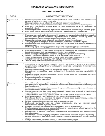 STANDARDY WYMAGAŃ Z INFORMATYKI POSTAWY UCZNIÓW OCENA Odpowiednia A CHARAKTERYSTYKA POSTAWY Poprawna B Dobra C Bardzo dobra D Wzorowa E Podczas wykonywania zadań teoretycznych i praktycznych uczeń potrzebuje stale mobilizowania i pomocy ze strony nauczyciela i innych osób. Rzadko przestrzega zasad ustalonych w regulaminie pracowni komputerowej. Praca ucznia cechuje się niewielką samodzielnością, wykonane zadania są niezbyt estetyczne. Choć słabo zaangażowany w pracę klasy czy grupy, uczeń stara się jednak dostosować do powstałych sytuacji. Rzadko wspiera dobrą komunikację w grupie i nie umie okazywać szacunku innym członkom grupy. Bywa, że nie zawsze przestrzega zasad bezpiecznej i higienicznej pracy z komputerem. Podczas wykonywania zadań teoretycznych i praktycznych zazwyczaj stara się być samodzielny, brak mu jednak jeszcze staranności i systematyczności w działaniu. Zdarza się jednak, że potrzebuje mobilizowania i pomocy ze strony nauczyciela i innych osób. Zazwyczaj przestrzega zasad ustalonych w regulaminie pracowni komputerowej. Zazwyczaj wybiera z dostępnych zbiorów informacji te, które wolno wykorzystać w pracy. Czasami zachęca do dobrej komunikacji w grupie, nie zawsze jednak umie okazać szacunek innym członkom grupy. Dostosowuje się do obowiązujących zasad bezpiecznej i higienicznej pracy z komputerem. Podczas wykonywania typowych zadań teoretycznych i praktycznych jest samodzielny, nie zawsze jednak dość staranny, brak jeszcze czasem spójności w jego działaniu. Prawie zawsze przestrzega zasad ustalonych w regulaminie pracowni komputerowej. Wybiera z dostępnych zbiorów informacji te, które wolno wykorzystać w pracy. Często zachęca do dobrej komunikacji w grupie, zwykle odnosi się z szacunkiem do innych. Zaangażowany w pracę klasy, grupy, stara się być aktywny i odpowiedzialny. Jeszcze niezbyt efektywnie wykorzystuje czas pracy. Samodzielnie wykonuje prawie wszystkie zadania teoretyczne i praktyczne przewidziane programem oraz jest operatywny w wykorzystaniu wiadomości i umiejętności do rozwiązywania zadań trudnych. Zawsze przestrzega zasad ustalonych w regulaminie pracowni komputerowej. Zaangażowany w pracę klasy i grupy, zachęca innych do działania, zazwyczaj odpowiedzialny i aktywny. Zazwyczaj zachęca do dobrej komunikacji w grupie, zawsze odnosi się z szacunkiem do innych, jest skłonny do kompromisu. Racjonalnie wykorzystuje czas pracy. Prawidłowo organizuje stanowisko. Samodzielnie wykonuje wszystkie zadania teoretyczne i praktyczne przewidziane programem oraz jest operatywny w wykorzystaniu wiadomości i umiejętności do rozwiązywania zadań trudnych, w nowych sytuacjach. Bierze udział w ustalaniu zasad obowiązujących w pracowni komputerowej i jednocześnie dba o ich przestrzeganie przez innych uczniów. Zaangażowany w pracę klasy, grupy, bardzo aktywny i odpowiedzialny, skutecznie motywuje innych uczestników zajęć do pokonywania trudności. Zachęca do dobrej komunikacji w grupie, wyraża uznanie dla cudzych pomysłów i ich autorów. Podczas wykonywania zadań wykazuje się dużą starannością i sumiennością. Przygotowuje dodatkowe informacje na zajęcia, wykonuje prace długoterminowe, pomaga w przygotowaniu różnych dokumentów szkolnym. Dąży do samodoskonalenia i twórczego rozwoju własnych uzdolnień. Dostosowuje stanowisko pracy do potrzeb, przestrzegając przy tym wszelkich zasad bezpieczeństwa, higieny i organizacji pracy. Przejawia inicjatywę, nauczyciel może na niego zawsze liczyć – jest niezawodny. Przestrzega zasad poszanowania własności intelektualnej – szanuje pracę wykonaną przez innych, używa tylko licencjonowanego oprogramowania. Zaangażowany w pracę na rzecz szkoły, współpracuje z administratorem przy tworzeniu strony internetowej szkoły. Wykorzystuje z własnej inicjatywy umiejętności informatyczne na innych lekcjach. Poproszony – pomaga nauczycielom w przygotowywaniu różnych dokumentów wynikających z bieżących potrzeb szkoły. Startuje, a bywa nawet, że odnosi sukcesy, w konkursach informatycznych.