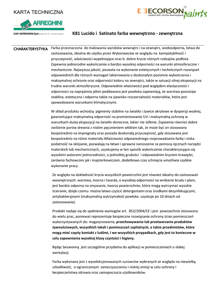 KARTA TECHNICZNA K81 Lucido i Satinato farba wewnętrzno - zewnętrzna CHARAKTERYSTYKA Farba przeznaczona do malowania wyrobów wewnątrz i na zewnątrz, wodoodporna, łatwa do zastosowania, idealna do użytku przez Wykonawców ze względu na kompatybilność i przyczepność, właściwości wypełniające oraz b. dobre krycie różnych rodzajów podłoża. Zapewnia jednorodne wykończenie o bardzo wysokiej odporności na warunki atmosferyczne i mechaniczne. Najwyższa jakość, pozwala na wykonanie estetycznych i technicznych rozwiązań odpowiednich dla różnych wymagań lakierowania o doskonałym poziomie wykończenia i maksymalnej ochronie oraz odporności koloru na zewnątrz, także w sytuacji silnej ekspozycji na trudne warunki atmosferyczne. Odpowiednie właściwości pod względem elastyczności i odporności na naprężenia jakim poddawana jest powłoka zapewniają, że warstwa pozostaje stabilna, estetyczna i odporna także na zjawisko rozszerzalności materiałów, które jest spowodowane warunkami klimatycznymi. W skład produktu wchodzą pigmenty stabilne na światło i żywice akrylowe w dyspersji wodnej, gwarantujące maksymalną odporność na promieniowanie UV i maksymalną ochronę w warunkach dużej ekspozycji na światło słoneczne, lakier nie żółknie. Zapewnia również dobre zwilżenie porów drewna z niskim pęcznieniem włókien tak, że może być on stosowany bezpośrednio na impregnaty oraz posiada doskonałą przyczepność, gdy stosowana jest bezpośrednio na różne materiały.Właściwości odpowiedniego rozprowadzania farby i niska podatność na sklejanie, pozwalają na łatwe i sprawne nanoszenie za pomocą ręcznych narzędzi malarskich lub mechanicznych, uzyskujemy w ten sposób wykończenie charakteryzujące się wysokimi walorami jednorodności, o jednolitej grubości i odpowiednim kryciem krawędzi, zarówno fachowcom jak i majsterkowiczom, dodatkowo czas schnięcia umożliwia szybkie wykonanie pracy. Ze względu na dokładność krycia wszystkich powierzchni jest również idealny do zastosowań wewnętrznych: warstwa, mocna i twarda, o wysokiej odporności na wnikanie brudu i plam, jest bardzo odporny na zmywanie, tworzy powierzchnie, które mogą wytrzymać wysokie ścieranie, dzięki czemu można łatwo czyścić detergentami oraz środkami dezynfekującymi, antybakteryjnymi (maksymalną wytrzymałość powłoka uzyskuje po 10 dniach od zastosowania). Produkt nadaje się do spełnienia wymogów art. 852/2004/CE i jest powszechnie stosowany do wielu prac, ponieważ reprezentuje bezpieczne rozwiązanie ochrony ścian pomieszczeń wykorzystywanych do: magazynowania, przechowywania lub przetwarzania produktów żywnościowych, wszystkich lokali i pomieszczeń szpitalnych, a także przedmiotów, które mogą mieć częsty kontakt z ludźmi, i we wszystkich przypadkach, gdy jest to konieczne w celu zapewnienia wysokiej klasy czystości i higieny. Będąc bezwonną jest szczególnie przydatna do aplikacji w pomieszczeniach o słabej wentylacji. Farba wykonana jest z wyselekcjonowanych surowców wybranych ze względu na niewielką szkodliwość, o ograniczonym zanieczyszczeniu i niskiej emisji w celu ochrony i bezpieczeństwa zdrowia oraz samopoczucia użytkowników. KARTA TECHNICZNA K81 Lucido i Satinato farba wewnętrzno - zewnętrzna Odporność na wodę Odporność na zmywanie Produkt wysycha i twardnieje całkowicie w ciągu 4-5 dni w optymalnych warunkach (+15 +30°C przy wilgotności podłoża <10% i wilgotności względnej <65%). Polakierowane wyroby nadają się do użytku po 4-5 dniach schnięcia, do tego czasu należy unikać kontaktów z wodą deszczową i pochodzącą z kondensacji (w przypadku mgły lub wilgotność w 85%) przed pełnym utwardzeniem, które mogą powodować zmętnienie lub pęcherze. Jest to zjawisko o charakterze tymczasowym, nie ma wpływu na siłę produktu i zniknie w normalnych warunkach po pełnym wyschnięciu. DOSKONAŁA Odporność na czynniki atmosferyczne DOSKONAŁA Przyleganie do różnych podłoży DOSKONAŁA Elastyczność WYSOKA Wygląd powierzchni Kolor POŁYSK LUB SATYNA Według wzornika. Gama kolorów może być powiększona wg wzornika Tintoretto(do wnętrz), Tucano, Spazio 100 i Area 115, Tintema (tylko RAL do wnętrz i na zewnątrz) Kolory z różnych partii produkcji mogą się nieznacznie różnić, dlatego należy zakończyć pracę materiałem z tej samej produkcji. Produkt przeznaczony do barwienia w systemach Arreghini Colors 16 i Ecosistema. WŁAŚCIWOŚCI DANE TECHNICZNE SPECYFIKACJA Ciężar właściwy 1000-1250 g/l w zależności od koloru Lepkość TF6 Lucido bianco 50-60s; Satinato 40-50s KARTA TECHNICZNA K81 Lucido i Satinato farba wewnętrzno - zewnętrzna Zawartość ciał stałych Połysk Lucido bianco 47-51%; Lucido barwiony 39-43; Satinato BIANCO 46-50% Lucido bianco 70-80; Lucido barwiony 80-90; Satinato 30-40 Schnięcie Następną warstwę nanosić po 3h; Pełne schnięcie 24h Kontrast Bianco 95-99; barwiona 90-99 (wg koloru) PRZECHOWYWANIE ZASTOSOWANIE Produkt powinien być przechowywany w oryginalnych opakowaniach w przedziale temperatur +5oC +30oC Nadaje się do dekoracji i ochrony przed czynnikami atmosferycznymi, także w intensywnych kolorach wyrobów nowych lub przeznaczonych do konserwacji, drewnopochodnych podłoży różnych gatunków, metal obsługuje odpowiednio przygotowanej, powierzchnie ocynkowane, stopów aluminium i tworzyw sztucznych w środowisku wiejskim, morskich i przemysłowym, wyrobów takich jak drzwi, okna, grzejniki. W przypadku gdy produkt był przechowywany w niskich temperaturach zaleca się ogrzać go do temperatury co najmniej +15°C przed nanoszeniem. Podczas nanoszenia pędzlem nakładać produkt w odpowiedniej ilości (nie za cienkie warstwy). Podczas stosowania i w czasie suszenia, istotne jest, aby temperatura przekraczała +15° C i wilgotność powietrza poniżej 65%, jest również ważne, aby zapewnić dobra wentylację w celu odparowanie