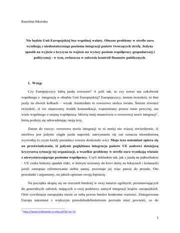 Karolina Sikorska Nie będzie Unii Europejskiej bez wspólnej waluty. Obecne problemy w strefie euro wynikają z niedostatecznego poziomu integracji państw tworzących strefę. Jedyny sposób na wyjście z kryzysu to wejście na wyższy poziom współpracy gospodarczej i politycznej - w tym, zwłaszcza w zakresie kontroli finansów publicznych. 1. Wstęp Czy Europejczycy lubią jazdę rowerem? A jeśli tak, to czy rower ma cokolwiek wspólnego z integracją w obrębie Unii Europejskiej? Europejczycy, śmiem twierdzić, to fani jazdy na dwóch kółkach – wszak Amsterdam to rowerowa stolica świata. Śmiem również twierdzić, iż ów niepozorny środek komunikacji, wspomniany przeze mnie powyżej, ma wiele wspólnego z unijną współpracą. Mówię tutaj mianowicie o rowerowej teorii integracji1, którą posłużę się udowadniając moją tezę. Zatem do rzeczy: rowerowa teoria integracji to ni mniej nie więcej stwierdzenie, iż możliwa jest jedynie ciągła jazda naprzód, zatrzymanie się zaś oznacza nieuniknioną wywrotkę (o czym każdy posiadacz roweru doskonale wie). Moja teza natomiast opiera się na przeświadczeniu, iż jedynie pogłębiona integracja państw UE uzdrowi dzisiejszą kryzysową sytuację tej organizacji, a wszelkie problemy w strefie euro wynikają właśnie z niewystarczającego poziomu współpracy. Czyli dokładnie tak, jak z jazdą na jednośladzie – UE czeka bolesny upadek (taki, w którym ścieramy do krwi skórę na łokaciach i kolanach) jeżeli zastopuje reformowanie siebie samej, pozostaje jej więc parcie do przodu. Oto przesłanki i argumenty, na jakich opieram swoją hipotezę. Na początku skupię się na rzeczach bardziej w swej naturze ogólnych, przemawiających do generalnych założeń, mających u swej podstawy zamysł integracji krajów europejskich. Otóż cywilizacja europejska niesie ze sobą pewne bardzo konkretne wartości. Zintegrowana Europa natomiast z większym prawdobodobieństwem pozwala mieć pewność, co do 1 http://www.krakowski.us.edu.pl/?p=ue-15 1 przetrwania oraz promocji tych cnót. Tylko na pozór brzmi to jak banał. Wystarczy bowiem wyobrazić sobie funkcjonowanie w kraju, dajmy na to, islamskim czy azjatyckim – w każdym razie odmiennym zarówno kulturowo, światopoglądowo jaki i religijnie od naszego „europejskiego świata”. Jak wiadomo występuje tam całkowicie inne spojrzenie chociażby na miejsce człowieka w społeczeństwie, jego prawa i obowiązki, życie w ogóle. Nie jest to tak oczywiste dla nas, ludzi obracających się i przesiąkniętych na wskroś standardami demokratycznymi starego kontynentu. A wypowiadając słowa „cywilizacja europejska” mam na myśli: demokrację i wszelkie dobra z niej wypływające, obronę wspólnych dóbr i własności, społeczną gospodarkę rynkową oraz rozbudowane prawa człowieka, w zakres których wchodzą również stojące na wysokim poziomie prawa socjalne i pracownicze. Nie wolno w tym miejscu pominąć także ochrony usług społecznych, takich jak służba zdrowia i edukacja czy konsekwentnego dążenia do eliminacji wykluczenia społecznego. Wszystko to składa się na pewien model cywilizacyjny, którego pojedyncze państwo narodowe nie jest i nie będzie w stanie obronić w erze ścierających się ze sobą światów, kultur, społeczeństw i wzorów. Tylko politycznie zintegrowana Europa jest w stanie sprostać temu zadaniu, co w połączeniu z coraz mniejszym przyrostem naturalnym w obrębie UE oraz w obliczu potęg takich jak Chiny (reprezentujące odrębny model cywilizacyjny) nabiera jeszcze głębszego znaczenia. Jak łączy się to z walutą euro? Zintegrowana Europa to przecież wspólna waluta oraz głęboka integracja na poziomie gospodarczym i politycznym. Euro to zatem nie tylko bilon czy papier z odpowiednio naniesionym na niego nominałem, ale też nośnik bardzo szczególnych wartości świadczących o naszym pochodzeniu oraz o nas samych. Potrzebę utrzymania wspólnej waluty wytłumaczyłabym, często przytaczaną przez znawców dynamiki procesów europejskich, koncepcją integracji zwaną metodą Monneta. Nikomu nie trzeba dziś chyba przybliżać sylwetki ojca - założyciela Wspólnot Europejskch, jego hipoteza nie jest już jednak tak powszechnie znana. Jean Monnet sądził, iż początkowa, mniejsza ze względu na swa skalę, współpraca w obrębie państw Europy, przynosząc wymierne dla nich korzyści, wpłynie zarazem na chęć dalszej, pogłębionej już integracji. Tak się rzeczywiście stało. Historycy opowiedzieliby zapewne tutaj o uni celnej, następnie wspólnym rynku, unii gospodarczej oraz unii walutowej i fiskalnej.2 Bezprzecznym zdaje się fakt osiągania korzyści z wszystkich poprzednich procesów integracyjnych, jak również aktualnie – ze wspólnej waluty. Inaczej takich kroków po prostu by nie podjęto. Nawet w obliczu patosu tworzenia jednej Europy i wszelkich historycznych stwierdzeń, jakie niesie ze 2 http://ec.europa.eu/economy_finance/publications/publication6706_pl.pdf 2 sobą owa sytuacja, wciąż liderzy europejscy liczą przede wszystkim pieniądze, a nie ilość pięknych sentencji o znoszeniu barier. Innymi słowy: euro się opłaca i istnieją na to obiektywne dowody w postaci przychodów do budżetu czy poziomu rozwoju gospodarki. Zaraz, zaraz – ktoś mógłby powiedzieć – skoro jest tak dobrze, czemu jest tak źle? Skąd kryzys w strefie euro, case Grecji, potrzeba cięć w wydatkach budżetowych, niezliczone szczyty europejskie „ostatniej szansy” itp.? Wbrew pozorom to pytanie nie zniweczy, tak misternie tkanej przeze mnie dotąd, pieśni pochwalnej dla euro i zwiększonej współpracy państw Unii Europejskiej. Możnaby powiedzieć (odnosząc się do staropolskiej mądrości), iż tu leży właśnie pies pogrzebany, a raczej pogrzebana waluta europejska. Problem, według mnie oczywiście, sprowadza się bowiem nie do samego faktu istnienia takowej waluty, a na niedostatec