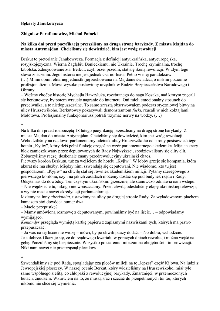 Bękarty Janukowycza Zbigniew Parafianowicz, Michał Potocki Na kilka dni przed pacyfikacją przeszliśmy na drugą stronę barykady. Z miasta Majdan do miasta Antymajdan. Chcieliśmy się dowiedzieć, kim jest wróg rewolucji Berkut to pretorianie Janukowycza. Formacja z definicji antyukraińska, antyeuropejska, rosyjskojęzyczna. Wierna Zagłębiu Donieckiemu, nie Ukrainie. Trochę kryminalna, trochę kibolska. Zdecydowanie zła. Berkut, czyli orzeł przedni, stał się ikoną rewolucji. W złym tego słowa znaczeniu. Jego historia nie jest jednak czarno-biała. Pełno w niej paradoksów. (…) Mimo opinii elitarnej jednostki jej zachowania na Majdanie świadczą o niskim poziomie profesjonalizmu. Mówi wysoko postawiony urzędnik w Radzie Bezpieczeństwa Narodowego i Obrony: – Weźmy choćby historię Mychajła Hawryluka, rozebranego do naga Kozaka, nad którym znęcali się berkutowcy, by potem wrzucić nagranie do internetu. Oni mieli emocjonalny stosunek do przeciwnika, a to niedopuszczalne. To samo zresztą obserwowałem podczas styczniowej bitwy na ulicy Hruszewśkoho. Berkutowcy pokazywali demonstrantom fucki, rzucali w nich koktajlami Mołotowa. Profesjonalny funkcjonariusz potrafi trzymać nerwy na wodzy. (…) * Na kilka dni przed rozpoczętą 18 lutego pacyfikacją przeszliśmy na drugą stronę barykady. Z miasta Majdan do miasta Antymajdan. Chcieliśmy się dowiedzieć, kim jest wróg rewolucji. Wchodziliśmy na rządowo-parlamentarny odcinek ulicy Hruszewśkoho od strony postsowieckiego hotelu „Kyjiw”, który dziś pełni funkcję czegoś na wzór parlamentarnego akademika. Mijając szary blok zamieszkiwany przez deputowanych do Rady Najwyższej, spodziewaliśmy się elity elit. Zobaczyliśmy raczej doskonale znany przedrewolucyjny ukraiński chaos. Pierwszy kordon Berkutu, tuż za wejściem do hotelu „Kyjiw”. W lobby grzeje się kompania, która akurat nie ma służby. Między nimi szwendają się deputowani. Nie wiadomo, kto tu jest gospodarzem. „Kyjiw” na chwilę stał się również akademikiem milicji. Pytamy szeregowego z pierwszego kordonu, czy i na jakich zasadach możemy dostać się pod budynek rządu i Rady. Odsyła nas do dowódcy. Ten czystym ukraińskim grzecznie, ale stanowczo odmawia nam wstępu. – Nie wejdziecie tu, nikogo nie wpuszczamy. Przed chwilą odesłaliśmy ekipę ukraińskiej telewizji, a wy nie macie nawet akredytacji parlamentarnej. Idziemy na inny checkpoint, ustawiony na ulicy po drugiej stronie Rady. Za wyładowanym piachem kamazem stoi dowódca numer dwa. – Macie przepustkę? – Mamy umówioną rozmowę z deputowanym, powinniśmy być na liście… – odpowiadamy wymijająco. Komandyr przegląda wymiętą kartkę papieru z zapisanymi nazwiskami tych, których ma prawo przepuszczać. – Ja was na tej liście nie widzę – mówi, by po chwili pauzy dodać: – No dobra, wchodźcie. Jest dobrze. Okazuje się, że do rządowego kwartału w gorących dniach rewolucji można wejść na gębę. Poczuliśmy się bezpiecznie. Wszystko po staremu: mieszanina obojętności i improwizacji. Nikt nam nawet nie przetrząsnął plecaków. * Szwendaliśmy się pod Radą, spoglądając zza pleców milicji na tę „lepszą” część Kijowa. Na ludzi z Jewropejśkiej płoszczy. W naszej ocenie Berkut, który widzieliśmy na Hruszewśkoho, miał tyle samo wspólnego z elitą, co chłopaki z rewolucyjnej barykady. Zmarznięci, w przemoczonych butach, znudzeni. Wkurwieni na to, że muszą srać i szczać do przepełnionych toi toi, których nikomu nie chce się wymienić. – Oprócz złości niczego nie odczuwaliśmy. Jedliśmy zepsute mięso, które nam przywozili, i czekaliśmy na rozkaz. Ale Janukowycz ostatecznie tego rozkazu nam nie wydał – opowiadał później dziennikarzowi jekaterynburskiego „Znaku” jeden z dowódców Berkutu, który potem poszedł na służbę do separatystycznej Donieckiej Republiki Ludowej. I jedni, i drudzy mieli zaimprowizowane koksowniki. Czymś w nich palili. Pokasływali, pluli, opowiadali koszarowe kawały i klęli. Różniło ich tylko to, że rewolucyjna nabojka stała na barykadach za darmo. Miała niejednolite mundury i hełmy. Rządowa – jako dopieszczana przez prezydenta część MSW – mimo problemów z zaopatrzeniem pobierała trzykrotność pensji milicyjnej. Do tego dochodziły premie. Jak przyznał później dowódca wołyńskiego Berkutu Dmytro Bielajew, jego ludzie przez półtora miesiąca służby dostali od 5 tysięcy do 20 tysięcy hrywien (po ówczesnym kursie od 1800 do 7300 złotych). Idziemy na umówione spotkanie do Rady Najwyższej z jej wiceszefem Rusłanem Koszułynskim ze Swobody. W parlamencie zakończyła się właśnie kolejna runda rozmów na temat kompromisu między prezydentem i opozycją. Wejścia pilnuje Zarząd Ochrony Państwowej (UDO), ukraiński odpowiednik BOR. Razem z nami do budynku wchodzi atrakcyjna trzydziestoletnia urzędniczka. Udowiec próbuje z nią flirtować. – Hasło?! – Sława Ukrajini! – Kobieta, uśmiechając się bezczelnie, cytuje zawołanie Majdanu. – Herojam sława! – ciągnie rewolucyjną stylistyką udowiec. Zaklęte rewiry Antymajdanu, w samym środku wojny, też mają swój banderowski komponent. * Organizacja życia w dzielnicy rządowej i na Majdanie miała wiele punktów wspólnych. Jedni o drugich nic nie wiedzieli i nie chcieli wiedzieć. Na swój temat wyprodukowali podobną liczbę opowieści. Dla Berkutu Samoobrona i Sektor Prawicowy to pedały, Żydzi i faszyści, co swoją drogą stanowiło ciekawy miks. Chwilę po obaleniu Janukowycza w zakładce Berkutu na stronie MSW pojawiły się dosłownie takie określenia. W najlepszym wypadku milicjanci uważali Majdan za bezrobotnych ćpunów i alkoholików. Skąd mogli wiedzieć, że za kilka tygodni dowódcy tych „ćpunów” będą szefami departamentów w MSW, milicji, służbach specjalnych? W najczarniejszych nawet snach im się nie śniło, że Janukowycz upadn