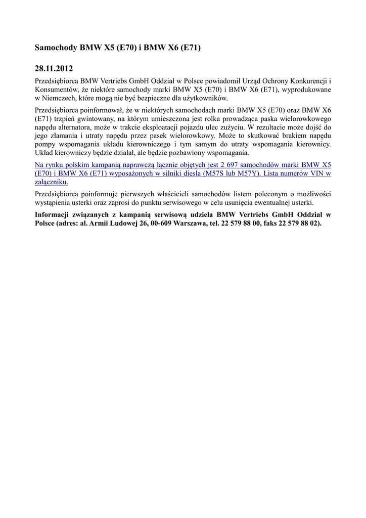 Samochody BMW X5 (E70) i BMW X6 (E71) 28.11.2012 Przedsiębiorca BMW Vertriebs GmbH Oddział w Polsce powiadomił Urząd Ochrony Konkurencji i Konsumentów, że niektóre samochody marki BMW X5 (E70) i BMW X6 (E71), wyprodukowane w Niemczech, które mogą nie być bezpieczne dla użytkowników. Przedsiębiorca poinformował, że w niektórych samochodach marki BMW X5 (E70) oraz BMW X6 (E71) trzpień gwintowany, na którym umieszczona jest rolka prowadząca paska wielorowkowego napędu alternatora, może w trakcie eksploatacji pojazdu ulec zużyciu. W rezultacie może dojść do jego złamania i utraty napędu przez pasek wielorowkowy. Może to skutkować brakiem napędu pompy wspomagania układu kierowniczego i tym samym do utraty wspomagania kierownicy. Układ kierowniczy będzie działał, ale będzie pozbawiony wspomagania. Na rynku polskim kampanią naprawczą łącznie objętych jest 2 697 samochodów marki BMW X5 (E70) i BMW X6 (E71) wyposażonych w silniki diesla (M57S lub M57Y). Lista numerów VIN w załączniku. Przedsiębiorca poinformuje pierwszych właścicieli samochodów listem poleconym o możliwości wystąpienia usterki oraz zaprosi do punktu serwisowego w celu usunięcia ewentualnej usterki. Informacji związanych z kampanią serwisową udziela BMW Vertriebs GmbH Oddział w Polsce (adres: al. Armii Ludowej 26, 00-609 Warszawa, tel. 22 579 88 00, faks 22 579 88 02).