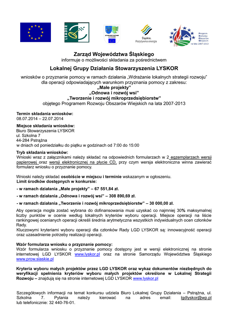 Zarząd Województwa Śląskiego informuje o możliwości składania za pośrednictwem Lokalnej Grupy Działania Stowarzyszenia LYSKOR wniosków o przyznanie pomocy w ramach działania „Wdrażanie lokalnych strategii rozwoju” dla operacji odpowiadających warunkom przyznania pomocy z zakresu: „Małe projekty” „Odnowa i rozwój wsi” „Tworzenie i rozwój mikroprzedsiębiorstw” objętego Programem Rozwoju Obszarów Wiejskich na lata 2007-2013 Termin składania wniosków: 08.07.2014 – 22.07.2014 Miejsce składania wniosków: Biuro Stowarzyszenia LYSKOR ul. Szkolna 7 44-284 Pstrążna w dniach od poniedziałku do piątku w godzinach od 7:00 do 15:00 Tryb składania wniosków: Wnioski wraz z załącznikami należy składać na odpowiednich formularzach w 2 egzemplarzach wersji papierowej oraz wersji elektronicznej na płycie CD, przy czym wersja elektroniczna winna zawierać formularz wniosku o przyznanie pomocy. Wnioski należy składać osobiście w miejscu i terminie wskazanym w ogłoszeniu. Limit środków dostępnych w konkursie: - w ramach działania „Małe projekty” – 67 551,84 zł. - w ramach działania „Odnowa i rozwój wsi” – 308 890,69 zł. - w ramach działania „Tworzenie i rozwój mikroprzedsiębiorstw” – 30 000,00 zł. Aby operacja mogła zostać wybrana do dofinansowania musi uzyskać co najmniej 30% maksymalnej liczby punktów w ocenie według lokalnych kryteriów wyboru operacji. Miejsce operacji na liście rankingowej ocenianych operacji określi średnia arytmetyczna wszystkich indywidualnych ocen członków Rady. Kluczowymi kryteriami wyboru operacji dla członków Rady LGD LYSKOR są: innowacyjność operacji oraz uzasadnienie potrzeby realizacji operacji. Wzór formularza wniosku o przyznanie pomocy: Wzór formularza wniosku o przyznanie pomocy dostępny jest w wersji elektronicznej na stronie internetowej LGD LYSKOR www.lyskor.pl oraz na stronie Samorządu Województwa Śląskiego www.prow.slaskie.pl Kryteria wyboru małych projektów przez LGD LYSKOR oraz wykaz dokumentów niezbędnych do weryfikacji spełnienia kryteriów wyboru małych projektów określone w Lokalnej Strategii Rozwoju – znajdują się na stronie internetowej LGD LYSKOR www.lyskor.pl Szczegółowych informacji na temat konkursu udziela Biuro Lokalnej Grupy Działania – Pstrążna, ul. Szkolna 7. Pytania należy kierować na adres email: [email protected] lub telefonicznie: 32 440-76-01.