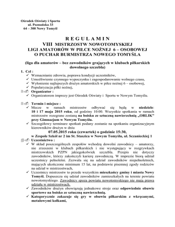 Ośrodek Oświaty i Sportu ul. Poznańska 33 64 – 300 Nowy Tomyśl REGULAMIN VIII MISTRZOSTW NOWOTOMYSKIEJ LIGI AMATORÓW W PIŁCE NOŻNEJ 6 – OSOBOWEJ O PUCHAR BURMISTRZA NOWEGO TOMYŚLA (liga dla amatorów – bez zawodników grających w klubach piłkarskich dowolnego szczebla) 1. Cel : Wzmacnianie zdrowia, poprawa kondycji uczestników, Umożliwienie czynnego wypoczynku i zagospodarowanie wolnego czasu, Wyłonienie najlepszych drużyn amatorskich w piłce nożnej 6 – osobowej, Popularyzacja piłki nożnej, Organizator : Organizatorem imprezy jest Ośrodek Oświaty i Sportu w Nowym Tomyślu. Termin i miejsce : Mecze w ramach mistrzostw odbywać się będą w niedziele: 10 i 17 maja 2015 roku, od godziny 10:00. Wszystkie spotkania w ramach mistrzostw rozegrane zostaną na boisku ze sztuczną nawierzchnią „ORLIK” przy Gimnazjum w Nowym Tomyślu. Szczegółowy terminarz spotkań podany zostanie na spotkaniu organizacyjnym kierowników drużyn w dniu 07.05.2015 roku (czwartek) o godzinie 15:30, w Zespole Szkół nr 2 im St. Staszica w Nowym Tomyślu, ul. Sczanieckiej 1 Uczestnictwo : W skład poszczególnych zespołów wchodzą dowolni zawodnicy – amatorzy, nie zrzeszeni w klubach piłkarskich i nie występujący w rozgrywkach mistrzowskich PZPN jakiegokolwiek szczebla. Przepis nie dotyczy zawodników, którzy zakończyli karierę zawodniczą. W imprezie biorą udział uczestnicy pełnoletni. Zezwala się na udział zawodników niepełnoletnich, mających ukończone minimum 15 lat, na podstawie pisemnej zgody rodziców na udział w mistrzostwach, Uczestnicy mistrzostw to przede wszystkim mieszkańcy gminy i miasta Nowy Tomyśl. Dopuszcza się udział zawodników zamieszkałych na terenie powiatu nowotomyskiego. Zawodnicy spoza powiatu nowotomyskiego nie mają prawa udziału w mistrzostwach. Zawodników drużyn obowiązują jednakowe stroje oraz odpowiednie obuwie sportowe na boisko ze sztuczną nawierzchnią. Kategorycznie zakazuje się gry w obuwiu piłkarskim z wkręcanymi, metalowymi kołkami, Drużyny liczą maksymalnie 10 zawodników, bezpośrednio na boisku w składach 6 osobowych (bramkarz i 5 zawodników w polu gry), 5. Sposób przeprowadzenia : System i terminarz rozgrywek zostanie ustalony na zebraniu organizacyjnym w dniu 07.05.2015 roku o godzinie 15:30, z udziałem kapitanów poszczególnych drużyn w Zespole Szkół nr 2 im St. Staszica w Nowym Tomyślu, ul. Sczanieckiej 1 Postanowienia regulaminowe turnieju : 1/ Czas trwania meczu wynosi 1 x 16 minut, 2/ W trakcie meczu można dokonać nieograniczoną ilość tzw. zmian hokejowych , 3/ Gra bez spalonego, 4/ Boisko o wymiarach 50 m x 30 m, 5/ Bramki o wymiarach 5m x 2m. 6/ W przypadku walkowera przyznaje się wynik 3 : 0 dla drużyny, która wstawiła się na spotkanie. Czas oczekiwania na zespół wynosi 5 minut. 7/ Rzut karny z odległości 9 m, 8/ Aut - wyrzucany rękoma zza głowy, 9/ W meczach pucharowych (konieczność wyłonienia zwycięzcy), zakończonych w regulaminowym czasie remisem, zarządza się rzuty karne, 10/ zabrania się wykonywania wślizgów, 11/ Za grę niesportową sędziowie karać będą wykluczeniami z gry : a) Żółta kartka – 3 minuty kary, możliwość wcześniejszego powrotu zawodnika na boisko po utracie bramki przez własny zespół b) Czerwona kartka – wykluczenie z gry do końca meczu, zespół do końca meczu gra w osłabieniu. Otrzymanie czerwonej kartki równoznaczne jest z wykluczeniem, odsunięciem zawodnika w następnym - jednym meczu. Zespół w tym meczu może grać w pełnym składzie z pominięciem zawodnika ukaranego czerwoną kartką. c) Dyskwalifikacja – za naganne zachowanie w stosunku do sędziów, przeciwników, organizatorów lub za otrzymanie drugiej czerwonej kartki w turnieju. Zawodnik ukarany dyskwalifikacją zostaje usunięty z turnieju. 12/ pozostałe zasady gry zgodne z obowiązującymi przepisami PZPN. 6. Punktacja : Za wygrany mecz - 3 punkty Za remis - 1 punkt Za mecz przegrany - 0 punktów 7. O kolejności zajętych miejsc w grupach decyduje : większa liczba zdobytych punktów, wynik bezpośredniego spotkania – (w przypadku dwóch zespołów z równą ilością punktów). lepsza różnica bramek między zainteresowanymi zespołami. lepsza różnica bramek z wszystkich meczy, większa liczba zdobytych bramek. rzuty karne. 8. Nagrody : Za zajęcie miejsc od I do IV puchary Zawodnicy zespołów, które zajmą I, II i III miejsce otrzymają stosownie złote, srebrne i brązowe medale. 9. Finansowanie: Każda ekipa wpłaca wpisowe na częściowe pokrycie kosztów organizacyjnych w wysokości 30,00 zł w kasie OOiS ul. Poznańska 33 do dnia 06 maja 2015 r. Pozostałe koszty organizacji imprezy ponosi organizator mistrzostw tj. Ośrodek Oświaty i Sportu w Nowym Tomyślu. 11. Zgłoszenia : Pisemne na kartach zgłoszeniowych Ośrodka z imiennym wykazem zawodników kierownicy ekip przedkładają organizatorowi ostatecznie do dnia 06 maja 2015 r. (środa) do godziny 15:00 w siedzibie Ośrodka Oświaty i Sportu, ul. Poznańska 33 , budynek Urzędu Gminy i Miasta na II piętrze z jednoczesnym uiszczeniem wpisowego w wysokości 30 zł od drużyny za cały cykl mistrzostw. Zgłoszenia drużyny można dokonać pocztą elektroniczną na adres: [email protected] Istnieje obowiązek używania polskich nazw zespołów pod rygorem odrzucenia zgłoszenia, Nazwy zespołów nie mogą być obraźliwe ani stanowić słów uważanych za nieparlamentarne, Drużyny nie zgłoszone w wyznaczonym terminie nie zostaną dopuszczone do zawodów, 12. Postanowienia końcowe : • Zawodnicy startują w zawodach na własną odpowiedzialność, • Organizatorzy nie ponoszą odpowiedzialności za stan zdrowia uczestników oraz urazy i kontuzje powstałe w trakcie trwania mistrzostw, • Organizatorzy nie ponoszą odpowiedzialności za rzeczy zawodników pozostawione w szatniach lub na obiekcie sportowym, • Organizatorzy zastrzegają sobie prawo ostatecznej interpretacji niniejs