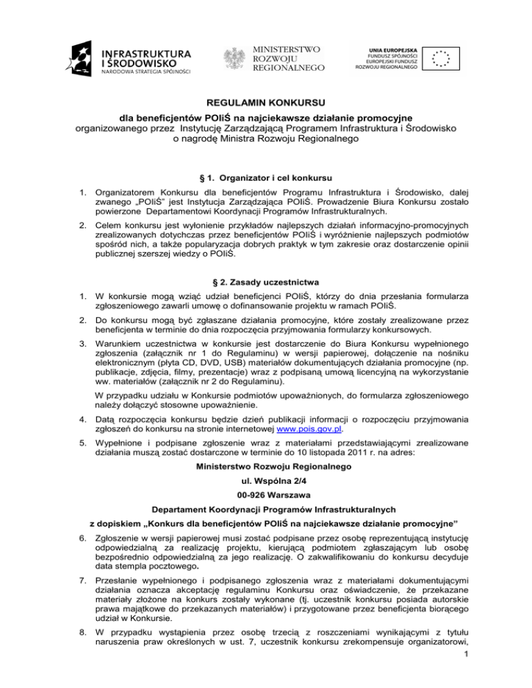 REGULAMIN KONKURSU dla beneficjentów POIiŚ na najciekawsze działanie promocyjne organizowanego przez Instytucję Zarządzającą Programem Infrastruktura i Środowisko o nagrodę Ministra Rozwoju Regionalnego § 1. Organizator i cel konkursu 1. Organizatorem Konkursu dla beneficjentów Programu Infrastruktura i Środowisko, dalej zwanego „POIiŚ” jest Instytucja Zarządzająca POIiŚ. Prowadzenie Biura Konkursu zostało powierzone Departamentowi Koordynacji Programów Infrastrukturalnych. 2. Celem konkursu jest wyłonienie przykładów najlepszych działań informacyjno-promocyjnych zrealizowanych dotychczas przez beneficjentów POIiŚ i wyróŜnienie najlepszych podmiotów spośród nich, a takŜe popularyzacja dobrych praktyk w tym zakresie oraz dostarczenie opinii publicznej szerszej wiedzy o POIiŚ. § 2. Zasady uczestnictwa 1. W konkursie mogą wziąć udział beneficjenci POIiŚ, którzy do dnia przesłania formularza zgłoszeniowego zawarli umowę o dofinansowanie projektu w ramach POIiŚ. 2. Do konkursu mogą być zgłaszane działania promocyjne, które zostały zrealizowane przez beneficjenta w terminie do dnia rozpoczęcia przyjmowania formularzy konkursowych. 3. Warunkiem uczestnictwa w konkursie jest dostarczenie do Biura Konkursu wypełnionego zgłoszenia (załącznik nr 1 do Regulaminu) w wersji papierowej, dołączenie na nośniku elektronicznym (płyta CD, DVD, USB) materiałów dokumentujących działania promocyjne (np. publikacje, zdjęcia, filmy, prezentacje) wraz z podpisaną umową licencyjną na wykorzystanie ww. materiałów (załącznik nr 2 do Regulaminu). W przypadku udziału w Konkursie podmiotów upowaŜnionych, do formularza zgłoszeniowego naleŜy dołączyć stosowne upowaŜnienie. 4. Datą rozpoczęcia konkursu będzie dzień publikacji informacji o rozpoczęciu przyjmowania zgłoszeń do konkursu na stronie internetowej www.pois.gov.pl. 5. Wypełnione i podpisane zgłoszenie wraz z materiałami przedstawiającymi zrealizowane działania muszą zostać dostarczone w terminie do 10 listopada 2011 r. na adres: Ministerstwo Rozwoju Regionalnego ul. Wspólna 2/4 00-926 Warszawa Departament Koordynacji Programów Infrastrukturalnych z dopiskiem „Konkurs dla beneficjentów POIiŚ na najciekawsze działanie promocyjne” 6. Zgłoszenie w wersji papierowej musi zostać podpisane przez osobę reprezentującą instytucję odpowiedzialną za realizację projektu, kierującą podmiotem zgłaszającym lub osobę bezpośrednio odpowiedzialną za jego realizację. O zakwalifikowaniu do konkursu decyduje data stempla pocztowego. 7. Przesłanie wypełnionego i podpisanego zgłoszenia wraz z materiałami dokumentującymi działania oznacza akceptację regulaminu Konkursu oraz oświadczenie, Ŝe przekazane materiały złoŜone na konkurs zostały wykonane (tj. uczestnik konkursu posiada autorskie prawa majątkowe do przekazanych materiałów) i przygotowane przez beneficjenta biorącego udział w Konkursie. 8. W przypadku wystąpienia przez osobę trzecią z roszczeniami wynikającymi z tytułu naruszenia praw określonych w ust. 7, uczestnik konkursu zrekompensuje organizatorowi, 1 jako podmiot wyłącznie odpowiedzialny, koszty poniesione w związku ze skierowaniem przeciwko niemu roszczeń odszkodowawczych, pokrywając wszelkie zobowiązania organizatora, jakie powstaną z tego tytułu. 9. Udział w konkursie jest bezpłatny i dobrowolny. § 3. Komisja konkursowa 1. W celu przeprowadzenia Konkursu powołuje się Komisję konkursową w składzie: 1) przewodniczący wyznaczony przez Instytucję Zarządzającą POIiŚ; 2) dwóch członków przedstawicieli Instytucji Zarządzającej POIiŚ (jeden z nich pełnił będzie rolę sekretarza Komisji); 3) sześciu członków przedstawicieli Instytucji Pośredniczącej dla kaŜdego sektora POIiŚ. 2. Zadaniem Komisji konkursowej jest: 1) kwalifikacja do oceny nadesłanych prac (sprawdzenie formalnej zgodności złoŜonych prac); 2) ocena nadesłanych prac; 3) wyłonienie laureatów i przyznanie nagród. 3. Wybór laureatów jest dwuetapowy. Pierwszym etapem jest preselekcja zgłoszeń, która zostanie dokonana przez Sekretarza i wskazanego przez Przewodniczącego członka Komisji. Po dokonaniu oceny zgłoszeń pod względem stopnia spełniania kryteriów wskazanych w § 4. ust. 2 wyłonione zostaną 3 najlepsze projekty w kaŜdej z kategorii, które będą zakwalifikowane do kolejnego etapu. W dalszym etapie Komisja zebrana w pełnym składzie na podstawie wyniku głosowania ustala listę laureatów. 4. Komisja konkursowa moŜe przyznać dodatkowe wyróŜnienia specjalne, w tym wyróŜnienie za najbardziej kompleksową kampanię z wykorzystaniem wszystkich ocenianych kanałów komunikacji. 5. Komisja konkursowa ma prawo nie przyznać nagrody głównej. 6. Decyzje Komisji konkursowej są ostateczne i nie przysługuje od nich odwołanie. 7. Komisja moŜe podjąć decyzję o uchwaleniu regulaminu prac wewnętrznych. § 4. Kryteria oceny 1. Działania promocyjne będą podlegać ocenie w ramach pięciu kategorii w zaleŜności od typu zrealizowanych działań informacyjno-promocyjnych: 1) Internet, strony internetowe, media społecznościowe; 2) Spot reklamowy, radiowy lub telewizyjny, audycje tematyczne, etiuda filmowa; 3) Publikacje, artykuły prasowe, broszury; 4) Wydarzenia eventowe, akcje edukacyjne (z wyłączeniem konferencji); 5) Inne działania (z wyłączeniem działań standardowych tj. m.in. tablic informacyjnych, gadgetów). 2. Ocena przedstawionych zgłoszeń dokonywana będzie na podstawie następujących kryteriów merytorycznych: 1) Adekwatność i pomysłowość zastosowanych form promocji oraz dobór mediów. Ocenie podlega dobór narzędzi promocyjnych i mediów pod kątem załoŜonych celów i grup docelowych oraz oryginalność uŜytych sposobów komunikacji z tym grupami; 2) Kreacja. Ocenie podlega koncepcja działań promocyjnych (idea przewodnia i wizualizacja) oraz jakość wykonania produktów wykor