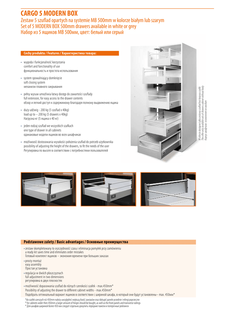 CARGO 5 MODERN BOX Zestaw 5 szuflad opartych na systemie MB 500mm w kolorze białym lub szarym Set of 5 MODERN BOX 500mm drawers available in white or grey Набор из 5 ящиков MB 500мм, цвет: белый или серый Cechy produktu / Features / Характеристика товара: • system spowalniający domknięcie soft closing system механизм плавного закрывания • pełny wysuw umożliwia łatwy dostęp do zawartości szuflady full extension, for easy access to the drawer contents обзор и легкий доступ к содержимому благодаря полному выдвижению ящика • duży udźwig - 200 kg (5 szuflad x 40kg) load up to – 200 kg (5 drawers x 40kg) Нагрузка кг (5 ящика х 40 кг) • jeden rodzaj szuflad we wszystkich szafkach one type of drawer in all cabinets одинаковые модели ящиков во всех шкафчиках • możliwoość dostosowania wysokości położenia szuflad do potrzeb użytkownika possibility of adjusting the height of the drawers, to fit the needs of the user Регулировка по высоте в соответствии с потребностями пользователей Podstawowe zalety / Basic advantages / Основные преимущества •zestaw skompletowany to oszczędnoość czasu i eliminacja pomyłek przy zamówieniu a ready kit saves time and eliminates order mistakes Готовый комплект ящиков – экономия времени при больших заказах •prosty montaż easy assembly Простая установка •regulacja w dwóch płaszczyznach full adjustment in two dimensions регулировка в двух плоскостях •możliwoość dopasowania szuflad do różnych szerokości szafek - max.450mm* Possibility of adjusting the drawer to different cabinet widths - max.450mm* Подобрать оптимальный вариант ящиков в соответствии с шириной шкафа, в который они будут установлены– max. 450мм* *do szafek szerszych niż 450mm należy uwzględnić większą iloość zawiasów oraz dokupić panele przednie i relingi poprzeczne * for cabinets wider then 450mm a larger amount of hinges should be bought, as well as the front panels and transverse railings * Для шкафов шириной более 450 мм следует отдельно докупить передние панели и поперечные рейлинги W ofercie dostępne tylko zestawy szuflad bez korpusu szafki The offer only available sets of drawers cabinet without body Корпус шкафчика в комплект не входит • wygoda i funkcjonalność korzystania comfort and functionality of use функциональность и простота использования Informacje montażowe/ mounting information / Особенности сборки и монтажа min. 352 32 Zawiasy w zestawie/ hinges included/ Петли прилагаются 352 32 1427 min. 1700 288 608 1075 MB 32 787 416 352 MB MB 435 32 5 ø3 MB 37 287 384 ø5 33 MB 51 0 18 0 . Panel przedni oraz reling poprzeczny do przycięcia Przykład planowania rozstawu szuflad do szafki o wysokości min. 1700 mm przy użyciu 4 (dostarczany w odcinkach 1100 mm). zawiasów/ Takie rozwiązanie daje możliwość indywidualnego Spacing between drawers example, in a cabinet at least 1700mm high, using 4 hinges/ dopasowania szuflady do szerokości korpusu. Расстояние между боковинами ящиками и корпусом шкафа высотой как минимум Front panel and transverse railing, are delivered in 1100mm 1700 мм с использованием четырех петель long pieces. This gives a possibility, for individual adjustment of the drawer, to different cabinet widths. Панель и поперечные рейлинги можно обрезать (изначальная длина 1100 мм). Wymiary elementów ścianki tylnej i dna szuflady dla płyty 16mm Mounting dimensions of drawer back and bottom for 16 mm board Монтажные размеры задней стенки и дна ящика для плиты 16 мм LW -7 LW -75 4 B LW B -97 199 A LW A LW -9 -98 7 1 LW 5 NL+ LW - 86 4 -2 NL LW - Wewnętrzna szerokość korpusu/ Body internal width/ Внутренняя ширина корпуса NL - Długość nominalna prowadnicy/ Nominal length Bearings/ Номинальная длина Wersje zestawów/ Set versions/ Варианты комплектации 1 kpl. relingów 1 set of rails 1 комплект рейлингов szary/grey/ серый biały/ white/ белый Cargo 5 z szufladami MB / L500 / 40 kg CARGO with 5 drawers MB / L500 / 40 kg Cargo 5 c ящиками МB / L500 / 40 кг Modern Box, 500mm, wysoki, 40 kg Modern Box Square, 500mm, high, 40 kg Modern Box, 500мм, высокий, 40 кг Złączka frontu wewnętrznego, wysoka Inner front connector, high Соединитель фронта внутренний, высокий Panel przedni do szuflady wewnętrznej, 1100 mm Front panel for inner drawer 1100 mm Передняя панель для внутренней шуфляды 1100 мм Reling poprzeczny, 1100 mm Transverse railing Relling 1100 mm Поперечный релинг 1100 мм Reling wzdłużny 500 mm Longitudinal rail 500 mm Продольный рейлинг 500 мм Zawias hydrauliczny 155°, z prowadnikiem EURO GTV hinge 1550 , hydraulic Угловая петля GTV 1550 2 kpl. relingów 2 sets of rails 2 комплекта рейлингов szary/grey/ серый biały/ white/ белый 5 kpl. PB-D-KPL500C PB-D-KPL500C1 PB-D-KPL500C PB-D-KPL500C1 5 kpl. PB-D-WEWSZKLC PB-D-WEWSZKLC-10 PB-D-WEWMOCC PB-D-WEWMOCC1 2 szt. PB-D-PANELWEW PB-D-PANELWEW-10 PB-D-PANELWEW PB-D-PANELWEW-10 2 szt.
