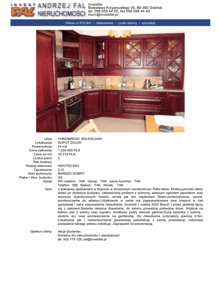 Investfal Bolesława Krzywoustego 35, 80-360 Gdańsk tel. 058 558 44 55, fax 058 558 44 40 [email protected] Oferta nr IF01441 - Mieszkanie - rynek wtorny - sprzedaż Ulica: Lokalizacja: Powierzchnia: Cena całkowita: Cena za m2: Liczba pokoi: Rok budowy: Rodzaj własności: Ogrzewanie: Stan techniczny: Piętro / Wys. budynku: Opcje: Opis: Opiekun oferty: CHROBREGO BOLESŁAWA SOPOT DOLNY 74 m2 1 200 000 PLN 16 216 PLN 3 HIPOTECZNY C.O. BARDZO DOBRY 3\2 WC osobno: TAK Garaż: TAK Jasna kuchnia: TAK Telefon: NIE Balkon: TAK Winda: TAK 3 pokojowy apartament w Sopocie w strzeżonym kondominium Patio Mare. Ekskluzywność oferty widać po stylistyce budynku, całodobowej portierni z ochroną, własnym ogrodem japońskim oraz wzorowo wykończonymi holami, windą jak też zapleczem fitnes-center(siłownia, sauna, pomieszczenie do relaksu).Użytkownik w cenie ma zagwarantowane dwa miejsca w hali garażowej i caŁe wyposażenie mieszkania. Kuchnia ( rustika AGD Bosch ) przez jadalnię łączy się z salonem.Stolarka okienna drewniana, do salonu prowadzą podwójne drzwi. Wyjście na balkon jest z salonu oraz sypialni, środkowy pokój stanowi gabinet.Duża łazienka z wanną , osobno wc, oraz pomieszczenie na garderobę. Do mieszkania przynależy piwnica 4,5m. Lokalizacja jak i nasłonecznienie gwarantują satysfakcję z samej prezentacji, natomiast posiadanie takiego adresu nobilituje. Zapraszam na prezentację. Alicja Dudaniec Doradca d/s nieruchomości i ubezpieczeń tel. 502 775 125, [email protected]