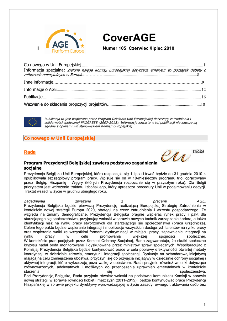 CoverAGE I Numer 105 Czerwiec /lipiec 2010 Co nowego w Unii Europejskiej ................................................................................................................... 1 Informacja specjalna: Zielona Księga Komisji Europejskiej dotycząca emerytur to początek debaty o reformach emerytalnych w Europie…………….........................................................................................8 Inne informacje.....................................................................................................................9 Informacje o AGE......................................................................................................................................... 12 Publikacje ...................................................................................................................................................... 16 Wezwanie do składania propozycji projektów.........................................................................................18 Publikacja ta jest wspierana przez Program Działania Unii Europejskiej dotyczący zatrudnienia i solidarności społecznej PROGRESS (2007-2013). Informacje zawarte w tej publikacji nie zawsze są zgodne z opiniami lub stanowiskiem Komisji Europejskiej Co nowego w Unii Europejskiej Rada Program Prezydencji Belgijskiej zawiera podstawo zagadnienia socjalne Prezydencja Belgijska Unii Europejskiej, która rozpoczęła się 1 lipca i trwać będzie do 31 grudnia 2010 r. opublikowała szczegółowy program pracy. Wpisuje się on w 18-miesięczny programu trio, opracowany przez Belgię, Hiszpanię i Węgry (których Prezydencja rozpocznie się w przyszłym roku). Dla Belgii priorytetem jest wdroŜenie traktatu lizbońskiego, który upraszcza procedury Unii w podejmowaniu decyzji. Traktat wszedł w Ŝycie w grudniu ubiegłego roku. Zagadnienia związane z pracami AGE. Prezydencja Belgijska będzie pierwszą Prezydencję realizującą Europejską Strategię Zatrudnienia w kontekście nowej strategii Europa 2020, strategii na rzecz zatrudnienia i wzrostu gospodarczego. Ze względu na zmiany demograficzne, Prezydencja Belgijska pragnie wspierać rynek pracy i pakt dla starzejącego się społeczeństwa, przyjmując wnioski w sprawie nowych technik zarządzania karierą, a takŜe identyfikacji nisz na rynku pracy stworzonych dla starzejącego się społeczeństwa (praca urzędnicza). Celem tego paktu będzie wspieranie integracji i mobilizacja wszystkich dostępnych talentów na rynku pracy oraz wspieranie walki ze wszystkimi formami dyskryminacji w miejscu pracy, zapewnienie integracji na rynku pracy w celu promowania większej spójności społecznej. W kontekście prac podjętych przez Komitet Ochrony Socjalnej, Rada zagwarantuje, Ŝe skutki społeczne kryzysu nadal będą monitorowane i dyskutowane przez ministrów spraw społecznych. Współpracując z Komisją, Prezydencja Belgijska będzie kontynuować prace w celu poprawy efektywności otwartej metody koordynacji w dziedzinie zdrowia, emerytur i integracji społecznej. Dyskusje na sztandarową inicjatywą mającą na celu zmniejszenia ubóstwa, przyczyni się do przyjęcia inicjatywy w dziedzinie ochrony socjalnej i aktywnej integracji, które wykraczają poza walkę z ubóstwem. Rada przyjmie równieŜ wnioski dotyczące zrównowaŜonych, adekwatnych i moŜliwych do przenoszenia uprawnień emerytalnych w kontekście starzenia się społeczeństwa. Pod Prezydencją Belgijską, Rada przyjmie równieŜ wnioski na podstawie komunikatu Komisji w sprawie nowej strategii w sprawie równości kobiet i męŜczyzn (2011-2015) i będzie kontynuować prace Prezydencji Hiszpańskiej w sprawie projektu dyrektywy wprowadzającej w Ŝycie zasady równego traktowania osób bez 1 względu na religię, niepełnosprawność, wiek lub Portal prezydencji Belgijskiej: http://www.eutrio.be/ Program pracy Prezydencji Belgijskiej: http://www.eu2010.be/files/bveu/media/documents/Programme_EN.pdf orientację seksualną Aktualizacja stanu pracy nad projektem horyzontalnej dyrektywy w sprawie ochrony przed dyskryminacją ze względu na religię lub światopogląd, niepełnosprawność, wiek lub orientację seksualną na obszarach poza rynkiem pracy Na podstawie sprawozdania z postępu prac, Hiszpańska Prezydencja poinformowała Radę o dyskusji na temat projektu dyrektywy w sprawie wprowadzenia w Ŝycie zasady równego traktowania osób bez względu na religię lub światopogląd, niepełnosprawność, wiek lub orientację seksualną. Prezydencja Hiszpańska złoŜyła szereg wstępnych propozycji dotyczących zakresu dyrektywy, podziału kompetencji między UE i państwami członkowskimi, oraz przepisów dotyczących niepełnosprawności. W szczególności, sugestie Prezydencji to dostosowanie tekstu do Traktatu o funkcjonowaniu Unii Europejskiej, w celu lepszego zdefiniowania pojęcia dyskryminacji, sprecyzowanie zakresu dyrektywy oraz o określenie, bardziej precyzyjnie, przepisów dotyczących niepełnosprawności. Pomimo pewnego postępu, w wielu kwestiach dalsze dyskusje są potrzebne. NaleŜą do nich podział kompetencji między państwami członkowskimi a UE, szczegółowe przepisy dotyczące niepełnosprawności (np. zakresu stosowania dyrektywy, jej skutków finansowych i praktycznych oraz wzajemne powiązania między dyrektywą i bardziej szczegółowymi specyfikacjami sektorowymi), kalendarz realizacji i wyjaśnienie problemów prawnych. Wnioski Komisji: http://register.consilium.europa.eu/pdf/en/08/st11/st11531.en08.pdf Główne wyniki Spotkania Rady EPSCO, w dniach 7-8 czerwca 2010, wskazują duŜe zainteresowanie kwestią starzenia się wśród ministrów UE Posiedzenie Rady Unii Europejskiej (EPSCO - Zatrudnienia, Polityki Społecznej, Zdrowia i Ochrony Konsumentów), które odbyło się w Luksemburgu w dniach 7 i 8 czerwca, wykazało duŜe zainteresowanie kwestią starzenia się wśród Ministrów pracy i ubezpieczeń społecznych EU27. Przyjęto w