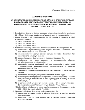 Warszawa, 22 kwietnia 2016 r. ZAPYTANIE OFERTOWE NA DZIERŻAWĘ BOISKA DZIELNICOWEGO OŚRODKA SPORTU i REKREACJI PRAGA-PÓŁNOC M.ST. WARSZAWY PRZY UL. KAWĘCZYŃSKIEJ 44 W WARSZAWIE Z PRZEZNACZENIEM NA SEZONOWY MONTAŻ HALI PNEUMATYCZNEJ (BALON) 1. Przedmiotem dzierżawy będzie boisko ze sztucznej nawierzchni o wymiarach 96 x 62 m = 5952 m.kw, położone w Warszawie przy ul. Kawęczyńskiej 44. 2. Okres dzierżawy: od 15 października do 15 kwietnia (6 miesięcy w roku) w kolejnych 3 latach, tj. 1) 15.10.2016-15.04.2017 2) 15.10.2017-15.04.2018 3) 15.10.2018-15.04.2019 3. W ramach dzierżawy Dzierżawca zobowiązany będzie w szczególności do: 1) przedłożenia Wydzierżawiającemu projektu montażu i demontażu hali oraz składowania hali poza sezonem; 2) sfinansowania we własnym zakresie zakupu, montażu i demontażu hali pneumatycznej w każdym sezonie; 3) uiszczania czynszu dzierżawnego w okresach miesięcznych; 4) składowania hali poza sezonem w pomieszczeniu własnym lub w kontenerze na terenie ośrodka; 5) ponoszenia kosztów eksploatacji hali oraz korzystania z szatni, toalet i pomieszczenia administracyjnego, zlokalizowanych w budynku administracyjnym DOSiR; 6) zapewnienia odpowiedniej temperatury w hali, nie mniej niż 8°C w każdym sezonie; 7) zapewnienia ochrony fizycznej obiektu w trakcie trwania zajęć; 8) przestrzegania obowiązujących przepisów w zakresie eksploatacji i nadzoru nad prawidłowym korzystaniem z hali, wynikających z ustawy o prawie budowlanym, 9) zorganizowania 6 turniejów gry w piłce nożnej, po 6 h w każdym miesiącu dla mieszkańców m.st. Warszawy w tym dzielnicy Praga-Północ. 10) nieodpłatne udostępnianie hali, w każdym miesiącu, w dni robocze w godz. 8.00 – 15.00 dla uczniów Szkół Praskich. 4. W ramach dzierżawy Dzierżawca będzie uprawniony do: 1) wyłącznego używania boiska w okresie dzierżawy w każdym sezonie objętym umową; 2) pobierania opłat od użytkowników hali w okresie objętym dzierżawą w każdym sezonie; 3) nieodpłatnego korzystania z parkingów zewnętrznego i wewnętrznego ośrodka, dla uczestników zajęć i własnych potrzeb; 5. Ofertę należy złożyć w sekretariacie Dzielnicowego Ośrodka Sportu i Rekreacji przy ul. Kawęczyńskiej 44 I p Termin składania ofert upływa w dniu 9 maja 2016 r. godz. 12.00 Dyrektor DOSiR Zbigniew Korcz
