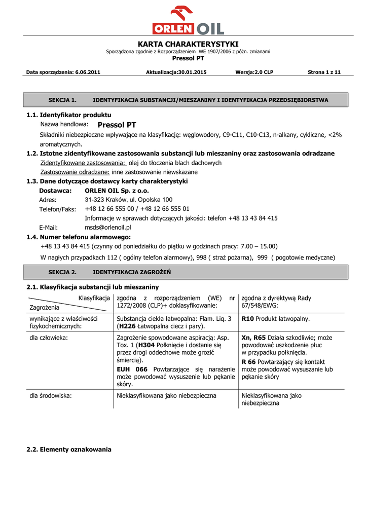 KARTA CHARAKTERYSTYKI Sporządzona zgodnie z Rozporządzeniem WE 1907/2006 z póżn. zmianami Pressol PT Data sporządzenia: 6.06.2011 SEKCJA 1. Aktualizacja:30.01.2015 Wersja:2.0 CLP Strona 1 z 11 IDENTYFIKACJA SUBSTANCJI/MIESZANINY I IDENTYFIKACJA PRZEDSIĘBIORSTWA 1.1. Identyfikator produktu Nazwa handlowa: Pressol PT Składniki niebezpieczne wpływające na klasyfikację: węglowodory, C9-C11, C10-C13, n-alkany, cykliczne, <2% aromatycznych. 1.2. Istotne zidentyfikowane zastosowania substancji lub mieszaniny oraz zastosowania odradzane Zidentyfikowane zastosowania: olej do tłoczenia blach dachowych Zastosowanie odradzane: inne zastosowanie niewskazane 1.3. Dane dotyczące dostawcy karty charakterystyki Dostawca: Adres: ORLEN OIL Sp. z o.o. 31-323 Kraków, ul. Opolska 100 Telefon/Faks: +48 12 66 555 00 / +48 12 66 555 01 Informacje w sprawach dotyczących jakości: telefon +48 13 43 84 415 E-Mail: [email protected] 1.4. Numer telefonu alarmowego: +48 13 43 84 415 (czynny od poniedziałku do piątku w godzinach pracy: 7.00 – 15.00) W nagłych przypadkach 112 ( ogólny telefon alarmowy), 998 ( straż pożarna), 999 ( pogotowie medyczne) SEKCJA 2. IDENTYFIKACJA ZAGROŻEŃ 2.1. Klasyfikacja substancji lub mieszaniny Klasyfikacja Zagrożenia zgodna z rozporządzeniem (WE) 1272/2008 (CLP)+ doklasyfikowanie: nr wynikające z właściwości fizykochemicznych: Substancja ciekła łatwopalna: Flam. Liq. 3 (H226 Łatwopalna ciecz i pary). R10 Produkt łatwopalny. dla człowieka: Zagrożenie spowodowane aspiracją: Asp. Tox. 1 (H304 Połknięcie i dostanie się przez drogi oddechowe może grozić śmiercią). Xn, R65 Działa szkodliwie; może powodować uszkodzenie płuc w przypadku połknięcia. EUH 066 Powtarzające się narażenie może powodować wysuszenie lub pękanie skóry. dla środowiska: 2.2. Elementy oznakowania Nieklasyfikowana jako niebezpieczna zgodna z dyrektywą Rady 67/548/EWG: R 66 Powtarzający się kontakt może powodować wysuszanie lub pękanie skóry Nieklasyfikowana jako niebezpieczna KARTA CHARAKTERYSTYKI Sporządzona zgodnie z Rozporządzeniem WE 1907/2006 z póżn. zmianami Pressol PT Data sporządzenia: 6.06.2011 Aktualizacja:30.01.2015 Wersja:2.0 CLP Strona 2 z 11 Piktogram: Hasło ostrzegawcze: Niebezpieczeństwo Zawiera: Węglowodory ,C9-C11, C10-C13, n-alkany, izoalkany, cykliczne, <2% aromatyczne Zwroty wskazujące rodzaj zagrożenia: H226 Łatwopalna ciecz i pary. H304 Połknięcie i dostanie się przez drogi oddechowe może grozić śmiercią. EUH 066 Powtarzające się narażenie może powodować wysuszenie lub pękanie skóry. Zwroty wskazujące środki ostrożności: P210 Przechowywać z dala od źródeł ciepła/iskrzenia/ otwartego ognia/gorących powierzchni. Palenie Palenie wzbronione. P280 Stosować rękawice ochronne/odzież ochronną/ ochronę oczu/ochronę twarzy P301+P310 W PRZYPADKU POŁKNIĘCIA: Natychmiast skontaktować się z OŚRODKIEM ZATRUĆ lub z lekarzem. P331 NIE wywoływać wymiotów. P405 Przechowywać pod zamknięciem. P501 Zawartość/pojemnik usuwać do firm posiadających odpowiednie uprawnienia. 2.3. Inne zagrożenia Brak danych na temat spełnienia kryteriów PBT lub vPvB zgodnie z załącznikiem XIII rozporządzenia REACH. Pary tworzą z powietrzem mieszaniny wybuchowe. Wrażliwy na wyładowania elektrostatyczne. SEKCJA 3. SKŁAD/INFORMACJA O SKŁADNIKACH 3.1. Substancje- nie dotyczy 3.2. Mieszaniny Niebezpieczne składniki, zakresy ich stężeń w mieszaninie: Nazwa substancji/ Nr rejestracji REACH Węglowodory , C10-C13, nalkany, izoalkany, cykliczne, <2% aromatyczne Nr CAS / Nr WE Nr indeksowy % wag. Klasyfikacja wg 67/548/EWG Klasyfikacja wg 1272/2008 (CLP) 918-481-9 -- > 80 Xn; R65,R66 Asp.Tox. 1;H304 919-857-5 -- <20 Xn :R65,R66, R67 Flam.Liq. 3;H226 Asp.Tox.1;H304 STOT SE 3;H336 EUH 066 01-2119457273-39- XXXX Węglowodory , C9-C11, nalkany, izoalkany, cykliczne, <2% aromatów 01-2119463258-33-XXXX Opis zwrotów R,H oraz pełne brzmienie klasyfikacji podano w Sekcji 16. KARTA CHARAKTERYSTYKI Sporządzona zgodnie z Rozporządzeniem WE 1907/2006 z póżn. zmianami Pressol PT Data sporządzenia: 6.06.2011 SEKCJA 4. Aktualizacja:30.01.2015 Wersja:2.0 CLP Strona 3 z 11 ŚRODKI PIERWSZEJ POMOCY 4.1. Opis środków pierwszej pomocy Wdychanie: Poszkodowanego usunąć (wyprowadzić/wynieść) z miejsca narażenia na świeże powietrze; zapewnić spokój i ciepło, rozluźnić uciskające części ubrania. Nieprzytomnego ułożyć w pozycji bocznej ustalonej; kontrolować i utrzymywać drożność dróg oddechowych. W przypadku zaburzeń w oddychaniu podawać tlen, w przypadku braku oddechu stosować sztuczne oddychanie. W przypadku utraty przytomności, zaburzeń oddychania lub utrzymującego się złego samopoczucia natychmiast zapewnić pomoc lekarską. Kontakt ze skórą: Natychmiast zdjąć zanieczyszczoną/nasiąkniętą odzież i buty. Zanieczyszczoną skórę umyć dokładnie wodą z mydłem lub łagodnym detergentem, a następnie spłukać dużą ilością wody. W przypadku wystąpienia i utrzymywania się objawów podrażnienia skonsultować się z lekarzem. UWAGA: Zanieczyszczoną/nasiąkniętą odzież usunąć w bezpieczne miejsce z dala od źródeł ciepła i źródeł zapłonu. Kontakt z oczami: Zanieczyszczone oczy natychmiast płukać ciągłym strumieniem wody, usunąć szkła kontaktowe (jeśli są) i kontynuować płukanie przez ok. 15 minut. Podczas płukania trzymać powieki szeroko rozwarte i poruszać gałką oczną. W przypadku wystąpienia i utrzymywania się objawów podrażnienia skonsultować się z lekarzem. UWAGA: Nie stosować zbyt silnego strumienia wody, aby nie uszkodzić rogówki. Połknięcie: Natychmiast zapewnić pomoc medyczną. NIE prowokować wymiotów – niebezpieczeństwo aspiracji do płuc. W przypadku wystąpienia naturalnych odruchowych wymiotów trzymać poszkodowanego w pozycji nachylonej do przodu. W przypadku wystąpienia duszności podawać tlen do oddychania. 4.2. Najważniejsze