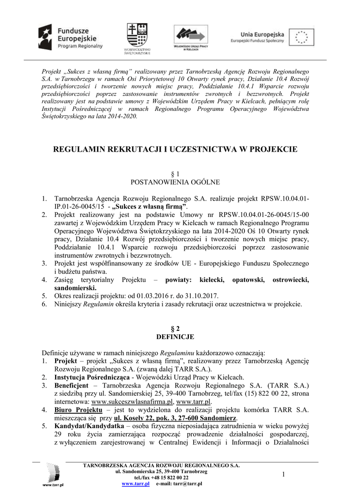 Projekt „Sukces z własną firmą” realizowany przez Tarnobrzeską Agencję Rozwoju Regionalnego S.A. w Tarnobrzegu w ramach Osi Priorytetowej 10 Otwarty rynek pracy, Działanie 10.4 Rozwój przedsiębiorczości i tworzenie nowych miejsc pracy, Poddziałanie 10.4.1 Wsparcie rozwoju przedsiębiorczości poprzez zastosowanie instrumentów zwrotnych i bezzwrotnych. Projekt realizowany jest na podstawie umowy z Wojewódzkim Urzędem Pracy w Kielcach, pełniącym rolę Instytucji Pośredniczącej w ramach Regionalnego Programu Operacyjnego Województwa Świętokrzyskiego na lata 2014-2020. REGULAMIN REKRUTACJI I UCZESTNICTWA W PROJEKCIE §1 POSTANOWIENIA OGÓLNE 1. 2. 3. 4. 5. 6. Tarnobrzeska Agencja Rozwoju Regionalnego S.A. realizuje projekt RPSW.10.04.01IP.01-26-0045/15 - „Sukces z własną firmą”. Projekt realizowany jest na podstawie Umowy nr RPSW.10.04.01-26-0045/15-00 zawartej z Wojewódzkim Urzędem Pracy w Kielcach w ramach Regionalnego Programu Operacyjnego Województwa Świętokrzyskiego na lata 2014-2020 Oś 10 Otwarty rynek pracy, Działanie 10.4 Rozwój przedsiębiorczości i tworzenie nowych miejsc pracy, Poddziałanie 10.4.1 Wsparcie rozwoju przedsiębiorczości poprzez zastosowanie instrumentów zwrotnych i bezzwrotnych. Projekt jest współfinansowany ze środków UE - Europejskiego Funduszu Społecznego i budżetu państwa. Zasięg terytorialny Projektu – powiaty: kielecki, opatowski, ostrowiecki, sandomierski. Okres realizacji projektu: od 01.03.2016 r. do 31.10.2017. Niniejszy Regulamin określa kryteria i zasady rekrutacji oraz uczestnictwa w projekcie. §2 DEFINICJE Definicje używane w ramach niniejszego Regulaminu każdorazowo oznaczają: 1. Projekt – projekt „Sukces z własną firmą”, realizowany przez Tarnobrzeską Agencję Rozwoju Regionalnego S.A. (zwaną dalej TARR S.A.). 2. Instytucja Pośrednicząca - Wojewódzki Urząd Pracy w Kielcach. 3. Beneficjent – Tarnobrzeska Agencja Rozwoju Regionalnego S.A. (TARR S.A.) z siedzibą przy ul. Sandomierskiej 25, 39-400 Tarnobrzeg, tel/fax (15) 822 00 22, strona internetowa: www.sukceszwlasnafirma.pl, www.tarr.pl. 4. Biuro Projektu – jest to wydzielona do realizacji projektu komórka TARR S.A. mieszcząca się przy ul. Koseły 22, pok. 3, 27-600 Sandomierz. 5. Kandydat/Kandydatka – osoba fizyczna nieposiadająca zatrudnienia w wieku powyżej 29 roku życia zamierzająca rozpocząć prowadzenie działalności gospodarczej, z wyłączeniem zarejestrowanej w Centralnej Ewidencji i Informacji o Działalności TARNOBRZESKA AGENCJA ROZWOJU REGIONALNEGO S.A. ul. Sandomierska 25, 39-400 Tarnobrzeg tel./fax +48 15 822 00 22 www.tarr.pl e-mail: [email protected] 1 Gospodarczej, Krajowym Rejestrze Sądowym, lub prowadzącej działalność na podstawie odrębnych przepisów w okresie 12 miesięcy poprzedzających dzień przystąpienia do projektu. 6. Uczestnik/Uczestniczka projektu – Kandydat/Kandydatka, który zostanie zakwalifikowany do Projektu, zgodnie z zasadami określonymi w niniejszym Regulaminie. 7. Osoba bezrobotna – to osoba pozostające bez pracy, gotowa do podjęcia pracy i aktywnie poszukująca zatrudnienia. Definicja uwzględnia osoby zarejestrowane jako bezrobotne w Powiatowych Urzędach Pracy. Osobami bezrobotnymi są zarówno osoby bezrobotne w rozumieniu badania aktywności ekonomicznej ludności (tj. są to osoby, które spełniły jednocześnie trzy warunki: w okresie badanego tygodnia nie były osobami pracującymi , aktywnie poszukiwały pracy, tzn. podjęły konkretne działania w ciągu 4 tygodni (wliczając jako ostatni – tydzień badany), aby znaleźć pracę, były gotowe (zdolne) podjąć pracę w ciągu dwóch tygodni następujących po tygodniu badanym), jak i osoby zarejestrowane jako bezrobotne. Definicja nie uwzględnia studentów studiów stacjonarnych, nawet jeśli spełniają powyższe kryteria. Osoby kwalifikujące się do urlopu macierzyńskiego lub rodzicielskiego, które są bezrobotne w rozumieniu niniejszej definicji (nie pobierają świadczeń z tytułu urlopu), są również osobami bezrobotnymi, 8. Osoba bierna zawodowo – to osoba, która w danej chwili nie tworzy zasobów siły roboczej (tzn. nie pracuje i nie jest bezrobotna). Studenci studiów stacjonarnych są uznawani za osoby bierne zawodowo. Osoby będące na urlopie wychowawczym (rozumianym jako nieobecność w pracy, spowodowana opieką nad dzieckiem w okresie, który nie mieści się w ramach urlopu macierzyńskiego lub urlopu rodzicielskiego), są uznawane za bierne zawodowo, chyba że są zarejestrowane już jako bezrobotne (wówczas status bezrobotnego ma pierwszeństwo). Osoby prowadzące działalność na własny rachunek (w tym członek rodziny bezpłatnie pomagający osobie prowadzącej działalność) nie są uznawane za bierne zawodowo. 9. Osoba długotrwale bezrobotna – to osoba bezrobotna nieprzerwanie przez okres ponad 12 miesięcy. 10. Osoba o niskich kwalifikacjach – osoba posiadająca wykształcenie na poziomie do ISCED 3 tj. najwyżej wykształcenie ponadgimnazjalne/średnie. 11. Dzień przystąpienia do Projektu – dzień złożenia przez Kandydata/Kandydatkę Dokumentów rekrutacyjnych osobiście w Biurze Projektu lub data wpływu Dokumentów przekazanych drogą pocztową/kurierem do Biura Projektu, 12. Dokumenty rekrutacyjne – komplet dokumentów, który należy złożyć w Biurze Projektu, w terminie podanym w ogłoszeniu o naborze. 13. Komisja Rekrutacyjna – zespół ekspertów wewnętrznych powołanych przez Zarząd TARR S.A. oceniający Dokumenty rekrutacyjne do Projektu i dokonujący kwalifikacji Kandydatów na Uczestników projektu. 14. Beneficjent Pomocy – Uczestnik/Uczestniczka projektu, który założy działalność gospodarczą i otrzyma wsparcie finansowe. TARNOBRZESKA AGENCJA ROZWOJU REGIONALNEGO S.A. ul. Sandomierska 25, 39-400 Tarnobrzeg tel./fax +48 15 822 00 22 www.tarr.pl e-mail: [email protected] 2 §3 UCZESTNICY PROJEKTU 1. Uczestnikiem/Uczestniczk