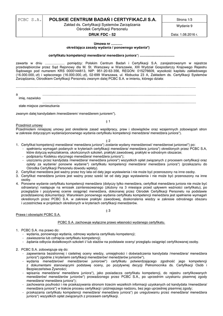 PCBC S.A. POLSKIE CENTRUM BADAŃ I CERTYFIKACJI S.A. Zakład ds. Certyfikacji Systemów Zarządzania Ośrodek Certyfikacji Personelu DRUK FDC - 52 Strona 1/3 Wydanie 9 Data: 1.08.2016 r. Umowa nr ............ określająca zasady wydania / ponownego wydania*) certyfikatu kompetencji menedżera/ menedżera juniora*) ..................................... zawarta w dniu ..................... pomiędzy: Polskim Centrum Badań i Certyfikacji S.A. zarejestrowanym w rejestrze przedsiębiorców przez Sąd Rejonowy dla M. St. Warszawy w Warszawie, XIII Wydział żospodarczy Krajowego Rejestru Sądowego pod numerem KRS 0000144813, NIP: 951-20-63-356, RźżON: 015276609, wysokość kapitału zakładowego (16.000.000,-zł) i wpłaconego (16.000.000,-zł), 02-699 Warszawa, ul. Kłobucka 23 A, Zakładem ds. Certyfikacji Systemów Zarządzania, Ośrodkiem Certyfikacji Personelu zwanym dalej PCBC S.A. w imieniu, którego działa: ................................................................................................................................................................................................ a imię, nazwisko .................................................................................................................................................................... .................................................................................................................................................................... stałe miejsce zamieszkania zwanym dalej kandydatem /mened erem/ mened erem juniorem*). §1 Przedmiot umowy Przedmiotem niniejszej umowy jest określenie zasad współpracy, praw i obowiązków oraz wzajemnych zobowiązań stron w zakresie dotyczącym wydania/ponownego wydania certyfikatu kompetencji mened era/ mened era juniora*). §2 1. Certyfikat kompetencji mened era/ mened era juniora*) zostanie wydany mened erowi/ mened erowi juniorowi*) po: - spełnieniu wymagań podanych w kryteriach certyfikacji mened era/ mened era juniora*) określonych przez PCBC S.A, które dotyczą wykształcenia, ukończonych szkoleń, praktyki zawodowej, praktyki w odnośnym obszarze; - podpisaniu Kodeksu etycznego mened era/ mened era juniora*); - uiszczeniu przez kandydata /mened era/ mened era juniora*) wszystkich opłat związanych z procesem certyfikacji oraz opłaty za wydanie/ ponowne wydanie*) certyfikatu kompetencji mened era/ mened era juniora*) (przekazaniu do Ośrodka Certyfikacji Personelu dowodu wpłaty). 2. Certyfikat mened era jest wa ny przez trzy lata od daty jego wystawienia i nie mo e być przenoszony na inne osoby. 3. Certyfikat mened era juniora jest wa ny przez sześć lat od daty jego wystawienia i nie mo e być przenoszony na inne osoby. 4. Ponowne wydanie certyfikatu kompetencji mened era (dotyczy tylko mened era, certyfikat mened era juniora nie mo e być odnawiany) następuje na wniosek zainteresowanego (zło ony na 3 miesiące przed upływem wa ności certyfikatu), po przeglądzie i pozytywnej ocenie osiągnięć mened era, dokonanej przez Ośrodek Certyfikacji Personelu na podstawie przedstawionej dokumentacji. Warunkiem ponownego wydania certyfikatu kompetencji mened era jest spełnienie wymagań określonych przez PCBC S.A. w zakresie praktyki zawodowej, doskonalenia wiedzy w zakresie odnośnego obszaru i uczestnictwa w projektach określonych w kryteriach certyfikacji mened erów. Prawa i obowiązki PCBC S.A. §3 PCBC S.A. zachowuje wyłączne prawo własności wydanego certyfikatu. 1. PCBC S.A. ma prawo do: - wydania, ponownego wydania, odmowy wydania certyfikatu kompetencji; - zawieszenia lub cofnięcia certyfikatu kompetencji; - ądania odbycia dodatkowych szkoleń i/ lub sta ów na podstawie oceny/ przeglądu osiągnięć certyfikowanej osoby. 2. PCBC S.A. zobowiązuje się do: - zapewnienia bezstronnej i rzetelnej oceny wiedzy, umiejętności i doświadczenia kandydata /mened era/ mened era juniora*) zgodnie z kryteriami certyfikacji mened erów/ mened erów juniorów*). - wydania mened erowi/ mened erowi juniorowi*) certyfikatu potwierdzającego zgodność jego kompetencji z dokumentami stanowiącymi podstawę oceny, po pozytywnej decyzji Pełnomocnika ds. Certyfikacji Osób i Bezpieczeństwa ywności; - wpisania mened era/ mened era juniora*), jako posiadacza certyfikatu kompetencji, do rejestru certyfikowanych mened erów/ mened erów juniorów*) prowadzonego przez PCBC S.A., po uprzednim uzyskaniu pisemnej zgody mened era/ mened era juniora*); - zachowania poufności i nie przekazywania stronom trzecim wszelkich informacji uzyskanych od kandydata /mened era/ mened era juniora*) w trakcie procesu certyfikacji i pó niejszego nadzoru, bez jego uprzedniej pisemnej zgody; - przekazania certyfikatu kompetencji mened era/ mened era juniora*) po uregulowaniu przez mened era/ mened era juniora*) wszystkich opłat związanych z procesem certyfikacji. PCBC S.A. POLSKIE CENTRUM BADAŃ I CERTYFIKACJI S.A. Zakład ds. Certyfikacji Systemów Zarządzania Ośrodek Certyfikacji Personelu DRUK FDC - 52 Strona 2/3 Wydanie 9 Data: 1.08.2016 r. §4 1. Posiadacz certyfikatu ma prawo do: - powoływania się na swój certyfikat w publikacjach, na wizytówkach, listownikach, oraz przy zawieraniu umów dotyczących działalności objętej zakresem certyfikacji, powoływanie się na certyfikat kompetencji w korespondencji, dokumentach promocyjnych i reklamowych powinno ograniczać się wyłącznie do obszaru działania określonego zakresem certyfikacji i tylko z jednoczesnym podaniem numeru certyfikatu, posiadacz certyfikatu zobowiązuje się wyró nić zakres działalności, której dotyczy certyfikat, je eli brak takiego wyró nienia mo e nasuwać jakiekolwiek wątpliwości, co do zakresu certyfikacji; - informacji ze strony PCBC S.A. o wszelkich zmianach w systemie certyfikacji; - wymagania od PCBC S.A. zachowania poufności odnośnie wszelkich dotyczących go informacji uzyskanych w czasie procesu certyfikacji i pó niejszego nadzoru, za wyjąt