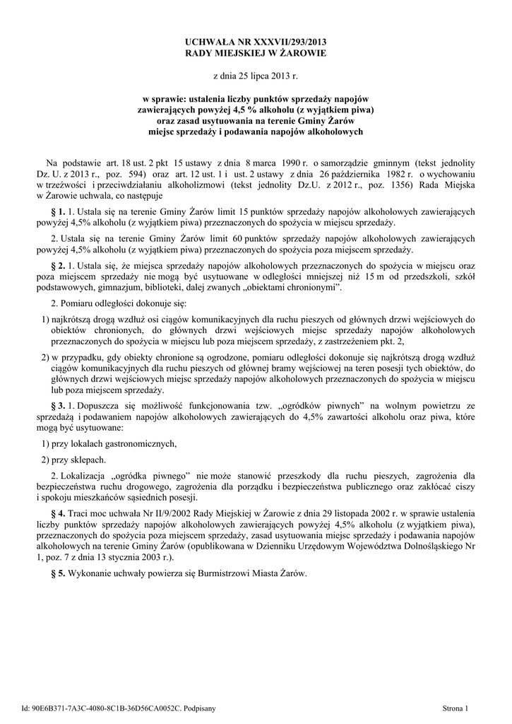 UCHWAŁA NR XXXVII/293/2013 RADY MIEJSKIEJ W ŻAROWIE z dnia 25 lipca 2013 r. w sprawie: ustalenia liczby punktów sprzedaży napojów zawierających powyżej 4,5 % alkoholu (z wyjątkiem piwa) oraz zasad usytuowania na terenie Gminy Żarów miejsc sprzedaży i podawania napojów alkoholowych Na podstawie art. 18 ust. 2 pkt 15 ustawy z dnia 8 marca 1990 r. o samorządzie gminnym (tekst jednolity Dz. U. z 2013 r., poz. 594) oraz art. 12 ust. 1 i ust. 2 ustawy z dnia 26 października 1982 r. o wychowaniu w trzeźwości i przeciwdziałaniu alkoholizmowi (tekst jednolity Dz.U. z 2012 r., poz. 1356) Rada Miejska w Żarowie uchwala, co następuje § 1. 1. Ustala się na terenie Gminy Żarów limit 15 punktów sprzedaży napojów alkoholowych zawierających powyżej 4,5% alkoholu (z wyjątkiem piwa) przeznaczonych do spożycia w miejscu sprzedaży. 2. Ustala się na terenie Gminy Żarów limit 60 punktów sprzedaży napojów alkoholowych zawierających powyżej 4,5% alkoholu (z wyjątkiem piwa) przeznaczonych do spożycia poza miejscem sprzedaży. § 2. 1. Ustala się, że miejsca sprzedaży napojów alkoholowych przeznaczonych do spożycia w miejscu oraz poza miejscem sprzedaży nie mogą być usytuowane w odległości mniejszej niż 15 m od przedszkoli, szkół podstawowych, gimnazjum, biblioteki, dalej zwanych „obiektami chronionymi”. 2. Pomiaru odległości dokonuje się: 1) najkrótszą drogą wzdłuż osi ciągów komunikacyjnych dla ruchu pieszych od głównych drzwi wejściowych do obiektów chronionych, do głównych drzwi wejściowych miejsc sprzedaży napojów alkoholowych przeznaczonych do spożycia w miejscu lub poza miejscem sprzedaży, z zastrzeżeniem pkt. 2, 2) w przypadku, gdy obiekty chronione są ogrodzone, pomiaru odległości dokonuje się najkrótszą drogą wzdłuż ciągów komunikacyjnych dla ruchu pieszych od głównej bramy wejściowej na teren posesji tych obiektów, do głównych drzwi wejściowych miejsc sprzedaży napojów alkoholowych przeznaczonych do spożycia w miejscu lub poza miejscem sprzedaży. § 3. 1. Dopuszcza się możliwość funkcjonowania tzw. „ogródków piwnych” na wolnym powietrzu ze sprzedażą i podawaniem napojów alkoholowych zawierających do 4,5% zawartości alkoholu oraz piwa, które mogą być usytuowane: 1) przy lokalach gastronomicznych, 2) przy sklepach. 2. Lokalizacja „ogródka piwnego” nie może stanowić przeszkody dla ruchu pieszych, zagrożenia dla bezpieczeństwa ruchu drogowego, zagrożenia dla porządku i bezpieczeństwa publicznego oraz zakłócać ciszy i spokoju mieszkańców sąsiednich posesji. § 4. Traci moc uchwała Nr II/9/2002 Rady Miejskiej w Żarowie z dnia 29 listopada 2002 r. w sprawie ustalenia liczby punktów sprzedaży napojów alkoholowych zawierających powyżej 4,5% alkoholu (z wyjątkiem piwa), przeznaczonych do spożycia poza miejscem sprzedaży, zasad usytuowania miejsc sprzedaży i podawania napojów alkoholowych na terenie Gminy Żarów (opublikowana w Dzienniku Urzędowym Województwa Dolnośląskiego Nr 1, poz. 7 z dnia 13 stycznia 2003 r.). § 5. Wykonanie uchwały powierza się Burmistrzowi Miasta Żarów. Id: 90E6B371-7A3C-4080-8C1B-36D56CA0052C. Podpisany Strona 1 § 6. Uchwała wchodzi w życie po upływie 14 dni od dnia ogłoszenia w Dzienniku Urzędowym Województwa Dolnośląskiego. Przewodniczący Rady Miejskiej w Żarowie Tadeusz Pudlik Id: 90E6B371-7A3C-4080-8C1B-36D56CA0052C. Podpisany Strona 2 Uzasadnienie do uchwały Rady Miejskiej w Żarowie w sprawie ustalenia liczby punktów sprzedaży napojów zawierających powyżej 4,5 % alkoholu (z wyjątkiem piwa) oraz zasad usytuowania na terenie Gminy Żarów miejsc sprzedaży i podawania napojów alkoholowych Zgodnie z art. 12 ust. 1 i 2 ustawy z dnia 26 października 1982 r. o wychowaniu w trzeźwości i przeciwdziałaniu alkoholizmowi (t.j. Dz. U. z 2012 r. poz. 1356), rada gminy ustala, w drodze uchwały, liczbę punktów sprzedaży napojów alkoholowych zawierających powyżej 4,5% alkoholu (z wyjątkiem piwa) przeznaczonych do spożycia w miejscu i poza miejscem sprzedaży oraz zasady usytuowania na terenie gminy miejsc sprzedaży i podawania napojów alkoholowych. W dniu 26 czerwca 2013 r. wpłynęła do Urzędu Miejskiego w Żarowie skarga Prokuratora Okręgowego w Świdnicy (sygn. II Pa 14/13), kierowana do Wojewódzkiego Sądu Administracyjnego we Wrocławiu, na uchwałę Rady Miejskiej w Żarowie nr II/9/2002 z dnia 29 listopada 2002 r. w sprawie ustalenia liczby punktów sprzedaży napojów zawierających powyżej 4,5% alkoholu (z wyjątkiem piwa), przeznaczonych do spożycia poza miejscem sprzedaży jak i w miejscu sprzedaży, zasad usytuowania miejsc sprzedaży i podawania napojów alkoholowych na terenie gminy Żarów. Prokurator zarzucił, iż w/w uchwała narusza prawo materialne w części obejmującej § 2 i § 3, t.j. niezgodność z przepisami art. 1, art. 2 oraz art. 12 ust. 2 i 4 ustawy z dnia 16 października 1982 r. o wychowaniu w trzeźwości i przeciwdziałaniu alkoholizmowi (t.j. Dz. U. z 2012 r. poz. 1356), poprzez brak uregulowania zasad usytuowania punktów sprzedaży alkoholu oraz określenie warunków, jakie powinien spełniać punkt sprzedaży i podawania napojów alkoholowych. Ponadto upoważnienie ustawowe zawarte w przepisie art. 12 ust. 2 ustawy o wychowaniu w trzeźwości i przeciwdziałaniu alkoholizmowi nie upoważnia rady gminy do określania warunków organizacji imprez na otwartym powietrzu, zawartych w § 3 zaskarżonej uchwały. W związku z powyższym podjęcie uchwały jest uzasadnione. Sporządziła: Aneta Zakrzewska Inspektor ds. obsługi klienta i inwentaryzacji. Id: 90E6B371-7A3C-4080-8C1B-36D56CA0052C. Podpisany Strona 1