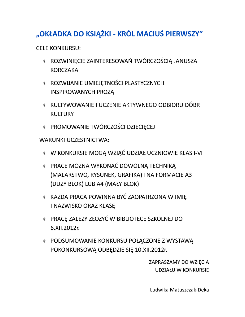 „OKŁADKA DO KSIĄŻKI - KRÓL MACIUŚ PIERWSZY” CELE KONKURSU: キ ROZWINIĘCIE ZAINTERESOWAO TWÓRCZOŚCIĄ JANUSZA KORCZAKA キ ROZWIJANIE UMIEJĘTNOŚCI PLASTYCZNYCH INSPIROWANYCH PROZĄ キ KULTYWOWANIE I UCZENIE AKTYWNEGO ODBIORU DÓBR KULTURY キ PROMOWANIE TWÓRCZOŚCI DZIECIĘCEJ WARUNKI UCZESTNICTWA: キ W KONKURSIE MOGĄ WZIĄD UDZIAŁ UCZNIOWIE KLAS I-VI キ PRACE MOŻNA WYKONAD DOWOLNĄ TECHNIKĄ (MALARSTWO, RYSUNEK, GRAFIKA) I NA FORMACIE A3 (DUŻY BLOK) LUB A4 (MAŁY BLOK) キ KAŻDA PRACA POWINNA BYD ZAOPATRZONA W IMIĘ I NAZWISKO ORAZ KLASĘ キ PRACĘ ZALEŻY ZŁOZYD W BIBLIOTECE SZKOLNEJ DO 6.XII.2012r. キ PODSUMOWANIE KONKURSU POŁĄCZONE Z WYSTAWĄ POKONKURSOWĄ ODBĘDZIE SIĘ 10.XII.2012r. ZAPRASZAMY DO WZIĘCIA UDZIAŁU W KONKURSIE Ludwika Matuszczak-Deka