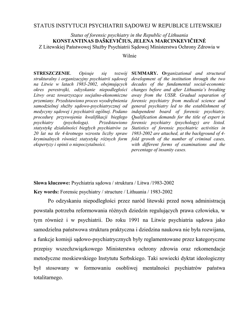 STATUS INSTYTUCJI PSYCHIATRII SĄDOWEJ W REPUBLICE LITEWSKIEJ Status of forensic psychiatry in the Republic of Lithuania KONSTANTINAS DAŠKEVIČIUS, JELENA MARCINKEVIČIENĖ Z Litewskiej Państwowej Służby Psychiatrii Sądowej Ministerstwa Ochrony Zdrowia w Wilnie STRESZCZENIE. Opisuje się rozwój strukturalny i organizacyjny psychiatrii sądowej na Litwie w latach 1983-2002, obejmujących okres perestrojki, odzyskanie niepodległości Litwy oraz towarzyszące socjalno-ekonomiczne przemiany. Przedstawiono proces wyodrębnienia samodzielnej służby sądowo-psychiatrycznej od medycyny sądowej i psychiatrii ogólnej. Podano procedurę przyswojenia kwalifikacji biegłego psychiatry (psychologa). Przedstawiono statystykę działalności biegłych psychiatrów za 20 lat na tle 4-krotnego wzrostu liczby spraw kryminalnych również statystykę różnych form ekspertyzy i opinii o niepoczytalności. SUMMARY. Organizational and structural development of the institution through the two decades of the fundamental social-economic changes before and after Lithuania’s breaking away from the USSR. Gradual separation of forensic psychiatry from medical science and general psychiatry led to the establishment of independent board of forensic psychiatry. Qualification demands for the title of expert in forensic psychiatry (psychology) are listed. Statistics of forensic psychiatric activities in 1983-2002 are attached, at the background of 4fold growth of the number of criminal cases, with different forms of examinations and the percentage of insanity cases. Slowa kluczowe: Psychiatria sądowa / struktura / Litwa /1983-2002 Key words: Forensic psychiatry / structure / Lithuania / 1983-2002 Po odzyskaniu niepodległości przez naród litewski przed nową administracją powstała potrzeba reformowania różnych dziedzin regulujących prawa człowieka, w tym również i w psychiatrii. Do roku 1991 na Litwie psychiatria sądowa jako samodzielna państwowa struktura praktyczna i dziedzina naukowa nie była rozwijana, a funkcje komisji sądowo-psychiatrycznych były reglamentowane przez kategoryczne przepisy wszechzwiązkowego Ministerstwa ochrony zdrowia oraz rekomendacje metodyczne moskiewskiego Instytutu Serbskiego. Taki sowiecki dyktat ideologiczny był stosowany w formowaniu osobliwej mentalności psychiatrów państwa totalitarnego. W roku 1992 prawnicy Litwy mieli poważne zarzuty biegłym sądowym psychiatrom ze względu na organizację pracy i jakość wydawanych opinii. Wtedy nie mieliśmy jeszcze jednolitej struktury sądowo-psychiatrycznej. Biegłych lekarzy mianowali i zwalniali naczelni lekarze szpitali psychiatrycznych według własnego uznania, polegając na subjektywnych motywach i logice. Najczęściej byli to lekarze, nie mający minimalnego przygotowania specjalnego, którzy opierali się na własnym doświadczeniu. Niewątpliwie, sytuacja taka nie mogła być dalej tolerowana przez system praworządny. Więc z inicjatywy prawników Biuro medycyny sądowej było reorganizowane w Centrum sądowej medycyny i psychiatrii. To oznaczało, że wszystkich pracujących w kraju biegłych sądowych psychiatrów nie tylko zebrano pod jeden parasol z biegłymi medykami, ale i oddano pod ich subordynację, ponieważ kierownikiem wspólnego Centrum został profesor medycyny sądowej. Na fazie początkowej sytuacja taka zadowalała psychiatrów sądowych i była korzystna dla organizacji pracy. Stworzyła się skuteczna i stabilna struktura ambulatoryjnych komisji sądowo-psychiatrycznych. Komisje te mieli bazę przy zakładach leczniczych (szpitalach oraz przychodniach psychiatrycznych) i w myśl rozkazu Ministra Ochrony Zdrowia administracja zakładu była zobowiązana stworzyć pomyślne warunki dla wykonania zleconej ekspertyzy. Zawarliśmy umowy dzierżawne z administracją zakładów leczniczych i opłacamy tylko wydatki eksploatacyjne pomieszczeń (ogrzewanie, wodę, elektryczność). Sytuacja specjalistycznych stacjonarnych oddziałów ekspertyzy sądowopsychiatrycznej była bardziej złożona. Za czasów sowieckich w kraju funkcjonowały dwa takie oddziały szpitali psychiatrycznych: dla osób aresztowanych w Ucianach (Utena na Północnym Wschodzie Litwy) oraz dla osób niearesztowanych w Nowej Wilejce (pod Wilnem). Z początkiem reformy w oddziałach tych utworzyły się zagmatwane relacje. Lekarze biegli pracowali na etatach naszego Centrum, a pozostały personel i cała dokumentacja należeli do szpitala. Sytuacja taka była na rękę administracji szpitalnej, jednak nie do przyjęcia dla zakładu ekspertowego. Dopiero po kilku latach ciężkich rokowań i mediacji władz praworządnych szpitalne oddziały ekspertowe były reorganizowane i przekazane w subordynację psychiatrów sądowych. Teraz wszystkie rodzaje ekspertyzy stacjonarnej jak dla osób aresztowanych i niearesztowanych, tak kryminalnych w sprawach kryminalnych i cywilnych, zkoncentrowane są w jednym zakładzie uciańskim, w zjednoczonym kompleksie ekspertowym, składającym się z kilku odpowiednio profilowanych oddziałów. Po tym, jak ułożyła się struktura wszystkich oddziałów sądowo- psychiatrycznych, sformował się kolektyw kwalifikowanych pracowników, wzrosło i umocniło się nasze ego i ufanie własnym siłom, nadszedł czas na „rozwód“ z medycyną sądową. Chociaż ten związek miał i pozytywne wyniki, jednak myśmy cały czas odczuwali dyskryminację, bo wszystkie priorytety, moralne i materialne (ekonomiczne) pozostawały nie nam. Ostatnią kroplą, która popchnęła nas do zerwania, było postanowienie naszego wspólnego kierownika naczelnika, medyka sądowego, stosować do sądowo-psychiatrycznego opiniowania trafarety medycyny sądowej. W roku 1994 dekretem Ministra ochrony zdrowia Centrum sądowej medycyny i psychiatrii został rozdzielony na dwie samodzielne państwowe instytucje ekspertowe – Państwowe urzędy psychiatrii sądowej oraz medycyny sądowej. Po długich pertraktacjach z Minist