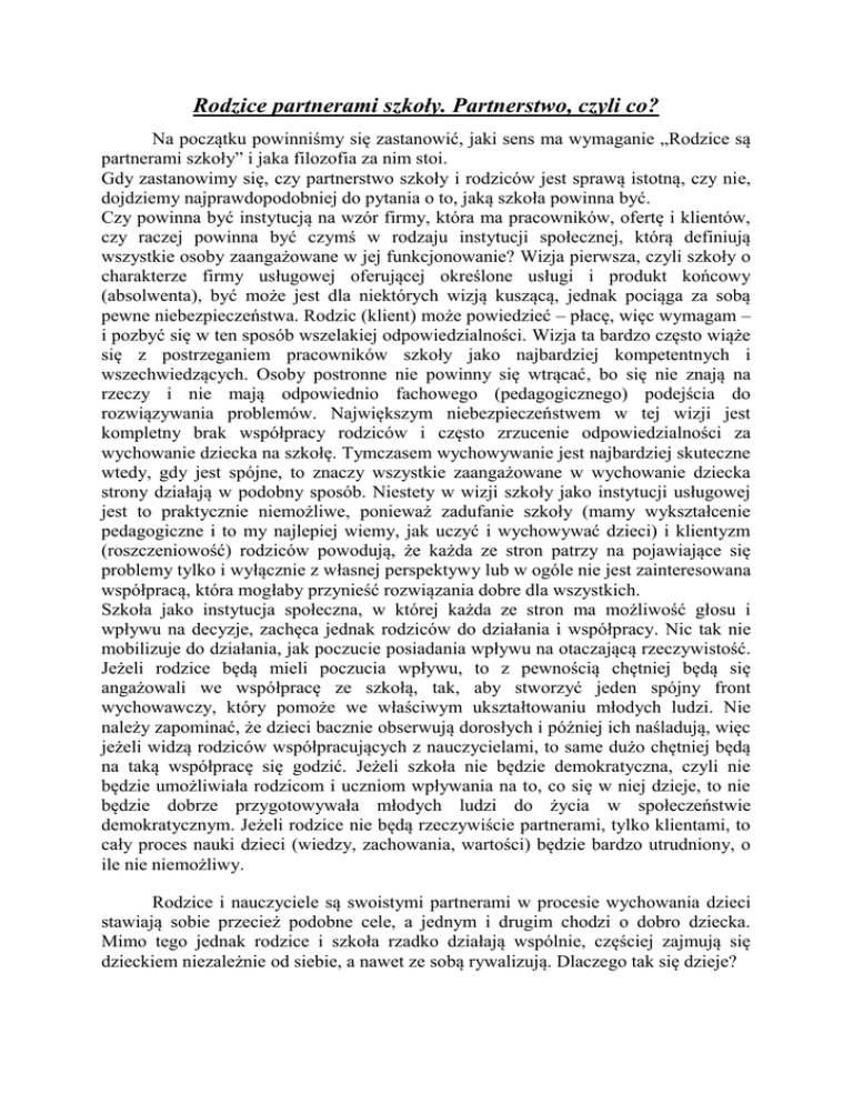 Rodzice partnerami szkoły. Partnerstwo, czyli co? Na początku powinniśmy się zastanowić, jaki sens ma wymaganie „Rodzice są partnerami szkoły” i jaka filozofia za nim stoi. Gdy zastanowimy się, czy partnerstwo szkoły i rodziców jest sprawą istotną, czy nie, dojdziemy najprawdopodobniej do pytania o to, jaką szkoła powinna być. Czy powinna być instytucją na wzór firmy, która ma pracowników, ofertę i klientów, czy raczej powinna być czymś w rodzaju instytucji społecznej, którą definiują wszystkie osoby zaangażowane w jej funkcjonowanie? Wizja pierwsza, czyli szkoły o charakterze firmy usługowej oferującej określone usługi i produkt końcowy (absolwenta), być może jest dla niektórych wizją kuszącą, jednak pociąga za sobą pewne niebezpieczeństwa. Rodzic (klient) może powiedzieć – płacę, więc wymagam – i pozbyć się w ten sposób wszelakiej odpowiedzialności. Wizja ta bardzo często wiąże się z postrzeganiem pracowników szkoły jako najbardziej kompetentnych i wszechwiedzących. Osoby postronne nie powinny się wtrącać, bo się nie znają na rzeczy i nie mają odpowiednio fachowego (pedagogicznego) podejścia do rozwiązywania problemów. Największym niebezpieczeństwem w tej wizji jest kompletny brak współpracy rodziców i często zrzucenie odpowiedzialności za wychowanie dziecka na szkołę. Tymczasem wychowywanie jest najbardziej skuteczne wtedy, gdy jest spójne, to znaczy wszystkie zaangażowane w wychowanie dziecka strony działają w podobny sposób. Niestety w wizji szkoły jako instytucji usługowej jest to praktycznie niemożliwe, ponieważ zadufanie szkoły (mamy wykształcenie pedagogiczne i to my najlepiej wiemy, jak uczyć i wychowywać dzieci) i klientyzm (roszczeniowość) rodziców powodują, że każda ze stron patrzy na pojawiające się problemy tylko i wyłącznie z własnej perspektywy lub w ogóle nie jest zainteresowana współpracą, która mogłaby przynieść rozwiązania dobre dla wszystkich. Szkoła jako instytucja społeczna, w której każda ze stron ma możliwość głosu i wpływu na decyzje, zachęca jednak rodziców do działania i współpracy. Nic tak nie mobilizuje do działania, jak poczucie posiadania wpływu na otaczającą rzeczywistość. Jeżeli rodzice będą mieli poczucia wpływu, to z pewnością chętniej będą się angażowali we współpracę ze szkołą, tak, aby stworzyć jeden spójny front wychowawczy, który pomoże we właściwym ukształtowaniu młodych ludzi. Nie należy zapominać, że dzieci bacznie obserwują dorosłych i później ich naśladują, więc jeżeli widzą rodziców współpracujących z nauczycielami, to same dużo chętniej będą na taką współpracę się godzić. Jeżeli szkoła nie będzie demokratyczna, czyli nie będzie umożliwiała rodzicom i uczniom wpływania na to, co się w niej dzieje, to nie będzie dobrze przygotowywała młodych ludzi do życia w społeczeństwie demokratycznym. Jeżeli rodzice nie będą rzeczywiście partnerami, tylko klientami, to cały proces nauki dzieci (wiedzy, zachowania, wartości) będzie bardzo utrudniony, o ile nie niemożliwy. Rodzice i nauczyciele są swoistymi partnerami w procesie wychowania dzieci stawiają sobie przecież podobne cele, a jednym i drugim chodzi o dobro dziecka. Mimo tego jednak rodzice i szkoła rzadko działają wspólnie, częściej zajmują się dzieckiem niezależnie od siebie, a nawet ze sobą rywalizują. Dlaczego tak się dzieje? Nauczyciele i rodzice spotykają się w szkole jako profesjonalni wychowawcy będący przedstawicielami dwóch odmiennych instytucji – szkoły i rodziny. Rolę rodzica i nauczyciela wyznaczają jednak pełnione przez nich wobec dziecka odmienne funkcje. Rodzice z natury są bardziej zaangażowani emocjonalnie, ich relacje z dzieckiem są bliskie i spontaniczne, z tego tez powodu bywają też wobec własnego dziecka stronniczy. Od nauczycieli oczekuje się za to, że będą bardziej racjonalni i bezstronni, a ich działania celowe i mające na uwadze bardziej całą grupę, niż poszczególne jednostki. Te role, zatem w sposób istotny się różnią i w zasadzie mogłoby działać na korzyść dziecka, zwiększając możliwości korzystnych wpływów wychowawczych. Zazwyczaj jednak obie strony – nauczyciele i rodzice - wyobrażają sobie, że działania obu stron powinny być identyczne; przy czym oczywiście rodzice chcieliby, aby nauczyciel stał się w szkole dla ich dziecka „zastępczym rodzicem”, a więc rozumiał, usprawiedliwiał, przypisywał dobre intencje, a czasem przymknął oko na niektóre zachowania, nauczyciele zaś oczekują od rodziców, że ci będą wobec swoich dzieci konsekwentni, obiektywni i będą postępować z dzieckiem w domu tak, jak oni postępują z nim w szkole. Podsumowując można powiedzieć, że bez partnerstwa i współpracy między domem i szkołą, nie zbudujemy nowoczesnego społeczeństwa obywatelskiego, którego członkowie są świadomi swoich praw i mają pozytywne doświadczenia związane ze współpracą z najbliższym otoczeniem i braniem na siebie odpowiedzialności. Jak można stwierdzić na podstawie wyników ewaluacji zewnętrznej i przykładów działań, które można podjąć, aby usprawnić współpracę domu i szkoły, jesteśmy gdzieś w połowie drogi. Jakaś praca została wykonana, ale jeszcze dużo przed nami. „Jeżeli rodzice z tobą nie współpracują, poszukaj najpierw przyczyn w sposobie funkcjonowania instytucji”. Roger Prott