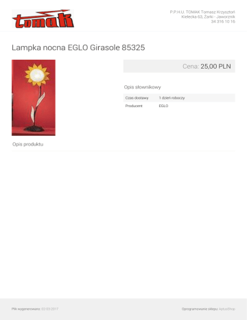 P.P.H.U. TOMAK Tomasz Krzysztoń Kielecka 63, Żarki - Jaworznik 34 316 10 16 Lampka nocna EGLO Girasole 85325 Cena: 25,00 PLN Opis słownikowy Czas dostawy 1 dzień roboczy Producent EGLO Opis produktu Plik wygenerowano: 02-03-2017 Powered by TCPDF (www.tcpdf.org) Oprogramowanie sklepu: AptusShop