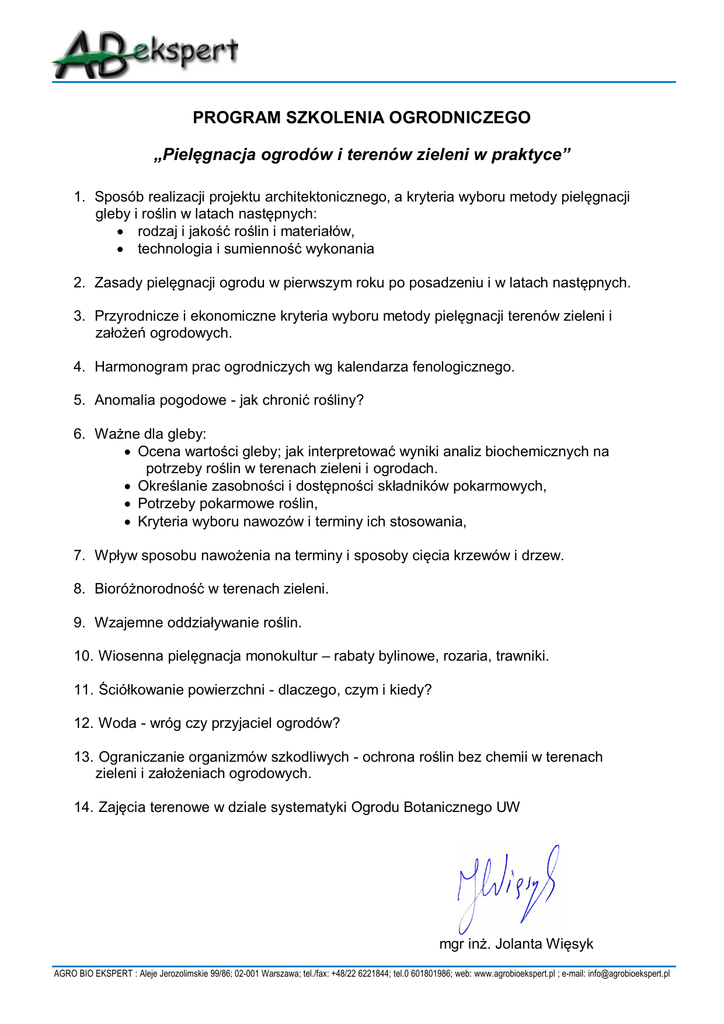 PROGRAM SZKOLENIA OGRODNICZEGO „Pielęgnacja ogrodów i terenów zieleni w praktyce” 1. Sposób realizacji projektu architektonicznego, a kryteria wyboru metody pielęgnacji gleby i roślin w latach następnych:  rodzaj i jakość roślin i materiałów,  technologia i sumienność wykonania 2. Zasady pielęgnacji ogrodu w pierwszym roku po posadzeniu i w latach następnych. 3. Przyrodnicze i ekonomiczne kryteria wyboru metody pielęgnacji terenów zieleni i założeń ogrodowych. 4. Harmonogram prac ogrodniczych wg kalendarza fenologicznego. 5. Anomalia pogodowe - jak chronić rośliny? 6. Ważne dla gleby:  Ocena wartości gleby; jak interpretować wyniki analiz biochemicznych na potrzeby roślin w terenach zieleni i ogrodach.  Określanie zasobności i dostępności składników pokarmowych,  Potrzeby pokarmowe roślin,  Kryteria wyboru nawozów i terminy ich stosowania, 7. Wpływ sposobu nawożenia na terminy i sposoby cięcia krzewów i drzew. 8. Bioróżnorodność w terenach zieleni. 9. Wzajemne oddziaływanie roślin. 10. Wiosenna pielęgnacja monokultur – rabaty bylinowe, rozaria, trawniki. 11. Ściółkowanie powierzchni - dlaczego, czym i kiedy? 12. Woda - wróg czy przyjaciel ogrodów? 13. Ograniczanie organizmów szkodliwych - ochrona roślin bez chemii w terenach zieleni i założeniach ogrodowych. 14. Zajęcia terenowe w dziale systematyki Ogrodu Botanicznego UW mgr inż. Jolanta Więsyk AGRO BIO EKSPERT : Aleje Jerozolimskie 99/86; 02-001 Warszawa; tel./fax: +48/22 6221844; tel.0 601801986; web: www.agrobioekspert.pl ; e-mail: [email protected]