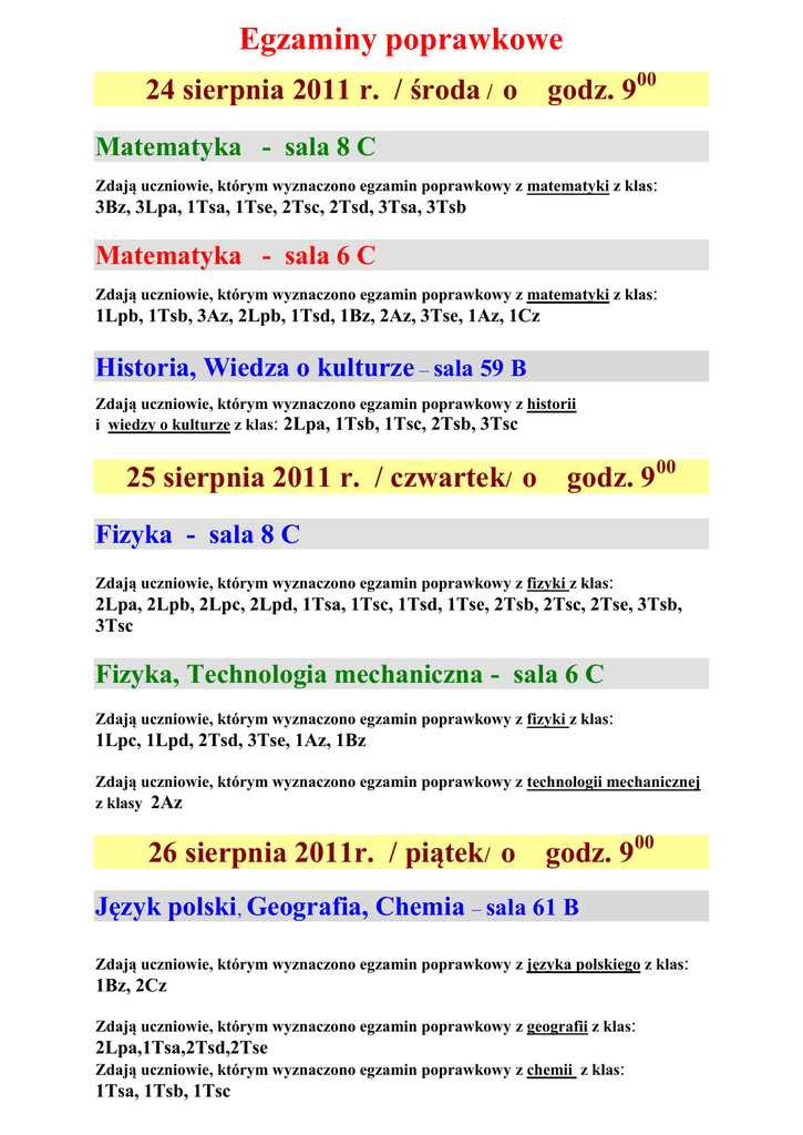 Egzaminy poprawkowe 24 sierpnia 2011 r. / środa / o godz. 900 Matematyka - sala 8 C Zdają uczniowie, którym wyznaczono egzamin poprawkowy z matematyki z klas: 3Bz, 3Lpa, 1Tsa, 1Tse, 2Tsc, 2Tsd, 3Tsa, 3Tsb Matematyka - sala 6 C Zdają uczniowie, którym wyznaczono egzamin poprawkowy z matematyki z klas: 1Lpb, 1Tsb, 3Az, 2Lpb, 1Tsd, 1Bz, 2Az, 3Tse, 1Az, 1Cz Historia, Wiedza o kulturze – sala 59 B Zdają uczniowie, którym wyznaczono egzamin poprawkowy z historii i wiedzy o kulturze z klas: 2Lpa, 1Tsb, 1Tsc, 2Tsb, 3Tsc 25 sierpnia 2011 r. / czwartek/ o godz. 900 Fizyka - sala 8 C Zdają uczniowie, którym wyznaczono egzamin poprawkowy z fizyki z klas: 2Lpa, 2Lpb, 2Lpc, 2Lpd, 1Tsa, 1Tsc, 1Tsd, 1Tse, 2Tsb, 2Tsc, 2Tse, 3Tsb, 3Tsc Fizyka, Technologia mechaniczna - sala 6 C Zdają uczniowie, którym wyznaczono egzamin poprawkowy z fizyki z klas: 1Lpc, 1Lpd, 2Tsd, 3Tse, 1Az, 1Bz Zdają uczniowie, którym wyznaczono egzamin poprawkowy z technologii mechanicznej z klasy 2Az 26 sierpnia 2011r. / piątek/ o godz. 900 Język polski, Geografia, Chemia – sala 61 B Zdają uczniowie, którym wyznaczono egzamin poprawkowy z języka polskiego z klas: 1Bz, 2Cz Zdają uczniowie, którym wyznaczono egzamin poprawkowy z geografii z klas: 2Lpa,1Tsa,2Tsd,2Tse Zdają uczniowie, którym wyznaczono egzamin poprawkowy z chemii z klas: 1Tsa, 1Tsb, 1Tsc