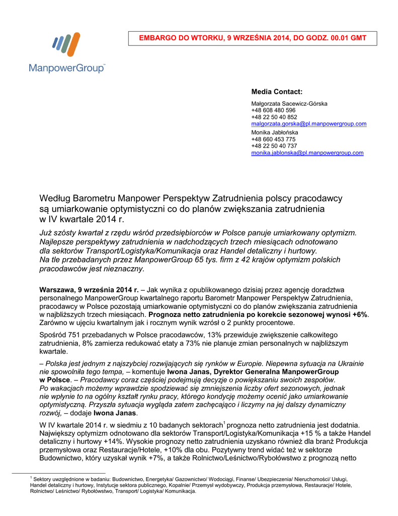 EMBARGO DO WTORKU, 9 WRZEŚNIA 2014, DO GODZ. 00.01 GMT Media Contact: Małgorzata Sacewicz-Górska +48 608 480 596 +48 22 50 40 852 [email protected] Monika Jabłońska +48 660 453 775 +48 22 50 40 737 [email protected] Według Barometru Manpower Perspektyw Zatrudnienia polscy pracodawcy są umiarkowanie optymistyczni co do planów zwiększania zatrudnienia w IV kwartale 2014 r. Już szósty kwartał z rzędu wśród przedsiębiorców w Polsce panuje umiarkowany optymizm. Najlepsze perspektywy zatrudnienia w nadchodzących trzech miesiącach odnotowano dla sektorów Transport/Logistyka/Komunikacja oraz Handel detaliczny i hurtowy. Na tle przebadanych przez ManpowerGroup 65 tys. firm z 42 krajów optymizm polskich pracodawców jest nieznaczny. Warszawa, 9 września 2014 r. – Jak wynika z opublikowanego dzisiaj przez agencję doradztwa personalnego ManpowerGroup kwartalnego raportu Barometr Manpower Perspektyw Zatrudnienia, pracodawcy w Polsce pozostają umiarkowanie optymistyczni co do planów zwiększania zatrudnienia w najbliższych trzech miesiącach. Prognoza netto zatrudnienia po korekcie sezonowej wynosi +6%. Zarówno w ujęciu kwartalnym jak i rocznym wynik wzrósł o 2 punkty procentowe. Spośród 751 przebadanych w Polsce pracodawców, 13% przewiduje zwiększenie całkowitego zatrudnienia, 8% zamierza redukować etaty a 73% nie planuje zmian personalnych w najbliższym kwartale. – Polska jest jednym z najszybciej rozwijających się rynków w Europie. Niepewna sytuacja na Ukrainie nie spowolniła tego tempa, – komentuje Iwona Janas, Dyrektor Generalna ManpowerGroup w Polsce. – Pracodawcy coraz częściej podejmują decyzje o powiększaniu swoich zespołów. Po wakacjach możemy wprawdzie spodziewać się zmniejszenia liczby ofert sezonowych, jednak nie wpłynie to na ogólny kształt rynku pracy, którego kondycję możemy ocenić jako umiarkowanie optymistyczną. Przyszła sytuacja wygląda zatem zachęcająco i liczymy na jej dalszy dynamiczny rozwój, – dodaje Iwona Janas. W IV kwartale 2014 r. w siedmiu z 10 badanych sektorach1 prognoza netto zatrudnienia jest dodatnia. Największy optymizm odnotowano dla sektorów Transport/Logistyka/Komunikacja +15 % a także Handel detaliczny i hurtowy +14%. Wysokie prognozy netto zatrudnienia uzyskano również dla branż Produkcja przemysłowa oraz Restauracje/Hotele, +10% dla obu. Pozytywny trend widać też w sektorze Budownictwo, który uzyskał wynik +7%, a także Rolnictwo/Leśnictwo/Rybołówstwo z prognozą netto 1 Sektory uwzględnione w badaniu: Budownictwo, Energetyka/ Gazownictwo/ Wodociągi, Finanse/ Ubezpieczenia/ Nieruchomości/ Usługi, Handel detaliczny i hurtowy, Instytucje sektora publicznego, Kopalnie/ Przemysł wydobywczy, Produkcja przemysłowa, Restauracje/ Hotele, Rolnictwo/ Leśnictwo/ Rybołówstwo, Transport/ Logistyka/ Komunikacja. zatrudnienia +6%. Ujemną prognozę netto zatrudnienia odnotowano dla trzech sektorów. Najniższy wynik uzyskano dla sektora Kopalnie/Przemysł wydobywczy -10%, zaś prognozy netto zatrudnienia dla branż Instytucje sektora publicznego oraz Energetyka/Gazownictwo/Wodociągi wynoszą -1% dla obu. – Polska nadal jest krajem atrakcyjnym dla inwestorów. Dobra sytuacja, którą obserwujemy na rynku pracy i którą potwierdzają wyniki Barometru Manpower będzie się utrzymywała. Odnotowujemy poprawę prognoz dotyczących zatrudnienia, zarówno w ujęciu kwartalnym jak i rocznym, – zauważa Iwona Janas. – Przewidujemy, że zapotrzebowanie na specjalistów w sektorach takich, jak TSL, handel i produkcja przemysłowa pozostanie wysokie. Znalezienie pracowników o odpowiednich kwalifikacjach staje się coraz trudniejsze. Spodziewamy się zatem, że przedsiębiorcy coraz częściej będą sięgać po doradztwo oraz wsparcie wyspecjalizowanych agencji zatrudnienia, – komentuje Dyrektor Generalna ManpowerGroup w Polsce. W porównaniu z III kwartałem 2014 r. polepszenie prognoz a nastąpiło w siedmiu z 10 badanych sektorach. Największy wzrost, o 9 punktów procentowych, odnotowano dla branży Restauracje/Hotele. Prognoza wzrosła też w sektorach Energetyka/Gazownictwo/Wodociągi oraz Handel detaliczny i hurtowy, odpowiednio o 5 i 3 punkty procentowe. Spadek prognozy odnotowano w trzech sektorach, najwyższy dla Produkcji przemysłowej oraz Instytucji sektora publicznego, odpowiednio o 5 i 4 punkty procentowe. W ujęciu rocznym prognozy są wyższe w sześciu z 10 badanych sektorach. Najwyższy wzrost, o 11 punktów procentowych, odnotowano dla sektora Finanse/Ubezpieczenia/Nieruchomości/Usługi. Poprawie uległa również prognoza dla sektorów Rolnictwo/Leśnictwo/Rybołówstwo, o 6 punktów procentowych, a także Restauracje/Hotele i Transport/Logistyka/Komunikacja, o 4 punkty procentowe dla obu. Spadek prognozy odnotowano dla czterech sektorów, najwyższy dla Kopalnie/Przemysł wydobywczy oraz Energetyka/Gazownictwo/Wodociągi, odpowiednio o 8 i 6 punktów procentowych. W pięciu z sześciu badanych regionach Polski2 prognoza netto zatrudnienia dla IV kwartału 2014 r. jest dodatnia. Oznacza to, że w większości kraju przeważa optymizm pracodawców co do planów zwiększania liczby etatów w nadchodzącym kwartale. Najwyższe wyniki uzyskano dla regionów Północnego i Południowego, gdzie prognoza netto zatrudnienia wynosi odpowiednio +11% i +8%. Umiarkowanie wysokie prognozy odnotowano również dla regionów Północno-Zachodniego +6% i Centralnego +4%. Najniższy wynik uzyskano dla regionu Południowo-Zachodniego, gdzie prognoza netto zatrudnienia wynosi 0%. W porównaniu z wynikami dla III kwartału 2014 r. prognoza zatrudnienia wzrosła w trzech z sześciu badanych regionach. Najwyższy wzrost odnotowano w regionach Południowym i Północnym, odpowiednio o 5 i 4 punkty procentowe. W regionie Południowo-Zachodnim prognoza spadła o 9 punktów procentowych, a w regionie Centralnym o 3 punkty procentowe. Prognoza uzyskana dla regionu Wschodniego pozostaje n