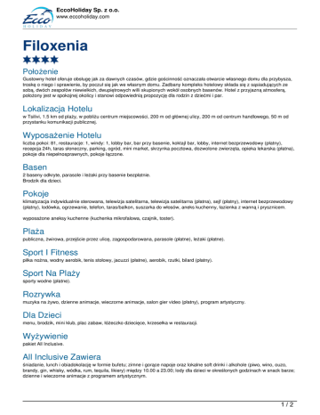EccoHoliday Sp. z o.o. www.eccoholiday.com Filoxenia Położenie Gustowny hotel oferuje obsługę jak za dawnych czasów, gdzie gościnność oznaczała otwarcie własnego domu dla przybysza, troskę o niego i sprawienie, by poczuł się jak we własnym domu. Zadbany kompleks hotelowy składa się z sąsiadujących ze sobą, dwóch zespołów niewielkich, dwupiętrowych willi skupionych wokół osobnych basenów. Hotel z przyjazną atmosferą, położony jest w spokojnej okolicy i stanowi odpowiednią propozycję dla rodzin z dziećmi i par. Lokalizacja Hotelu w Tsilivi, 1.5 km od plaży, w pobliżu centrum miejscowości, 200 m od głównej ulicy, 200 m od centrum handlowego, 50 m od przystanku komunikacji publicznej. Wyposażenie Hotelu liczba pokoi: 81, restauracje: 1, windy: 1, lobby bar, bar przy basenie, koktajl bar, lobby, internet bezprzewodowy (płatny), recepcja 24h, taras słoneczny, parking, ogród, mini market, skrzynka pocztowa, dozwolone zwierzęta, opieka lekarska (płatna), pokoje dla niepełnosprawnych, pokoje łączone. Basen 2 baseny odkryte, parasole i leżaki przy basenie bezpłatnie. Brodzik dla dzieci. Pokoje klimatyzacja indywidualnie sterowana, telewizja satelitarna, telewizja satelitarna (płatna), sejf (płatny), internet bezprzewodowy (płatny), lodówka, ogrzewanie, telefon, taras/balkon, suszarka do włosów, aneks kuchenny, łazienka z wanną i prysznicem. wyposażone aneksy kuchenne (kuchenka mikrofalowa, czajnik, toster). Plaża publiczna, żwirowa, przejście przez ulicę, zagospodarowana, parasole (płatne), leżaki (płatne). Sport I Fitness piłka nożna, wodny aerobik, tenis stołowy, jacuzzi (płatne), aerobik, rzutki, bilard (płatny). Sport Na Plaży sporty wodne (płatne). Rozrywka muzyka na żywo, dzienne animacje, wieczorne animacje, salon gier video (płatny), program artystyczny. Dla Dzieci menu, brodzik, mini klub, plac zabaw, łóżeczko dziecięce, krzesełka w restauracji. Wyżywienie pakiet All Inclusive. All Inclusive Zawiera śniadanie, lunch i obiadokolację w formie bufetu; zimne i gorące napoje oraz lokalne soft drinki i alkohole (piwo, wino, ouzo, brandy, gin, whisky, wódka, rum, tequila, likiery) między 10.00 a 23.00; lody dla dzieci w określonych godzinach w snack barze; dzienne i wieczorne animacje z programem artystycznym. 1/2 EccoHoliday Sp. z o.o. www.eccoholiday.com Płatne: markowe alkohole. Informacje Dodatkowe 4 km do centrum miasta Zakynthos. Wieczory tematyczne w restauracji. Hotel zapewnia transport na plażę. Oferta: Wylot 01.01.1970 Powrót 01.01.1970 godz. godz. Zakwaterowanie -() Dni dni Cena os. dorosła 2/2 Powered by TCPDF (www.tcpdf.org)
