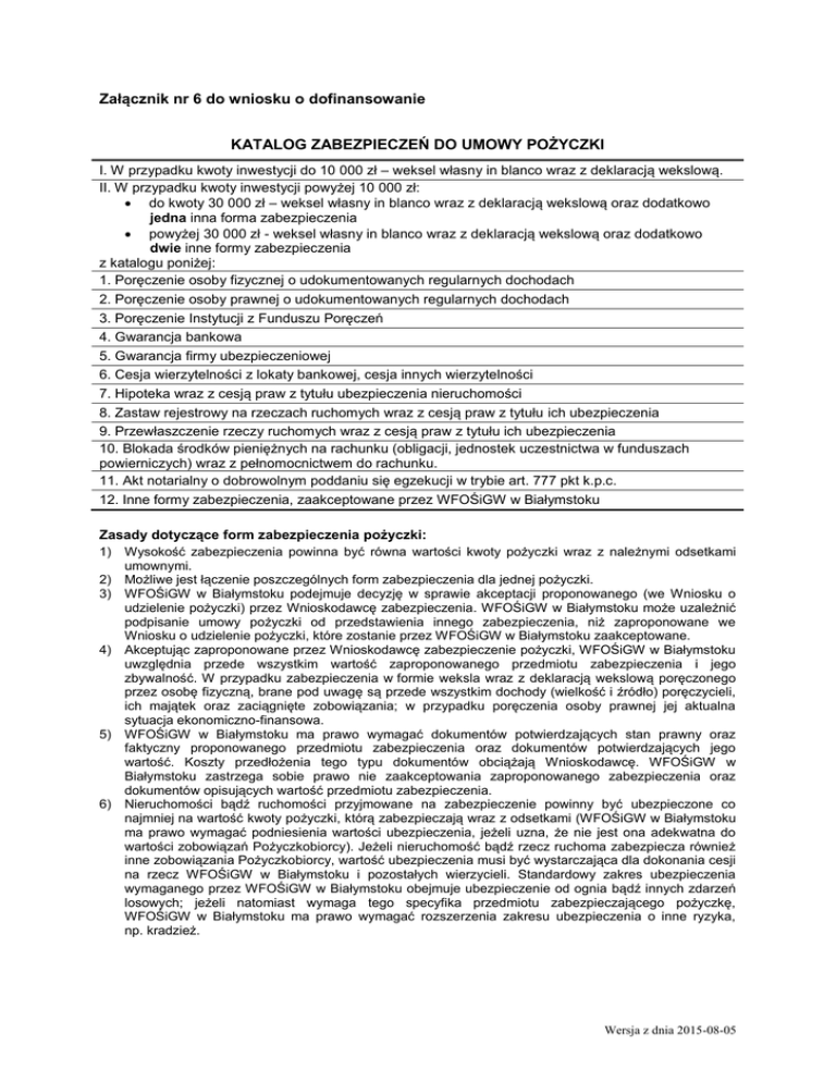 Załącznik nr 6 do wniosku o dofinansowanie KATALOG ZABEZPIECZEŃ DO UMOWY POŻYCZKI I. W przypadku kwoty inwestycji do 10 000 zł – weksel własny in blanco wraz z deklaracją wekslową. II. W przypadku kwoty inwestycji powyżej 10 000 zł: do kwoty 30 000 zł – weksel własny in blanco wraz z deklaracją wekslową oraz dodatkowo jedna inna forma zabezpieczenia powyżej 30 000 zł - weksel własny in blanco wraz z deklaracją wekslową oraz dodatkowo dwie inne formy zabezpieczenia z katalogu poniżej: 1. Poręczenie osoby fizycznej o udokumentowanych regularnych dochodach 2. Poręczenie osoby prawnej o udokumentowanych regularnych dochodach 3. Poręczenie Instytucji z Funduszu Poręczeń 4. Gwarancja bankowa 5. Gwarancja firmy ubezpieczeniowej 6. Cesja wierzytelności z lokaty bankowej, cesja innych wierzytelności 7. Hipoteka wraz z cesją praw z tytułu ubezpieczenia nieruchomości 8. Zastaw rejestrowy na rzeczach ruchomych wraz z cesją praw z tytułu ich ubezpieczenia 9. Przewłaszczenie rzeczy ruchomych wraz z cesją praw z tytułu ich ubezpieczenia 10. Blokada środków pieniężnych na rachunku (obligacji, jednostek uczestnictwa w funduszach powierniczych) wraz z pełnomocnictwem do rachunku. 11. Akt notarialny o dobrowolnym poddaniu się egzekucji w trybie art. 777 pkt k.p.c. 12. Inne formy zabezpieczenia, zaakceptowane przez WFOŚiGW w Białymstoku Zasady dotyczące form zabezpieczenia pożyczki: 1) Wysokość zabezpieczenia powinna być równa wartości kwoty pożyczki wraz z należnymi odsetkami umownymi. 2) Możliwe jest łączenie poszczególnych form zabezpieczenia dla jednej pożyczki. 3) WFOŚiGW w Białymstoku podejmuje decyzję w sprawie akceptacji proponowanego (we Wniosku o udzielenie pożyczki) przez Wnioskodawcę zabezpieczenia. WFOŚiGW w Białymstoku może uzależnić podpisanie umowy pożyczki od przedstawienia innego zabezpieczenia, niż zaproponowane we Wniosku o udzielenie pożyczki, które zostanie przez WFOŚiGW w Białymstoku zaakceptowane. 4) Akceptując zaproponowane przez Wnioskodawcę zabezpieczenie pożyczki, WFOŚiGW w Białymstoku uwzględnia przede wszystkim wartość zaproponowanego przedmiotu zabezpieczenia i jego zbywalność. W przypadku zabezpieczenia w formie weksla wraz z deklaracją wekslową poręczonego przez osobę fizyczną, brane pod uwagę są przede wszystkim dochody (wielkość i źródło) poręczycieli, ich majątek oraz zaciągnięte zobowiązania; w przypadku poręczenia osoby prawnej jej aktualna sytuacja ekonomiczno-finansowa. 5) WFOŚiGW w Białymstoku ma prawo wymagać dokumentów potwierdzających stan prawny oraz faktyczny proponowanego przedmiotu zabezpieczenia oraz dokumentów potwierdzających jego wartość. Koszty przedłożenia tego typu dokumentów obciążają Wnioskodawcę. WFOŚiGW w Białymstoku zastrzega sobie prawo nie zaakceptowania zaproponowanego zabezpieczenia oraz dokumentów opisujących wartość przedmiotu zabezpieczenia. 6) Nieruchomości bądź ruchomości przyjmowane na zabezpieczenie powinny być ubezpieczone co najmniej na wartość kwoty pożyczki, którą zabezpieczają wraz z odsetkami (WFOŚiGW w Białymstoku ma prawo wymagać podniesienia wartości ubezpieczenia, jeżeli uzna, że nie jest ona adekwatna do wartości zobowiązań Pożyczkobiorcy). Jeżeli nieruchomość bądź rzecz ruchoma zabezpiecza również inne zobowiązania Pożyczkobiorcy, wartość ubezpieczenia musi być wystarczająca dla dokonania cesji na rzecz WFOŚiGW w Białymstoku i pozostałych wierzycieli. Standardowy zakres ubezpieczenia wymaganego przez WFOŚiGW w Białymstoku obejmuje ubezpieczenie od ognia bądź innych zdarzeń losowych; jeżeli natomiast wymaga tego specyfika przedmiotu zabezpieczającego pożyczkę, WFOŚiGW w Białymstoku ma prawo wymagać rozszerzenia zakresu ubezpieczenia o inne ryzyka, np. kradzież. Wersja z dnia 2015-08-05