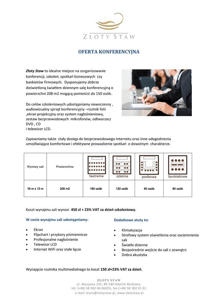 OFERTA KONFERENCYJNA Złoty Staw to idealne miejsce na zorganizowanie konferencji, szkoleń, spotkań biznesowych czy bankietów firmowych. Dysponujemy dobrze doświetloną światłem dziennym salę konferencyjną o powierzchni 208 m2 mogącą pomieścić do 150 osób. Do celów szkoleniowych udostępniamy nowoczesny , audiowizualny sprzęt konferencyjny –rzutnik folii ,ekran projekcyjny oraz system nagłośnieniowy, zestaw bezprzewodowych mikrofonów, odtwarzacz DVD , CD i telewizor LCD. Zapewniamy także stały dostęp do bezprzewodowego Internetu oraz inne udogodnienia umożliwiające komfortowe i efektywne prowadzenie spotkań o dowolnym charakterze. Wymiary sali Powierzchnia 16 m x 13 m 208 m2 180 osób 120 osób 60 osób 80 osób Koszt wynajmu sali wynosi 450 zł + 23% VAT za dzień szkoleniowy. W cenie wynajmu sali udostępniamy: Dodatkowe atuty to: Ekran Flipchart i przybory piśmiennicze Profesjonalne nagłośnienie Telewizor LCD Internet WiFi oraz stałe łącze Klimatyzacja Strefowy system oświetlenia oraz zaciemnienia sali Światło dzienne Bezpośrednie wejście do sali z zewnątrz Dobra akustyka Wynajęcie rzutnika multimedialnego to koszt 150 zł+23% VAT za dzień. ZŁOTY STAW ul. Akacjowa 23C, 80-180 Gdańsk-Borkowo, tel. (+48) 58 302 06 06(05), fax (+48) 58 302 01 01 e-mail: [email protected] , www.zlotystaw.pl Podczas szkoleń i konferencji proponujemy Państwu profesjonalną obsługę cateringową: Przerwa kawowa od 15 zł za osobę Lunch dwudaniowy od 35 zł za osobę Kolacja od 40 zł za osobę Uroczysta kolacja od 80 zł za osobę Posiadamy również komfortowo wyposażone pokoje 1,2,3 i 4 osobowe mogące pomieścić do 30 osób. Wszystkie pokoje są wyposażone w łazienki, telewizję satelitarną, telefon oraz bezprzewodowy Internet. Dla naszych gości serwujemy również śniadanie w formie bufetu przygotowane ze świeżych, smacznych produktów. Rodzaj pokoju Pokój 1 osobowy Pokój 2 osobowy Pokój 3 osobowy *w zależności od liczebności grupy i okresu rezerwacji Cena od 140 zł* od 170 zł* od 210 zł* Cena zawiera podatek VAT oraz wliczone śniadanie Dodatkowo dla naszych gości bezpłatnie udostępniamy monitorowany, obszerny parking dla samochodów osobowych i autokarów. ZAPRASZAMY SERDECZNIE ZŁOTY STAW ul. Akacjowa 23C, 80-180 Gdańsk-Borkowo, tel. (+48) 58 302 06 06(05), fax (+48) 58 302 01 01 e-mail: [email protected] , www.zlotystaw.pl