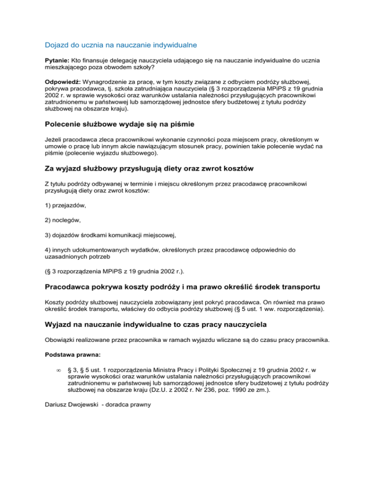 Dojazd do ucznia na nauczanie indywidualne Pytanie: Kto finansuje delegację nauczyciela udającego się na nauczanie indywidualne do ucznia mieszkającego poza obwodem szkoły? Odpowiedź: Wynagrodzenie za pracę, w tym koszty związane z odbyciem podróży służbowej, pokrywa pracodawca, tj. szkoła zatrudniająca nauczyciela (§ 3 rozporządzenia MPiPS z 19 grudnia 2002 r. w sprawie wysokości oraz warunków ustalania należności przysługujących pracownikowi zatrudnionemu w państwowej lub samorządowej jednostce sfery budżetowej z tytułu podróży służbowej na obszarze kraju). Polecenie służbowe wydaje się na piśmie Jeżeli pracodawca zleca pracownikowi wykonanie czynności poza miejscem pracy, określonym w umowie o pracę lub innym akcie nawiązującym stosunek pracy, powinien takie polecenie wydać na piśmie (polecenie wyjazdu służbowego). Za wyjazd służbowy przysługują diety oraz zwrot kosztów Z tytułu podróży odbywanej w terminie i miejscu określonym przez pracodawcę pracownikowi przysługują diety oraz zwrot kosztów: 1) przejazdów, 2) noclegów, 3) dojazdów środkami komunikacji miejscowej, 4) innych udokumentowanych wydatków, określonych przez pracodawcę odpowiednio do uzasadnionych potrzeb (§ 3 rozporządzenia MPiPS z 19 grudnia 2002 r.). Pracodawca pokrywa koszty podróży i ma prawo określić środek transportu Koszty podróży służbowej nauczyciela zobowiązany jest pokryć pracodawca. On również ma prawo określić środek transportu, właściwy do odbycia podróży służbowej (§ 5 ust. 1 ww. rozporządzenia). Wyjazd na nauczanie indywidualne to czas pracy nauczyciela Obowiązki realizowane przez pracownika w ramach wyjazdu wliczane są do czasu pracy pracownika. Podstawa prawna: • § 3, § 5 ust. 1 rozporządzenia Ministra Pracy i Polityki Społecznej z 19 grudnia 2002 r. w sprawie wysokości oraz warunków ustalania należności przysługujących pracownikowi zatrudnionemu w państwowej lub samorządowej jednostce sfery budżetowej z tytułu podróży służbowej na obszarze kraju (Dz.U. z 2002 r. Nr 236, poz. 1990 ze zm.). Dariusz Dwojewski - doradca prawny