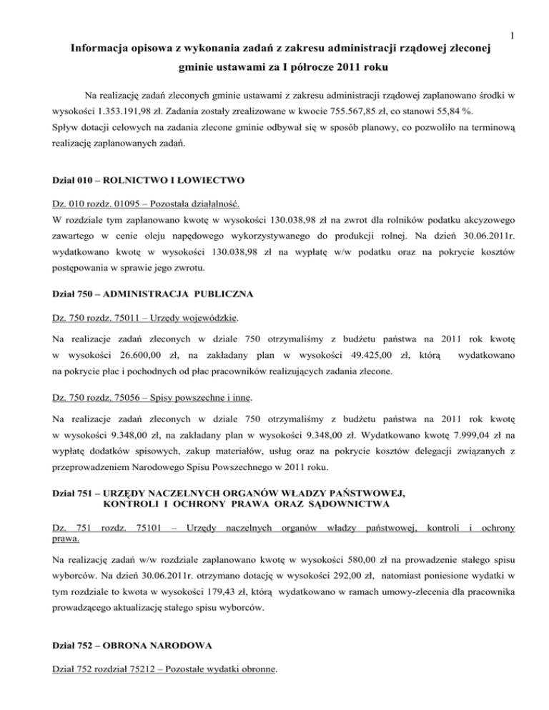 1 Informacja opisowa z wykonania zadań z zakresu administracji rządowej zleconej gminie ustawami za I półrocze 2011 roku Na realizację zadań zleconych gminie ustawami z zakresu administracji rządowej zaplanowano środki w wysokości 1.353.191,98 zł. Zadania zostały zrealizowane w kwocie 755.567,85 zł, co stanowi 55,84 %. Spływ dotacji celowych na zadania zlecone gminie odbywał się w sposób planowy, co pozwoliło na terminową realizację zaplanowanych zadań. Dział 010 – ROLNICTWO I ŁOWIECTWO Dz. 010 rozdz. 01095 – Pozostała działalność. W rozdziale tym zaplanowano kwotę w wysokości 130.038,98 zł na zwrot dla rolników podatku akcyzowego zawartego w cenie oleju napędowego wykorzystywanego do produkcji rolnej. Na dzień 30.06.2011r. wydatkowano kwotę w wysokości 130.038,98 zł na wypłatę w/w podatku oraz na pokrycie kosztów postępowania w sprawie jego zwrotu. Dział 750 – ADMINISTRACJA PUBLICZNA Dz. 750 rozdz. 75011 – Urzędy wojewódzkie. Na realizacje zadań zleconych w dziale 750 otrzymaliśmy z budżetu państwa na 2011 rok kwotę w wysokości 26.600,00 zł, na zakładany plan w wysokości 49.425,00 zł, którą wydatkowano na pokrycie płac i pochodnych od płac pracowników realizujących zadania zlecone. Dz. 750 rozdz. 75056 – Spisy powszechne i inne. Na realizacje zadań zleconych w dziale 750 otrzymaliśmy z budżetu państwa na 2011 rok kwotę w wysokości 9.348,00 zł, na zakładany plan w wysokości 9.348,00 zł. Wydatkowano kwotę 7.999,04 zł na wypłatę dodatków spisowych, zakup materiałów, usług oraz na pokrycie kosztów delegacji związanych z przeprowadzeniem Narodowego Spisu Powszechnego w 2011 roku. Dział 751 – URZĘDY NACZELNYCH ORGANÓW WŁADZY PAŃSTWOWEJ, KONTROLI I OCHRONY PRAWA ORAZ SĄDOWNICTWA Dz. 751 rozdz. 75101 – Urzędy naczelnych organów władzy państwowej, kontroli i ochrony prawa. Na realizację zadań w/w rozdziale zaplanowano kwotę w wysokości 580,00 zł na prowadzenie stałego spisu wyborców. Na dzień 30.06.2011r. otrzymano dotację w wysokości 292,00 zł, natomiast poniesione wydatki w tym rozdziale to kwota w wysokości 179,43 zł, którą wydatkowano w ramach umowy-zlecenia dla pracownika prowadzącego aktualizację stałego spisu wyborców. Dział 752 – OBRONA NARODOWA Dział 752 rozdział 75212 – Pozostałe wydatki obronne. 2 Na pozostałe wydatki obronne otrzymano dotację w wysokości 200,00 zł na zakładany plan w kwocie 200,00 zł. W I półroczu nie wydatkowano dotacji. Realizacja zadania nastąpi w II półroczu 2011 r. Dział 754 – BEZPIECZEŃSTWO PUBLICZNE I OCHRONA PRZECIWPOŻAROWA Dział 754 rozdział 75414 – Obrona cywilna. Na wydatki obronne zaplanowano i wydatkowano kwotę w wysokości 1.000,00 zł , którą przeznaczono na zakup materiałów biurowych niezbędnych do realizacji zadań w zakresie obrony cywilnej. Wydatkowano kwotę 200,49 zł na zakup materiałów. Pełna realizacja wydatku nastąpi w II półroczu 2011 r. Dział 852 – POMOC SPOŁECZNA Na zadania zlecone zaplanowano kwotę w wysokości 1.162.600,00 zł. Na dzień 30.06.2011 r. wszystkie zaplanowane zadania zlecone zrealizowano na ogólną kwotę 590.549,91 zł, co stanowi 50,80 % planu. Realizacja zadań w poszczególnych rozdziałach klasyfikacji budżetowej przedstawia się następująco : Dz. 852 rozdz. 85212 – Świadczenia rodzinne, świadczenia z funduszu alimentacyjnego oraz składki na ubezpieczenia emerytalne i rentowe z ubezpieczenia społecznego. Na dzień 30.06.2011 r. na plan w wysokości 1.160.000,00 zł wydatkowano kwotę 588.958,71 zł, co stanowi 50,77 % planu. budżetowe Środki przeznaczono na wypłaty świadczeń rodzinnych, pielęgnacyjnych, dodatków do zasiłku rodzinnego, składki ZUS, wynagrodzenia i pochodne od wynagrodzeń oraz pozostałe wydatki. Łącznie na świadczenia, na plan w wysokości 1.125.200,00 zł , wydatkowano kwotę 574.099,91 zł. Świadczenia rodzinne z dodatkami – wypłacono 2.995 świadczenia na kwotę 293.005,00 zł, w tym: 1) zasiłki rodzinne – 2011 świadczenia na łączną kwotę 172.445,00 zł, 2) dodatki do zasiłków rodzinnych – 962 świadczenia na łączną w tym z tytułu : a. urodzenia dziecka – 11 świadczeń na łączna kwotę 11.000,00 zł, kwotę 98.560,00 zł b. opieki nad dzieckiem w okresie korzystania z urlopu wychowawczego wypłacono 37 świadczeń na kwotę 14.800,00 zł, c. samotnego wychowywania dziecka – wypłacono 106 świadczeń na kwotę 18.020,00 zł, , – d. kształcenia i rehabilitacji dziecka niepełnosprawnego – wypłacono 80 świadczeń na kwotę 6.160,00 zł, e. podjecie przez dziecko nauki w szkole poza miejscem zamieszkania – wypłacono 374 świadczenia na kwotę 29.920,00 zł, f. wychowywania dziecka w rodzinie wielodzietnej – wypłacono 374 świadczenia na kwotę 22.000,00 zł, 3) jednorazowe zapomogi z tytułu urodzenia dziecka – wypłacono 22 świadczenia na kwotę 22.000,00 zł 4) na świadczenia opiekuńcze wydatkowano kwotę 167.722,90 zł, wypłacono 770 świadczeń, w tym : - zasiłki pielęgnacyjne – 628 świadczeń na kwotę 96.084,00 zł, - świadczenia pielęgnacyjne – 142 świadczenia na kwotę 71.638,90 zł. 3 5) na mocy ustawy o pomocy osobom uprawnionym do alimentów wypłacono fundusz alimentacyjny dla 56 osób na łączna kwotę 102.840,00 zł. 6) na składki na ubezpieczenie emerytalne i rentowe dla osób pobierających świadczenia pielęgnacyjne i dodatek z tytułu samotnego wychowywania i utraty prawa do zasiłku dla bezrobotnych wydatkowano kwotę w wysokości 10.532,01 zł. Opłacono 101 składek. Na wynagrodzenia osobowe wraz z pochodnymi na plan w wysokości 34.500,00 zł wydatkowano kwotę 14.858,80 zł ( 43,06 % planu). Dz. 852 rozdz. 85213 – Składki na ubezpieczenie zdrowotne opłacane za osoby pobierające niektóre świadczenia z pomocy społecznej, niektóre świadczenia rodzinne oraz za osoby uczestniczące w zajęciach w centrum integracji społecznej. Na p