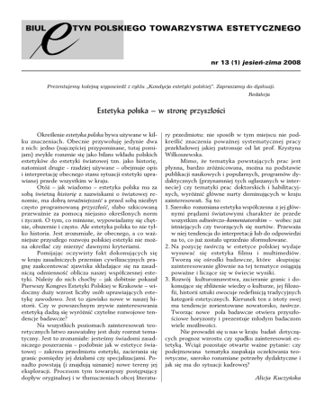 BIUL TYN POLSKIEGO TOWARZYSTWA ESTETYCZNEGO nr 13 (1) jesień−zima 2008 Prezentujemy kolejn¹ wypowiedŸ z cyklu „Kondycja estetyki polskiej”. Zapraszamy do dyskusji. Redakcja Estetyka polska – w stronę przyszłości Określenie estetyka polska bywa używane w kilku znaczeniach. Obecnie przywołuję jedynie dwa z nich: jedno (najczęściej przypominane, tutaj pomijam) zwykle rozumie się jako bilans wkładu polskich estetyków do estetyki światowej tzn. jako historię, natomiast drugie - rzadziej używane – obejmuje opis i interpretację obecnego stanu sytuacji estetyki uprawianej przede wszystkim w kraju. Otóż – jak wiadomo – estetyka polska ma za sobą świetną historię z nazwiskami o światowej renomie, ma dobrą teraźniejszość a przed sobą niezbyt często programowaną przyszłość, słabo szkicowaną przeważnie za pomocą niejasno określonych norm i życzeń. O tym, co minione, wypowiadamy się chętnie, obszernie i często. Ale estetyka polska to nie tylko historia. Jest zrozumiałe, że obecnego, a co ważniejsze przyszłego rozwoju polskiej estetyki nie można określać czy mierzyć dawnymi kryteriami. Pomijając oczywisty fakt dokonujących się w kraju zasadniczych przemian cywilizacyjnych pragnę zaakcentować zjawiska składające się na zasadniczą odmienność oblicza naszej współczesnej estetyki. Należy do nich choćby – jak dobitnie pokazał Pierwszy Kongres Estetyki Polskiej w Krakowie – widoczny duży wzrost liczby osób uprawiających estetykę zawodowo. Jest to zjawisko nowe w naszej historii. Czy w powszechnym zrywie zainteresowania estetyką dadzą się wyróżnić czytelne rozwojowe tendencje badawcze? Na wszystkich poziomach zainteresowań teoretycznych łatwo zauważalny jest duży rozrzut tematyczny. Jest to zrozumiałe: jesteśmy świadomi zasadniczego poszerzenia – podobnie jak w estetyce światowej – zakresu przedmiotu estetyki, zacierania się granic pomiędzy jej działami czy specjalizacjami. Ponadto powstają (i znajdują uznanie) nowe tereny jej eksploracji. Procesom tym towarzyszy postępujący dopływ oryginalnej i w tłumaczeniach obcej literatu- ry przedmiotu: nie sposób w tym miejscu nie podkreślić znaczenia poważnej systematycznej pracy przekładowej jakiej patronuje od lat prof. Krystyna Wilkoszewska. Mimo, że tematyka powstających prac jest płynna, bardzo zróżnicowana, można na podstawie publikacji naukowych i popularnych, programów dydaktycznych (przynamniej tych ogłaszanych w internecie) czy tematyki prac doktorskich i habilitacyjnych, wyróżnić główne nurty dominujących w kraju zainteresowań. Są to: 1. Szeroko rozumiana estetyka współczesna z jej głównymi prądami światowymi charakter że przede wszystkim odtwórczo–komentatorskim – wobec już istniejących czy tworzących się nurtów. Przeważa w niej tendencja do interpretacji lub do odpowiedzi na to, co już zostało uprzednio sformułowane. 2. Na pozycję twórczą w estetyce polskiej wydaje wysuwać się estetyka filmu i multimediów. Tworzą się ośrodki badawcze, które skupiając zainteresowanie głównie na tej tematyce osiągają poważne i liczące się w świecie wyniki. 3. Rozwój kulturoznawstwa, zacieranie granic i dokonujące się zbliżenie wiedzy o kulturze, jej filozofii, historii sztuki owocuje redefinicją tradycyjnych kategorii estetycznych. Kierunek ten z istoty swej ma tendencje zorientowane nowatorsko, twórcze. Tworząc nowe pola badawcze otwiera przyszłościowe horyzonty i prezentuje młodym badaczom wiele możliwości. Nie prowadzi się u nas w kraju badań dotyczących prognoz wzrostu czy spadku zainteresowań estetyką. Wciąż pozostaje otwarte ważne pytanie: czy podejmowana tematyka zaspakaja oczekiwania teoretyczne, szeroko rozumiane potrzeby dydaktyczne i jak się ma do sytuacji kadrowej? Alicja Kuczyńska 1 Prezentujemy kolejny ¿yciorys i dorobek naukowy honorowego cz³onka PTE. Redakcja Profesor Sław Krzemień-Ojak Prof. Sław Krzemień-Ojak nie należy do estetyków typowych. Sam zresztą powtarzał nieraz, i że w ogóle nie jest estetykiem wzorem Władysława Tatarkiewicza (Profesor dodałby tutaj: toute proportion gardée), nie rozwijał własnych poglądów estetycznych lecz interesował się cudzymi. Różnił się jednak od Tatarkiewicza, gdyż uważał się zawsze bardziej za kulturoznawcę i historyka kultury intelektualnej i artystycznej niż za filozofa. Ten kulturoznawczy punkt widzenia dominował wyraźnie w okresach pracy Profesora w placówkach zajmujących się badaniem kultury – w latach 80., kiedy kierował warszawskim Instytutem Kultury, oraz później, od połowy lat 90., kiedy prowadził Zakład Wiedzy o Kulturze w UwB. Również wcześniej, w latach 70., w czasie pracy w Zespole Estetyki Instytutu Filozofii i Socjologii PAN, ów punkt widzenia nadawał swoisty charakter jego różnym pisarskim, edytorskim i organizacyjnym działaniom odnoszącym się do estetyki. Obserwować to można już w jego tezie doktorskiej (1961), w której analizował narodziny socjologicznej estetyki u Hipolita Taine’a. Później, w serii studiów Profesor sprawdzał i poddawał refleksji status estetyki jako nauki antropologicznej, konfrontując jej możliwości poznawcze z naukowymi ambicjami sąsiednich dziedzin kulturoznawczych. Obejmował więc socjologię kultury spojrzeniem estetyka, badał relacje między teorią kultury a estetyką, sprawdzał, jaki jest stosunek moralności i sztuki: łączność, czy antynomia?, badał zależność kryzysu w estetyce od przemian w kulturze, analizował kulturowe prognozy jako problem dla estetyki, itd. Teksty Profesora o tej tematyce nie były liczne, lecz wywoływały dyskusję w kraju i były tłumaczone na wiele języków, m.in. francuski, angielski, bułgarski, serbski i czeski. Najczęściej Profesor podejmował i więcej uwagi poświęcał poglądom estetycznym różnych postaci dawnych i współczesnych. Interesowali go przy tym int