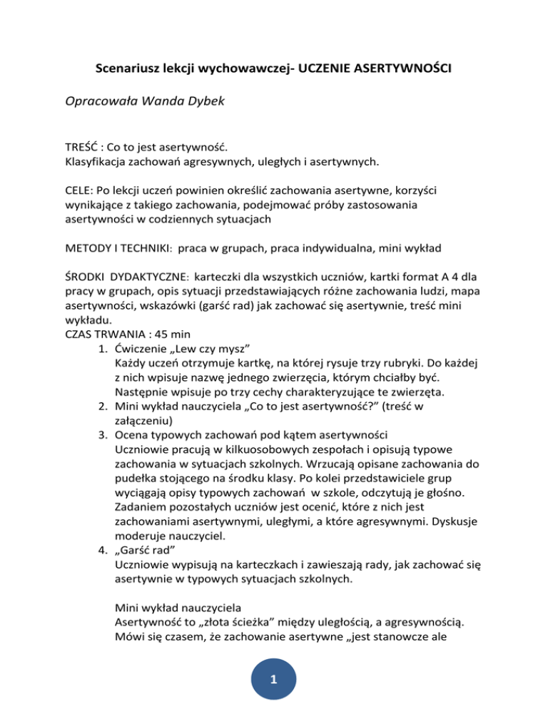 Scenariusz lekcji wychowawczej- UCZENIE ASERTYWNOŚCI Opracowała Wanda Dybek TREŚD : Co to jest asertywnośd. Klasyfikacja zachowao agresywnych, uległych i asertywnych. CELE: Po lekcji uczeo powinien określid zachowania asertywne, korzyści wynikające z takiego zachowania, podejmowad próby zastosowania asertywności w codziennych sytuacjach METODY I TECHNIKI: praca w grupach, praca indywidualna, mini wykład ŚRODKI DYDAKTYCZNE: karteczki dla wszystkich uczniów, kartki format A 4 dla pracy w grupach, opis sytuacji przedstawiających różne zachowania ludzi, mapa asertywności, wskazówki (garśd rad) jak zachowad się asertywnie, treśd mini wykładu. CZAS TRWANIA : 45 min 1. Dwiczenie „Lew czy mysz” Każdy uczeo otrzymuje kartkę, na której rysuje trzy rubryki. Do każdej z nich wpisuje nazwę jednego zwierzęcia, którym chciałby byd. Następnie wpisuje po trzy cechy charakteryzujące te zwierzęta. 2. Mini wykład nauczyciela „Co to jest asertywnośd?” (treśd w załączeniu) 3. Ocena typowych zachowao pod kątem asertywności Uczniowie pracują w kilkuosobowych zespołach i opisują typowe zachowania w sytuacjach szkolnych. Wrzucają opisane zachowania do pudełka stojącego na środku klasy. Po kolei przedstawiciele grup wyciągają opisy typowych zachowao w szkole, odczytują je głośno. Zadaniem pozostałych uczniów jest ocenid, które z nich jest zachowaniami asertywnymi, uległymi, a które agresywnymi. Dyskusje moderuje nauczyciel. 4. „Garśd rad” Uczniowie wypisują na karteczkach i zawieszają rady, jak zachowad się asertywnie w typowych sytuacjach szkolnych. Mini wykład nauczyciela Asertywnośd to „złota ścieżka” między uległością, a agresywnością. Mówi się czasem, że zachowanie asertywne „jest stanowcze ale 1 łagodne”. Nie pozwalam innym ludziom na naruszanie mojego terytorium, na poniżanie mnie, ośmieszanie, lekceważenie, ranienie, krzywdzenie, wykorzystywanie, na naruszanie mojej osobistej godności, czy traktowanie w sposób pozbawiony szacunku; ale też sam staram się nie naruszad cudzego terytorium, szanuję poglądy i uczucia innych ludzi, nawet jeśli są całkowicie odmienne od moich. Asertywnośd nie jest wrodzona. Ludzie nie są po prostu „asertywni lub nie asertywni”. Jest to umiejętnośd, której można się nauczyd, jeśli tylko uznasz, że naprawdę tego chcesz, że ten styl zachowania Ci odpowiada. Można to zrobid za pomocą książek, albo na tak zwanym treningu asertywności, ale największa częśd nauki to nauka dla samego siebie, przy pomocy własnego rozumu. Nie ma uniwersalnego przepisu na to, jak należy zachowad się w danej sytuacji. Każdy człowiek ma swój indywidualny styl bycia sobą. Asertywnośd każdego z nas jest trochę inna, bo inne są nasze reakcje – uczucia, myśli, potrzeby w danej sytuacji. Asertywnośd to kierunkowskaz, jak szukad najwłaściwszego dla siebie postępowania, nie zaś sztywny zestaw najwłaściwszych zachowao. Niektórzy ludzie nie są asertywni, nie są sobą, ponieważ wstydzą się pokazywad ludziom swoje prawdziwe „ja”. Wstydzą się siebie, swoich prawdziwych uczud. A osoba asertywna otwarcie mówi o swoich przeżyciach, o swoim kłopocie. Jest zupełnie naturalne, że człowiek czuje się skrępowany w towarzystwie mało znanych osób. Nie ma w tym nic złego i nie ma powodu, żeby to ukrywad. Jednak wiele osób wstydzi się swoich słabości, stara się za wszelką cenę zachowad twarz, nie przyznaje się do kłopotów. Można powiedzied, że często ludzie nie zachowują się asertywnie, ponieważ chcą byd kimś innym niż są, lub też czują się zbyt słabi w porównaniu z innymi osobami. Wydaje im się, że warunkiem przetrwania w świecie jest sympatia otoczenia, najchętniej aprobata wszystkich ludzi na Ziemi. Czasami ludzie nie zachowują się asertywnie, bo są nieufni. Uważają, że świat jest groźny i wrogi wobec nich, i że warunkiem przetrwania jest odniesienie szybkiego zwycięstwa nad wrogami. Dlatego obrona ma wiele cech ataku. Często naruszają prawa innych ludzi, ranią ich swoim agresywnym zachowaniem, sami jednocześnie nie uzyskując trwale poczucia bezpieczeostwa. Człowiek asertywny to taki, który wierzy w siebie. Jest pewny siebie, ale nie zarozumiały, ani zadufany w sobie. Jego pewnośd siebie jest oparta na przekonaniu, że jest w stanie poradzid sobie nawet w trudnej sytuacji, a jeżeli coś mu się nie powiedzie… cóż, każdy 2 człowiek ma prawo do popełniania błędów. Traktuje samego siebie życzliwie i serdecznie, co oznacza, że nie wstydzi się siebie, nie udaje, że jest inny niż jest, broni samego siebie przed raniącym lub niesprawiedliwym traktowaniem ze strony innych osób. Stanowczo nie pozwala innym na naruszanie swej godności osobistej, jednocześnie w stosunkach z otoczeniem przestrzega zasady fair playnie poniża, nie lekceważy, nie rani, nie oszukuje, nie manipuluje. Nie musi tego robid. To co chce osiągnąd, zdobywa za pomocą asertywnego zachowania. Po czym poznad, czy dane zachowanie jest asertywne? Jeśli masz wątpliwości, czy dane zachowanie jest asertywne, sprawdź, czy chod trochę zwiększa Twój szacunek do samego siebie. Jeżeli tak – jest ono asertywne. Jeżeli nie – nie jest asertywne. Kiedy uczniowie będą już umied rozpoznad zachowanie asertywne od nie asertywnego, dajemy im do rozwiązania testy. Rozwiązując sprawdzają na ile ich własne zachowania są asertywne bądź nie. Ankiety: OBRONA SWOICH PRAW W SYTUACJACH SPOŁECZNYCH NARUSZANIE CUDZEGO TERYTORIUM OBRONA SWOICH PRAW W KONTAKTACH OSOBISTYCH INICJATYWA I KONTAKTY TOWARZYSKIE OCENY- WYRAŻANIE I PRZYJMOWANIE KRYTYKI I POCHWAŁ WYRAŻANIE PRÓŚB WYSTĄPIENIE PUBLICZNE KONTAKT Z AUTORYTETEM WYRAŻANIE UCZUD Klucz- jeśli masz mniej niż 50% na tak/raczej tak – masz dużo jeszcze do zrobienia 3 OBRONA SWOICH PRAW W SYTUACJACH SPOŁECZNYCH 1. Czy zdarza Ci się kupid jedną rzecz, na którą właściwie nie m