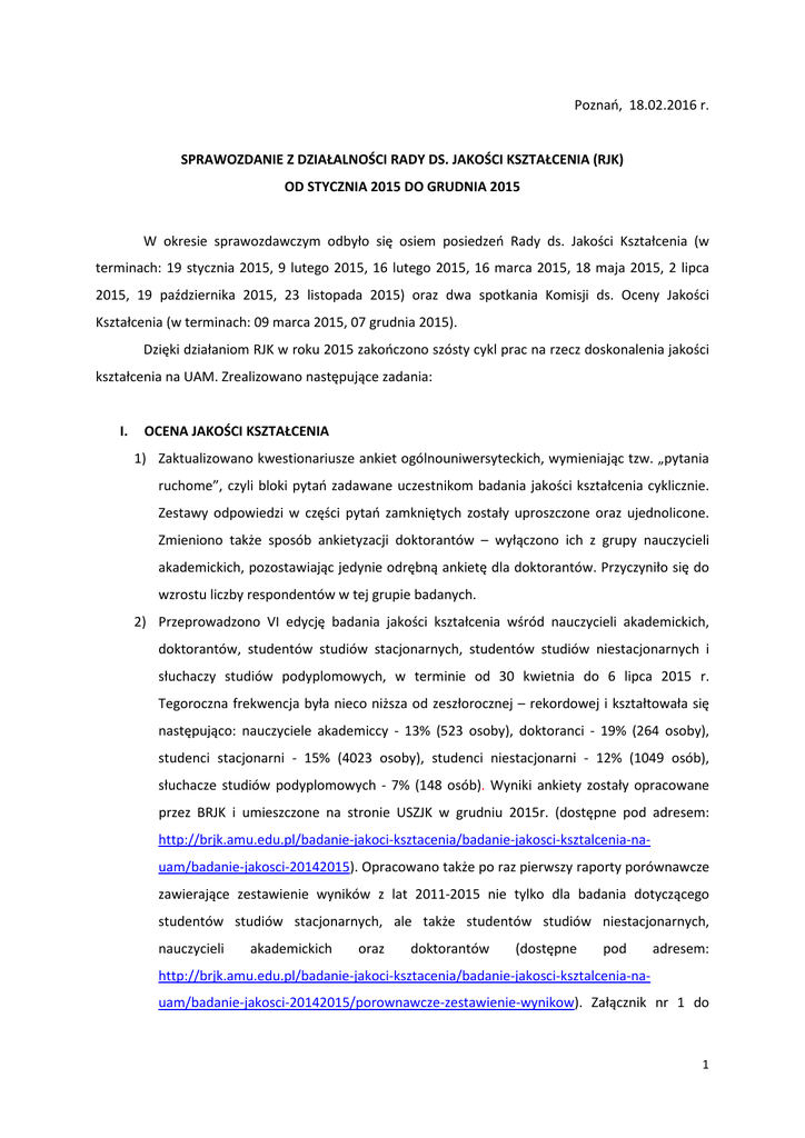 Poznań, 18.02.2016 r. SPRAWOZDANIE Z DZIAŁALNOŚCI RADY DS. JAKOŚCI KSZTAŁCENIA (RJK) OD STYCZNIA 2015 DO GRUDNIA 2015 W okresie sprawozdawczym odbyło się osiem posiedzeń Rady ds. Jakości Kształcenia (w terminach: 19 stycznia 2015, 9 lutego 2015, 16 lutego 2015, 16 marca 2015, 18 maja 2015, 2 lipca 2015, 19 października 2015, 23 listopada 2015) oraz dwa spotkania Komisji ds. Oceny Jakości Kształcenia (w terminach: 09 marca 2015, 07 grudnia 2015). Dzięki działaniom RJK w roku 2015 zakończono szósty cykl prac na rzecz doskonalenia jakości kształcenia na UAM. Zrealizowano następujące zadania: I. OCENA JAKOŚCI KSZTAŁCENIA 1) Zaktualizowano kwestionariusze ankiet ogólnouniwersyteckich, wymieniając tzw. „pytania ruchome”, czyli bloki pytań zadawane uczestnikom badania jakości kształcenia cyklicznie. Zestawy odpowiedzi w części pytań zamkniętych zostały uproszczone oraz ujednolicone. Zmieniono także sposób ankietyzacji doktorantów – wyłączono ich z grupy nauczycieli akademickich, pozostawiając jedynie odrębną ankietę dla doktorantów. Przyczyniło się do wzrostu liczby respondentów w tej grupie badanych. 2) Przeprowadzono VI edycję badania jakości kształcenia wśród nauczycieli akademickich, doktorantów, studentów studiów stacjonarnych, studentów studiów niestacjonarnych i słuchaczy studiów podyplomowych, w terminie od 30 kwietnia do 6 lipca 2015 r. Tegoroczna frekwencja była nieco niższa od zeszłorocznej – rekordowej i kształtowała się następująco: nauczyciele akademiccy - 13% (523 osoby), doktoranci - 19% (264 osoby), studenci stacjonarni - 15% (4023 osoby), studenci niestacjonarni - 12% (1049 osób), słuchacze studiów podyplomowych - 7% (148 osób). Wyniki ankiety zostały opracowane przez BRJK i umieszczone na stronie USZJK w grudniu 2015r. (dostępne pod adresem: http://brjk.amu.edu.pl/badanie-jakoci-ksztacenia/badanie-jakosci-ksztalcenia-nauam/badanie-jakosci-20142015). Opracowano także po raz pierwszy raporty porównawcze zawierające zestawienie wyników z lat 2011-2015 nie tylko dla badania dotyczącego studentów studiów stacjonarnych, ale także studentów studiów niestacjonarnych, nauczycieli akademickich oraz doktorantów (dostępne pod adresem: http://brjk.amu.edu.pl/badanie-jakoci-ksztacenia/badanie-jakosci-ksztalcenia-nauam/badanie-jakosci-20142015/porownawcze-zestawienie-wynikow). Załącznik nr 1 do 1 sprawozdania przedstawia całościowe wnioski z analizy badania opracowane przez Komisję ds. Oceny Jakości Kształcenia i zatwierdzone przez RJK. 3) Koordynowano przeprowadzenie drugiej pełnej edycji wydziałowych badań oceniających zgodność przypisania punktów ECTS z rzeczywistym nakładem pracy studenta. Badania prowadzone są online za pomocą oprogramowania „Cirrus”. 4) We współpracy z Działem Promocji UAM przeprowadzono rozbudowane badanie ankietowe wśród kandydatów na studia UAM na temat m.in. czynników wpływających na wybór uczelni wyższej oraz oczekiwań względem uczelni. II. ZAPEWNIENIE I DOSKONALENIE JAKOŚCI KSZTAŁCENIA 1) Zatwierdzono uproszczony wzór sylabusa przedmiotu dla studiów I i II stopnia oraz jednolitych studiów magisterskich, a także skróconą wersję instrukcji ułatwiającej wypełnienie dokumentu. Opracowano wzór karty przedmiotu (sylabusa) dla studiów doktoranckich. 2) Opracowano projekt Uchwały nr 234/2014/2015 Senatu UAM w sprawie organizacji potwierdzania efektów uczenia się, a także projekt zarządzenia w tym zakresie wraz ze stosownymi wzorami dokumentów, który przeszedł etap konsultacji z dziekanami. 3) Opracowano projekt Zarządzenia Rektora nr 453/2015/2016 z dnia 9 listopada 2015 r. w sprawie badania karier zawodowych absolwentów. 4) Przeprowadzono II edycję konkursu Rektora „Zwiększenie skuteczności realizowania rekomendacji dot. jakości kształcenia w poszczególnych jednostkach”. III. SYSTEM INFORMACYJNY 1) Zaktualizowano i uzupełniono zestaw dokumentacji/procedur dotyczących funkcjonowania wewnętrznego systemu zapewniania jakości kształcenia na poziomie uczelnianym i w poszczególnych jednostkach dla celów oceny instytucjonalnej PKA. Dokument jest przekazywany wydziałom podczas akredytacji. 2) Nawiązano współpracę z Działem Promocji i wspólnie opracowano nową formułę promocji badania jakości kształcenia. 3) Rozbudowano zakładkę na stronie USZJK z dobrymi praktykami w zakresie zarządzania jakością kształcenia na UAM. 2 IV. SPOTKANIA/WYSTĄPIENIA 1) 7.01.2015 dr Agnieszka Kamisznikow wystąpiła z prezentacjami „Potwierdzanie efektów uczenia się” oraz „Wdrożenie procesu potwierdzania efektów uczenia się do instytucji polskiego szkolnictwa wyższego” na Akademii Górniczo-Hutniczej w Krakowie. 2) W dniach 22-23.01.2015 dr Agnieszka Kamisznikow uczestniczyła w warsztatach „Regional Engagement and Doctoral Education” w Marsylii. 3) 11.02.2015 odbyło się spotkanie informacyjno-szkoleniowe prowadzone przez prof. Rafała Móla dla wydziałowych zespołów ds. oceny jakości kształcenia (WZOJK), którego celem było omówienie zadań WZOJK wynikających z uchwały Senatu i zarządzeń Rektora, omówienie oraz ustalenie wytycznych dla szczegółowych planów działań WZOJK, w tym omówienie wydziałowych arkuszy samooceny. Materiały ze spotkania dostępne są na stronie: http://brjk.amu.edu.pl/__data/assets/pdf_file/0003/279156/RJKWZOJK_spotkanie-15-02-11.pdf . 4) Prof. Rafał Mól brał udział w 2 ogólnopolskich seminariach pełnomocników rektorów ds. jakości kształcenia (Lublin 17.04.2015, Kraków 16.11.2015). 5) 11-13.06.2015 dr Agnieszka Kamisznikow wzięła udział w roli eksperta w spotkaniu szkoleniowym dla Wydziału „Artes Liberales” UW „Dydaktyka akademicka w praktyce – od efektów kształcenia dla przedmiotu do zarządzania procesem dydaktycznym”. 6) W dniach 22-26.06.2015 mgr Marta Brzezińska odbyła wizytę na Uniwersytecie Bilgi – Stambuł, której cel