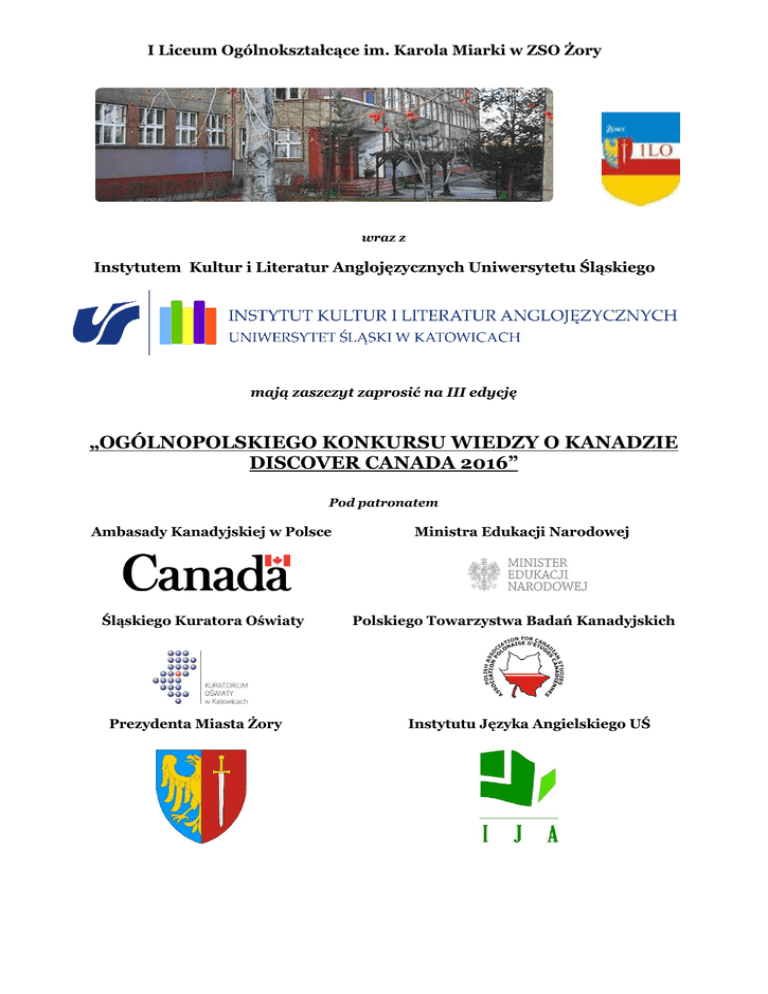 I Liceum Ogólnokształcące im. Karola Miarki w ZSO Żory wraz z Instytutem Kultur i Literatur Anglojęzycznych Uniwersytetu Śląskiego mają zaszczyt zaprosić na III edycję „OGÓLNOPOLSKIEGO KONKURSU WIEDZY O KANADZIE DISCOVER CANADA 2016” Pod patronatem Ambasady Kanadyjskiej w Polsce Śląskiego Kuratora Oświaty Prezydenta Miasta Żory Ministra Edukacji Narodowej Polskiego Towarzystwa Badań Kanadyjskich Instytutu Języka Angielskiego UŚ OGÓLNOPOLSKI KONKURS WIEDZY O KANADZIE DISCOVER CANADA 2016 Zapraszamy Państwa do udziału w III edycji Ogólnopolskiego Konkursu Wiedzy o Kanadzie Discover Canada 2016 Organizatorem III edycji konkursu jest I Liceum Ogólnokształcące w ZSO w Żorach oraz Instytut Kultur i Literatur Anglojęzycznych Uniwersytetu Śląskiego, pod patronatem Ambasady Kanadyjskiej w Polsce, Ministra Edukacji Narodowej, Śląskiego Kuratora Oświaty, Polskiego Towarzystwa Badań Kanadyjskich, Prezydenta Miasta Żory oraz Instytutu Języka Angielskiego UŚ. Konkurs składa się z trzech etapów i kierowany jest do uczniów szkół ponadgimnazjalnych. Zawody szkolne polegają na udzieleniu przez każdego z uczniów odpowiedzi na 110 zamkniętych i otwartych pytań testowych z zakresu znajomości języka angielskiego (50 pytań) oraz szeroko rozumianej wiedzy o Kanadzie (60 pytań). Do drugiego etapu konkursu przechodzi 60 uczestników, którzy w pierwszym etapie otrzymają największą liczbę punktów. Drugi etap odbędzie się na Wydziale Filologicznym Uniwersytetu Śląskiego w Sosnowcu. Uczestnicy piszą test składający się z pytań otwartych oraz pracę pisemną w języku angielskim. Do trzeciego etapu przechodzi maksymalnie 15 uczestników, którzy otrzymali najwyższą ilość punktów w II etapie. Finał odbędzie się w Żorach w obecności przedstawiciela Ambasady Kanadyjskiej, Prezydenta Miasta Żory, przedstawicieli Uniwersytetu Śląskiego oraz sponsorów i publiczności. Finał będzie się składał z dwóch części egzaminu ustnego i przedstawienia 10 minutowej prezentacji multimedialnej przed Komisją konkursową w skład której będą wchodzili pracownicy naukowi Instytutu Kultur i Literatur Anglojęzycznych Uniwersytetu Śląskiego oraz przedstawiciel Polskiego Towarzystwa Badań Kanadyjskich. Na zwycięzców czekają !!!! I miejsce - nagroda pieniężna w wysokości 3000 zł oraz indeks na Filologię Angielską UŚ II miejsce - nagroda pieniężna w wysokości 2000 zł oraz indeks na Filologię Angielską UŚ III miejsce - nagroda pieniężna w wysokości 1000 zł oraz indeks na Filologię Angielską UŚ IV miejsce - indeks na Filologię Angielską UŚ V miejsce - indeks na Filologię Angielską UŚ Laureaci zostają przyjęci na studia po zdaniu matury, z pominięciem całego postępowania kwalifikacyjnego, w Instytucie Kultur i Literatur Anglojęzycznych lub w Instytucie Języka Angielskiego Uniwersytetu Śląskiego. Wszelkie dodatkowe informacje wraz z zakresem materiału na poszczególne etapy konkursu znajdziecie Państwo na naszej stronie internetowej www.mt-oka.pl Tam też będą mieli państwo możliwość rejestracji uczniów w terminie do 16.10.2015 DISCOVER CANADA WITH US ! W razie dodatkowych pytań lub wątpliwość prosimy o kontakt: w sprawach organizacyjnych Pani Beata Pasierbek [email protected] lub merytorycznych Pani dr hab. Eugenia Sojka [email protected] albo pod numerem telefonu I Liceum Ogólnokształcącego w Żorach – pytając o Panią Beatę Pasierbek (032) 43-42-933.